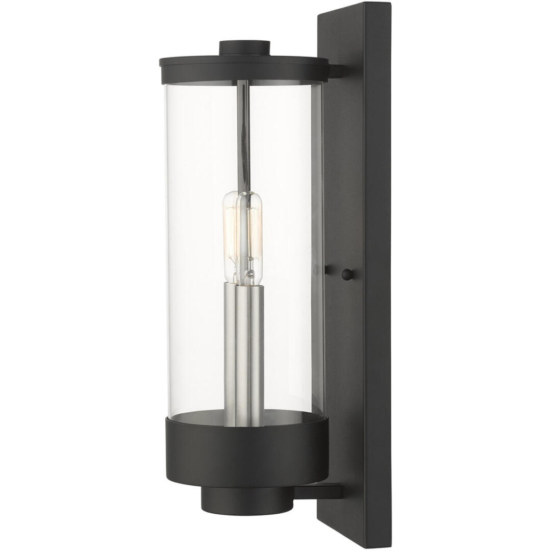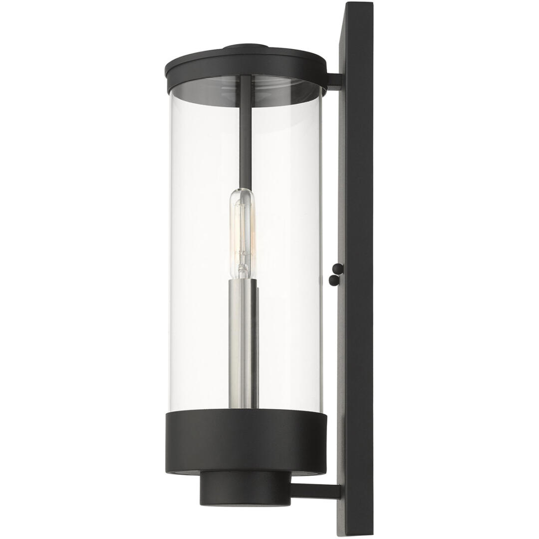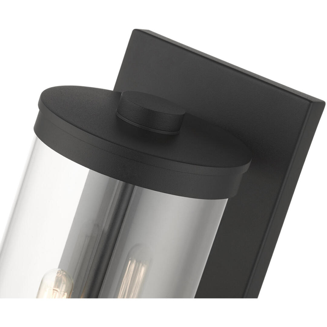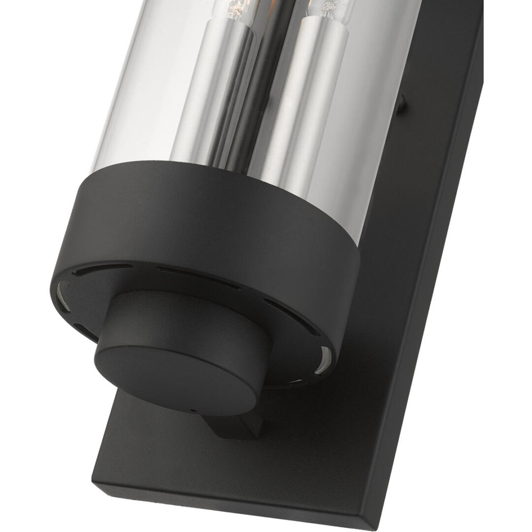 The medium two-light outdoor hand crafted wall lantern from the Hillcrest collection is made of rugged stainless-steel and features a simple yet elegant textured black finish frame paired with a closed top clear glass shade and is accented by brushed nickel candles. The glass shade is topped off with a textured black ring accent to carry through the theme of the finely crafted design. Use indoors or outdoors, this piece complements modern, nautical, contemporary or urban homes.