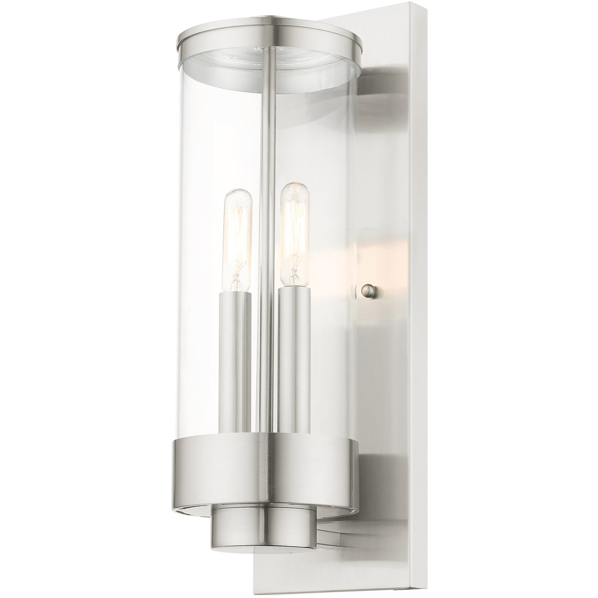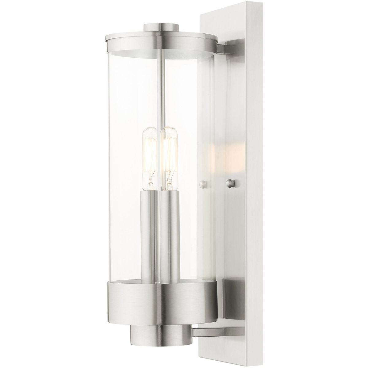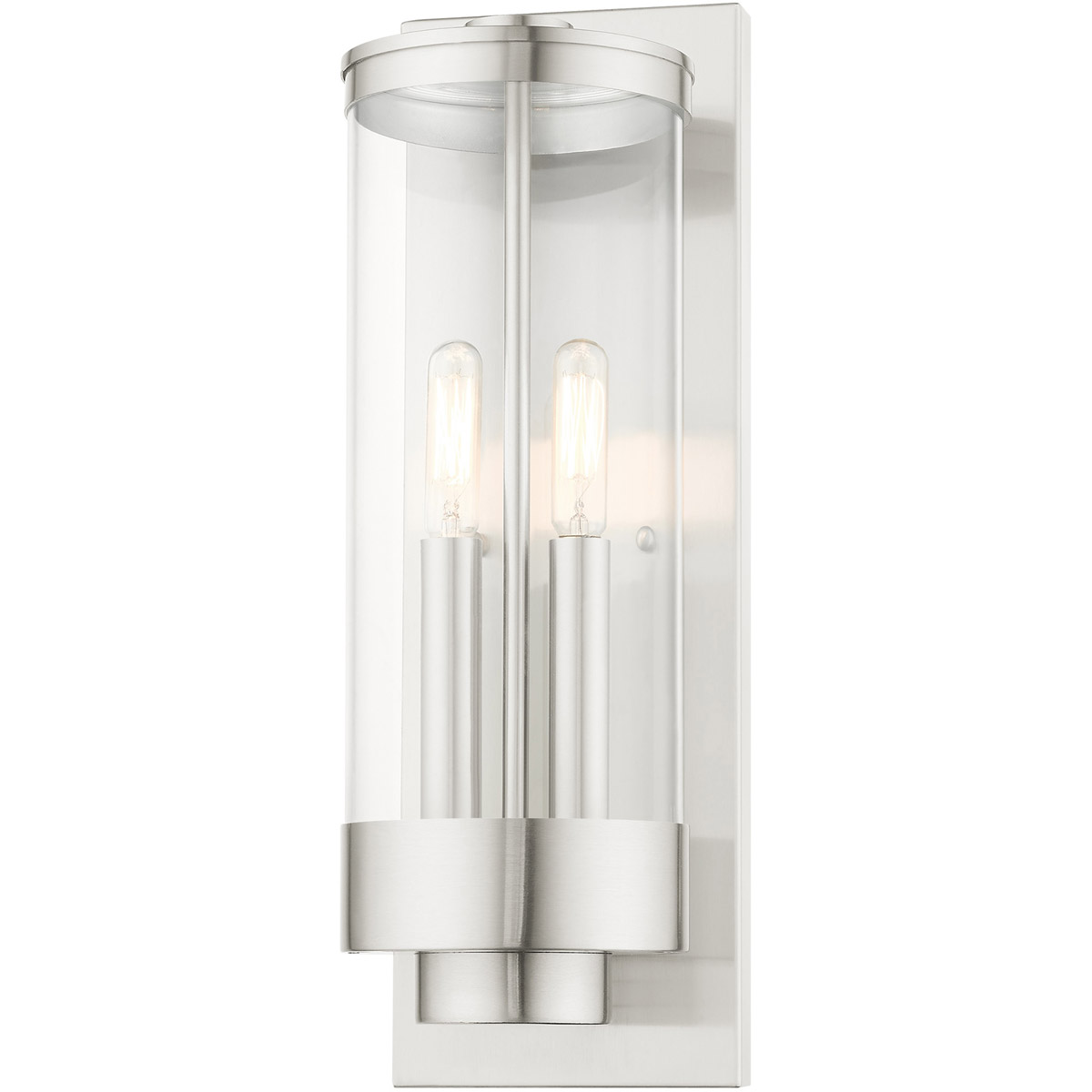 The two light outdoor wall lantern from the Hillcrest collection made of rugged stainless steel features a simple elegant brushed nickel frame paired with closed top clear glass shade. The shade is accented with a banded brushed nickel ring to carry through the theme of finely crafted metal fittings.