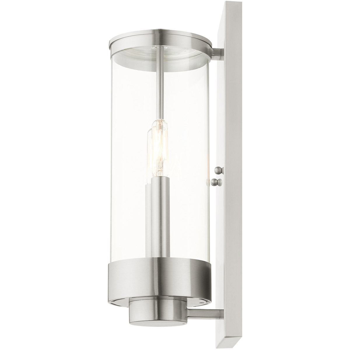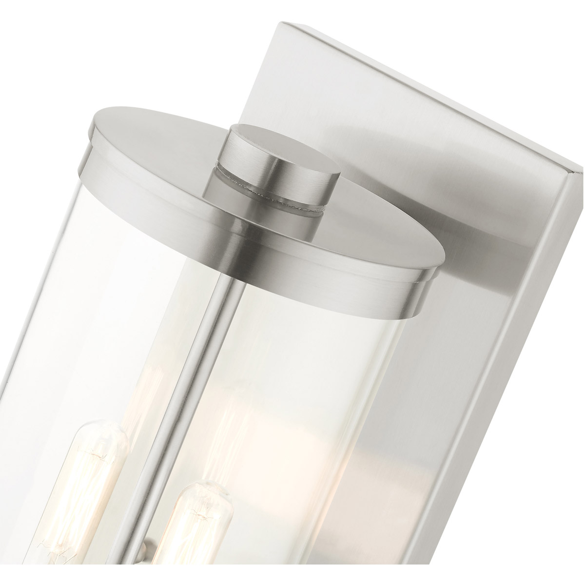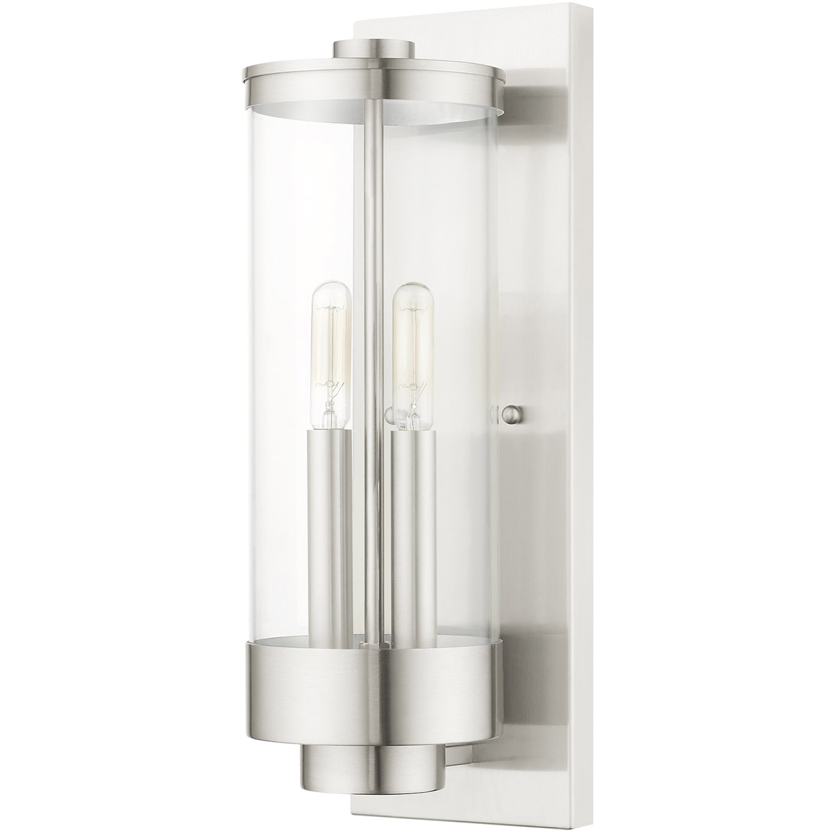 The two light outdoor wall lantern from the Hillcrest collection made of rugged stainless steel features a simple elegant brushed nickel frame paired with closed top clear glass shade. The shade is accented with a banded brushed nickel ring to carry through the theme of finely crafted metal fittings.