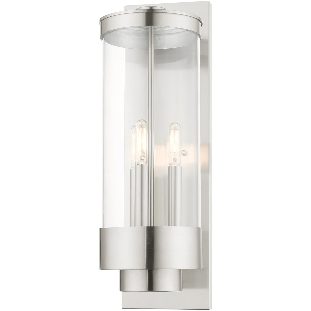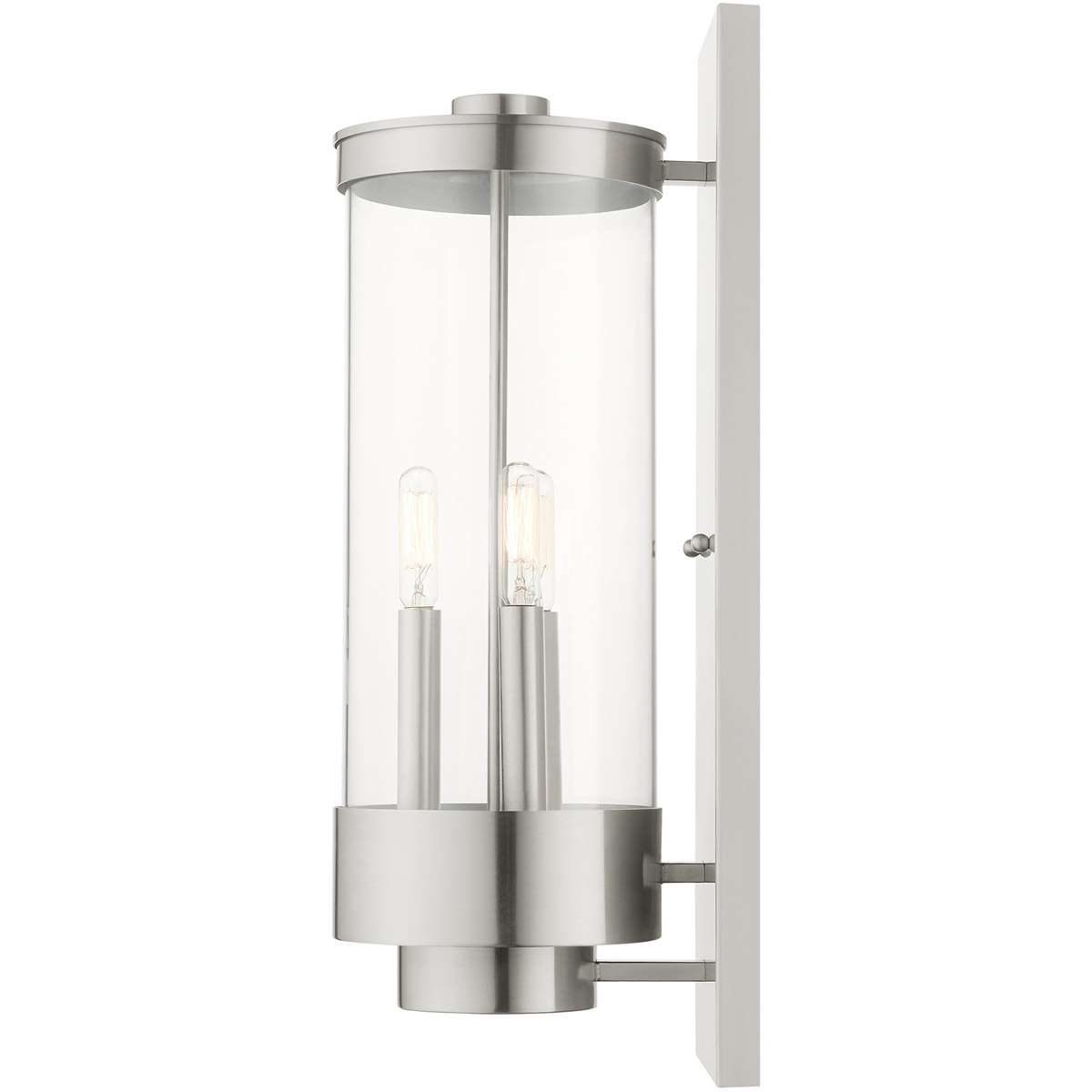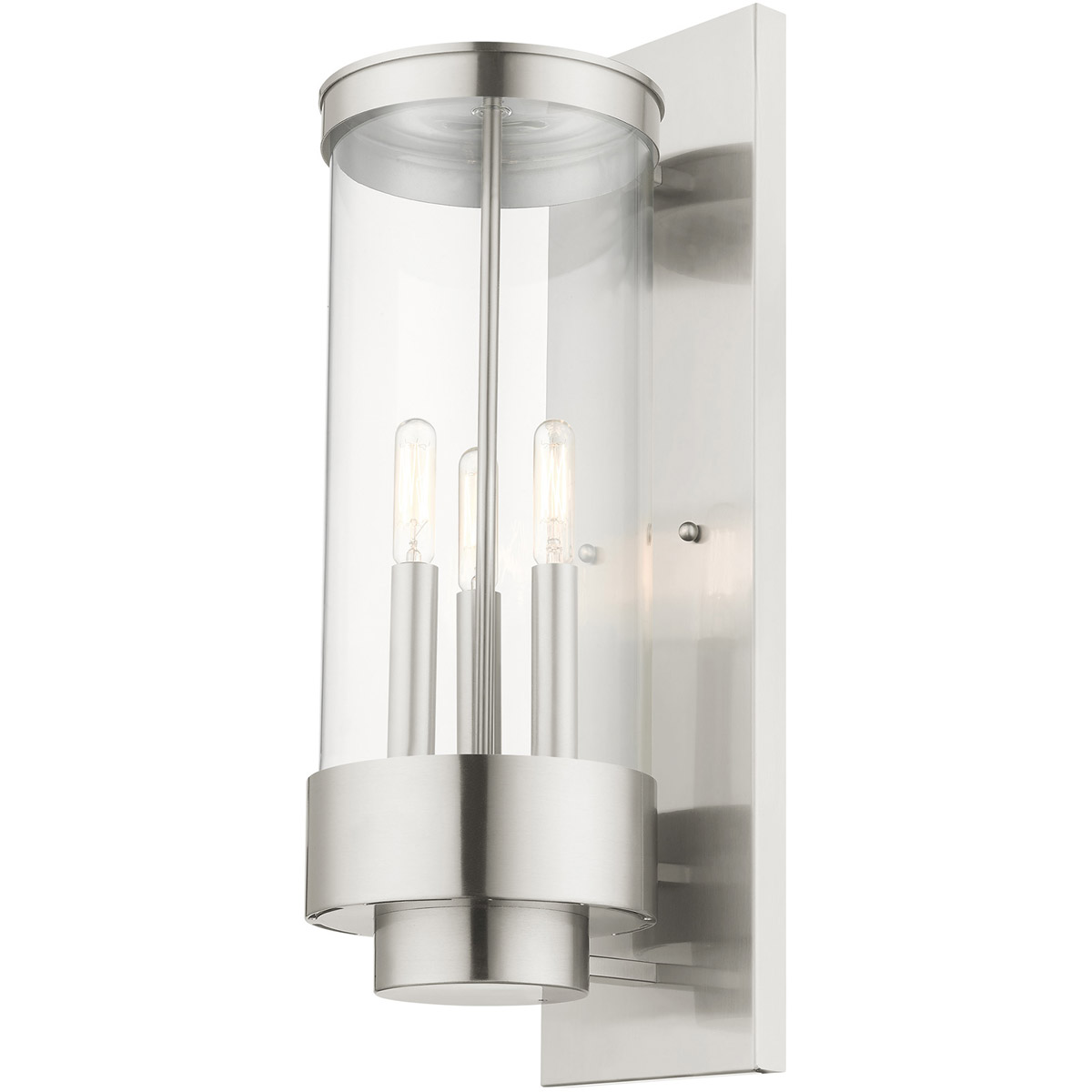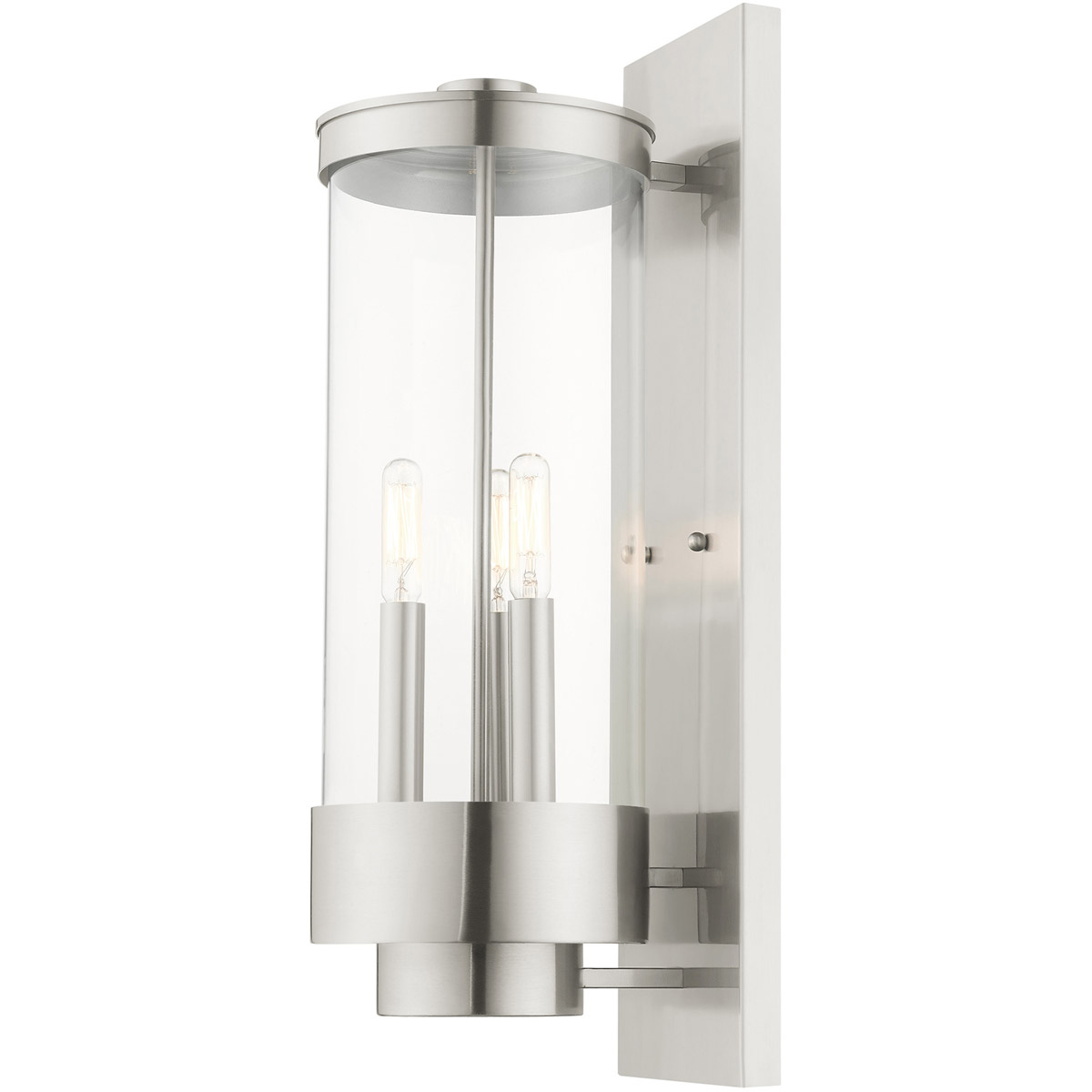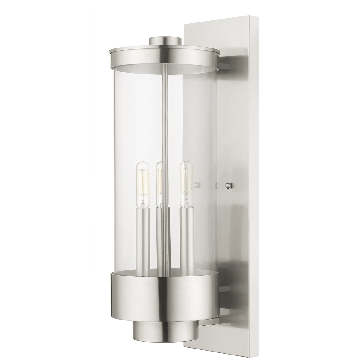 The three light outdoor wall lantern from the Hillcrest collection made of rugged stainless steel features a simple elegant brushed nickel frame paired with closed top clear glass shade. The shade is accented with a banded brushed nickel ring to carry through the theme of finely crafted metal fittings.