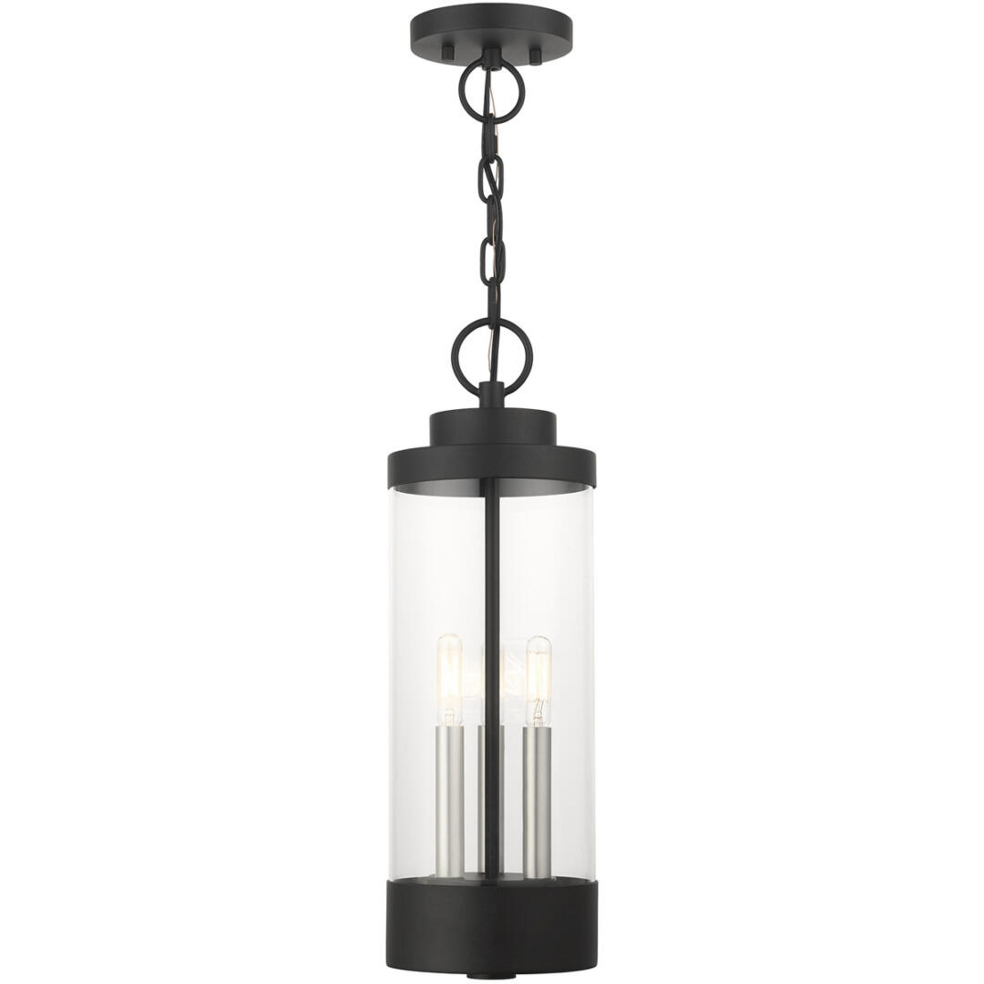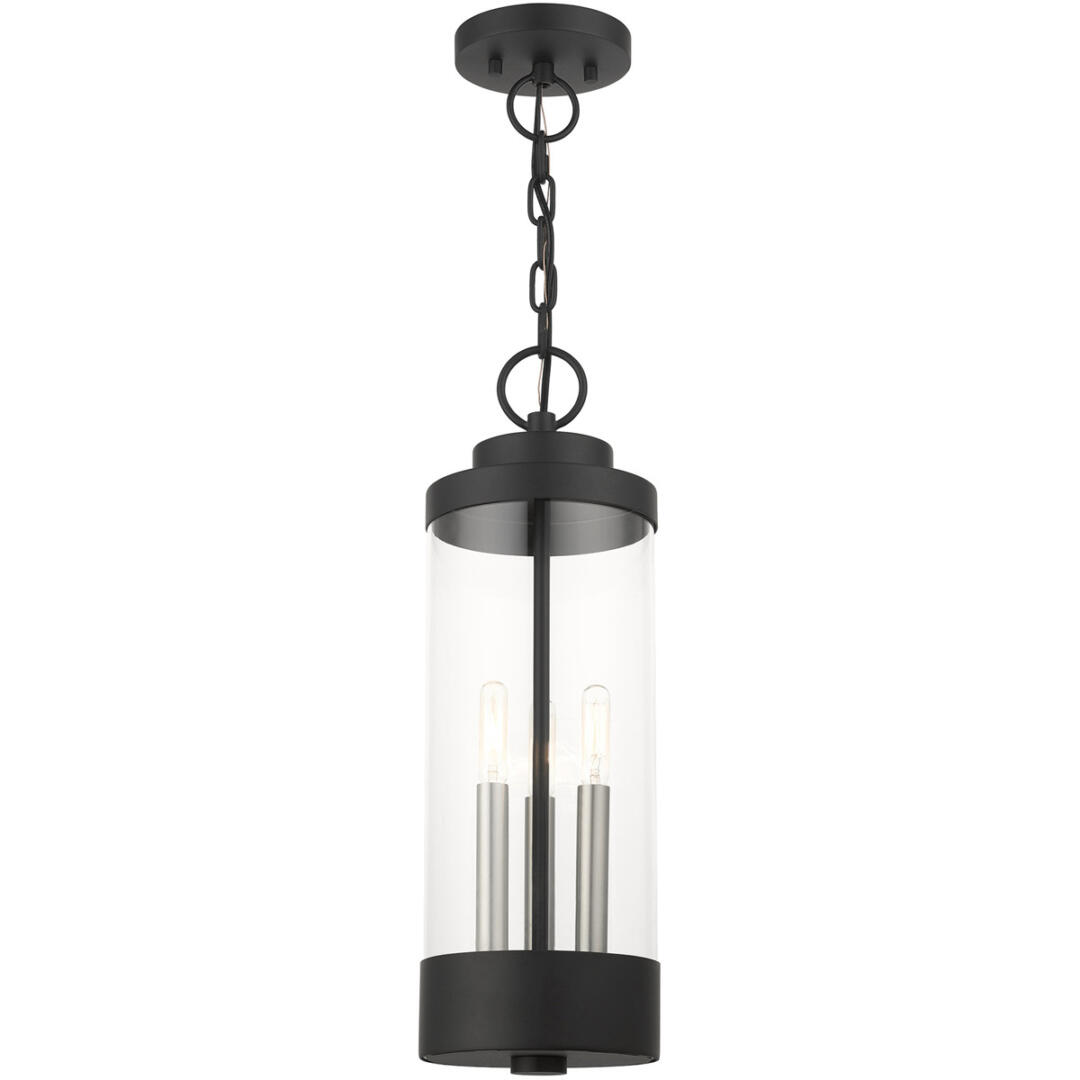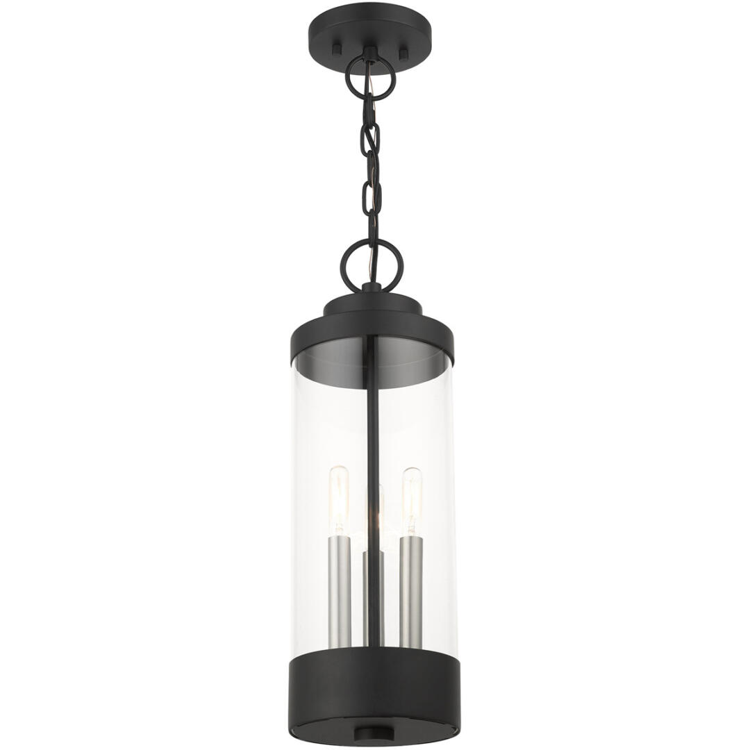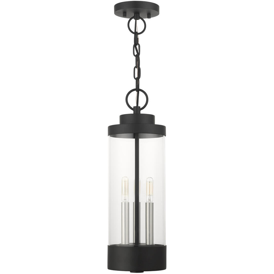 The large three-light outdoor hand crafted pendant lantern from the Hillcrest collection is made of rugged stainless-steel and features a simple yet elegant textured black finish frame paired with a cylindrical clear glass shade and is accented by brushed nickel candles. The fixture is complemented by the chain and its clean rounded canopy to carry through the theme of the finely crafted design. Use indoors or outdoors, this piece complements modern, nautical, contemporary or urban homes.