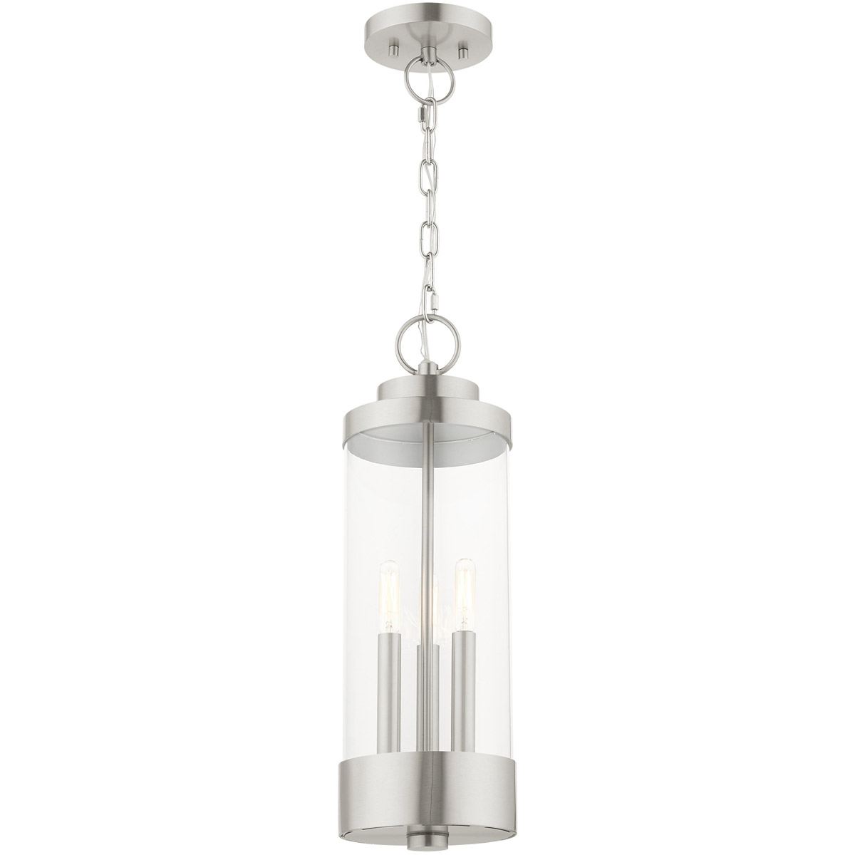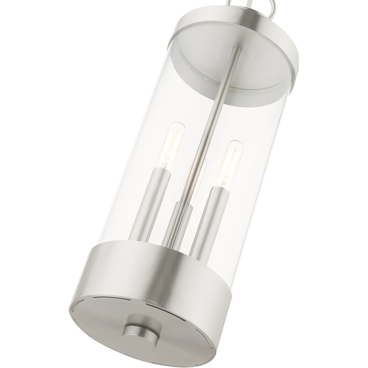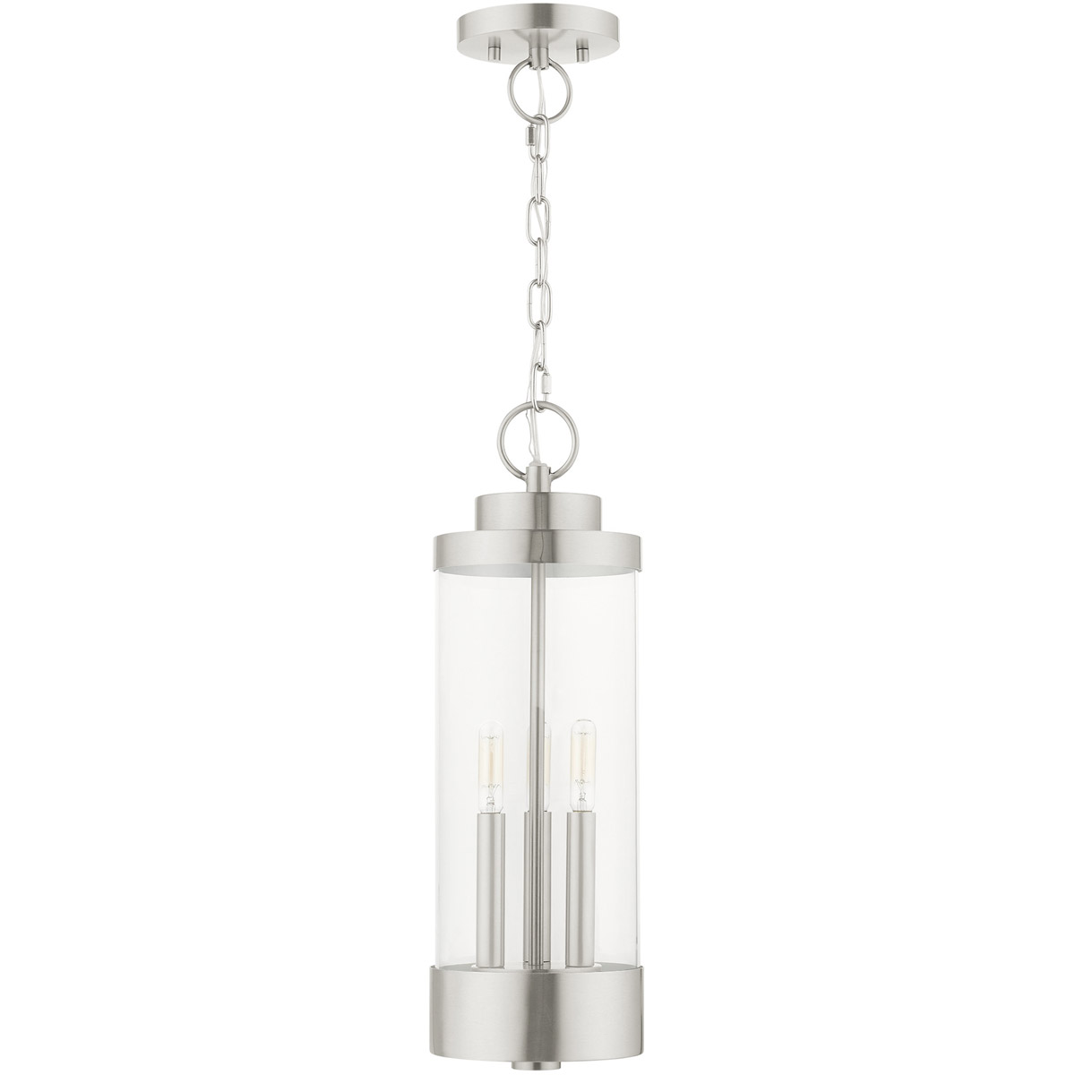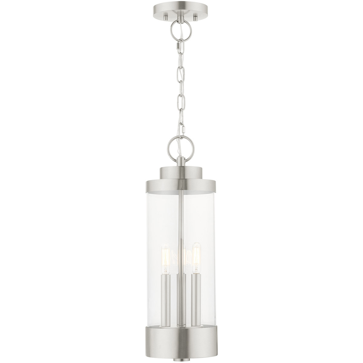 The three light outdoor pendant lantern from the Hillcrest collection made of rugged stainless steel features a simple elegant brushed nickel frame paired with closed top clear glass shade. The shade is accented with a banded brushed nickel ring to carry through the theme of finely crafted metal fittings.