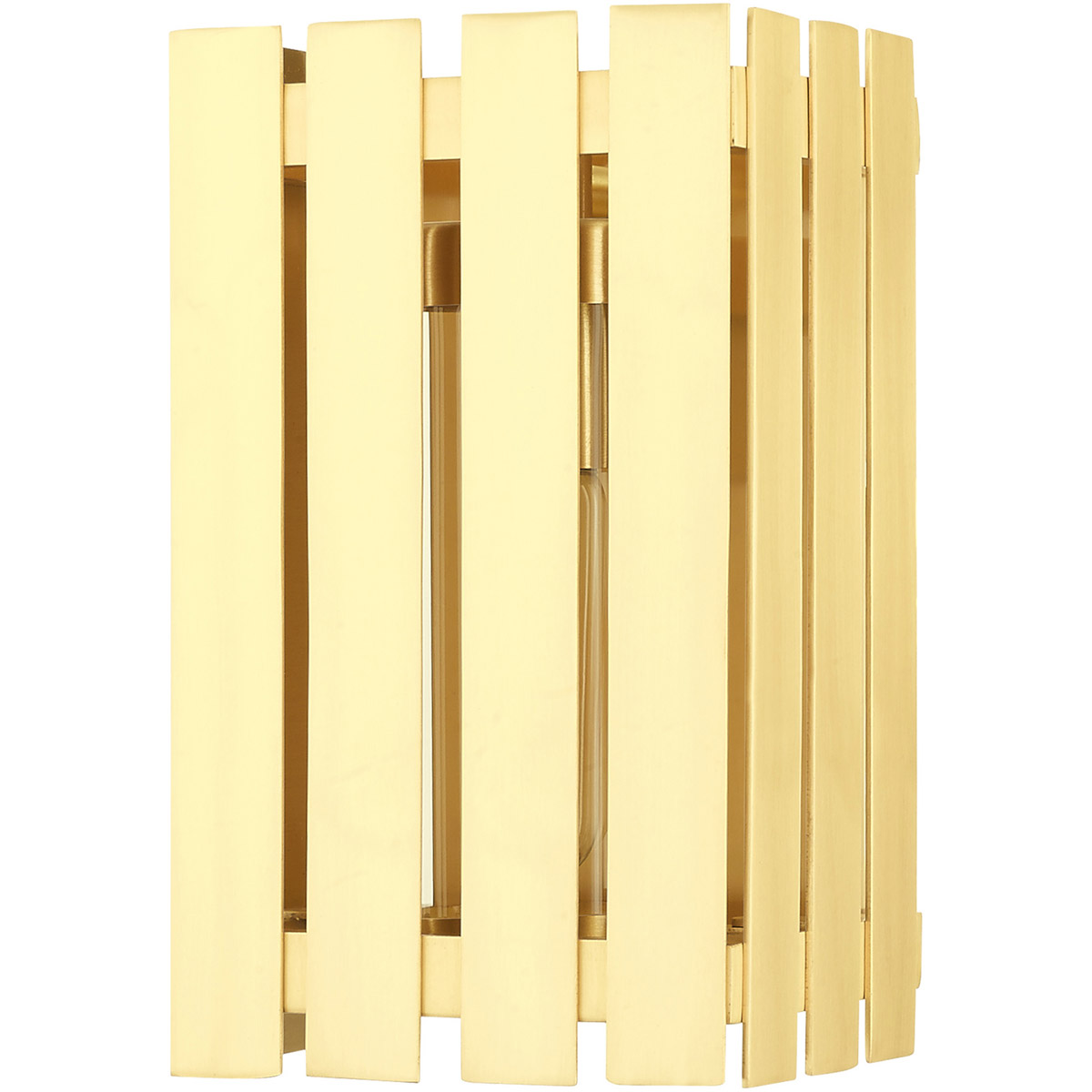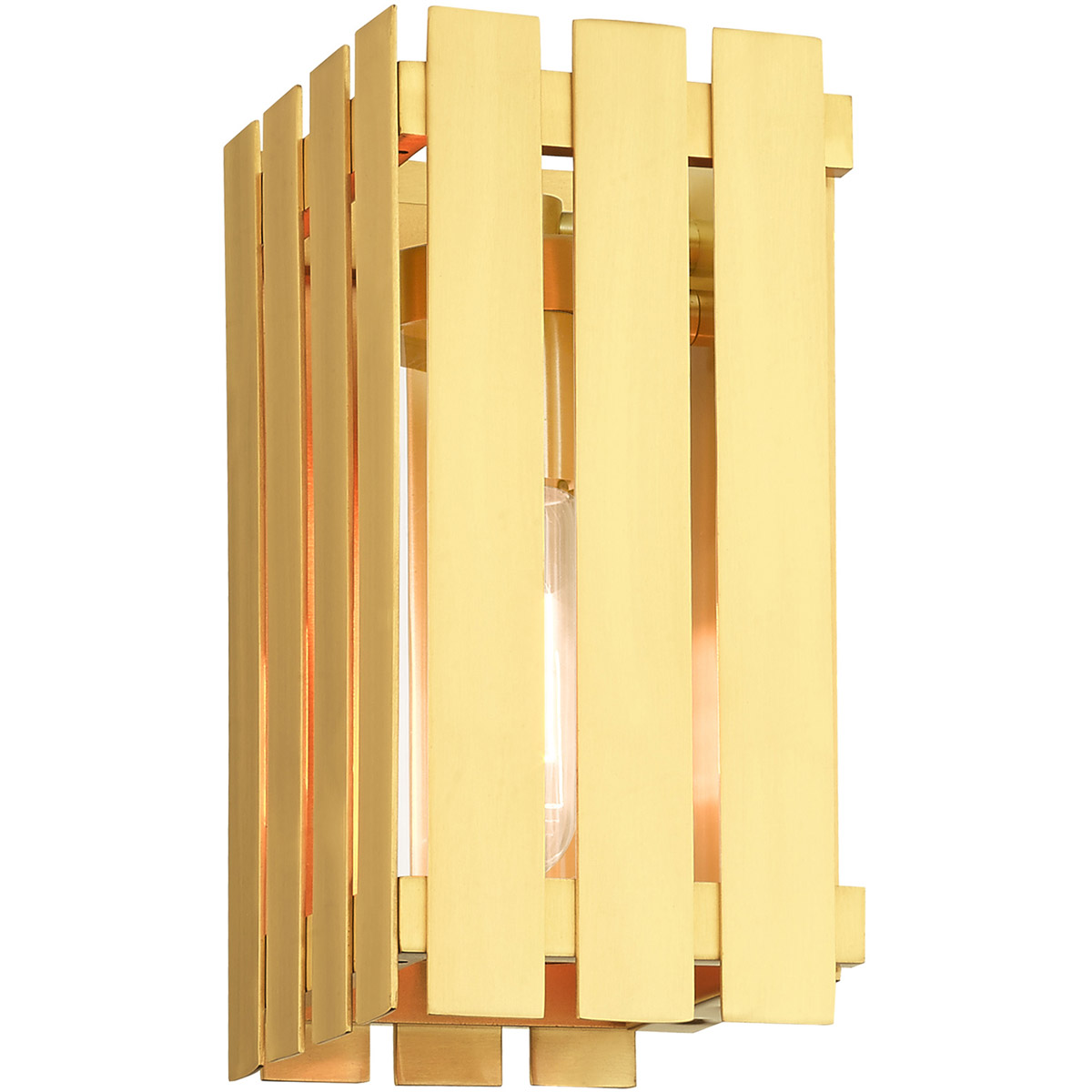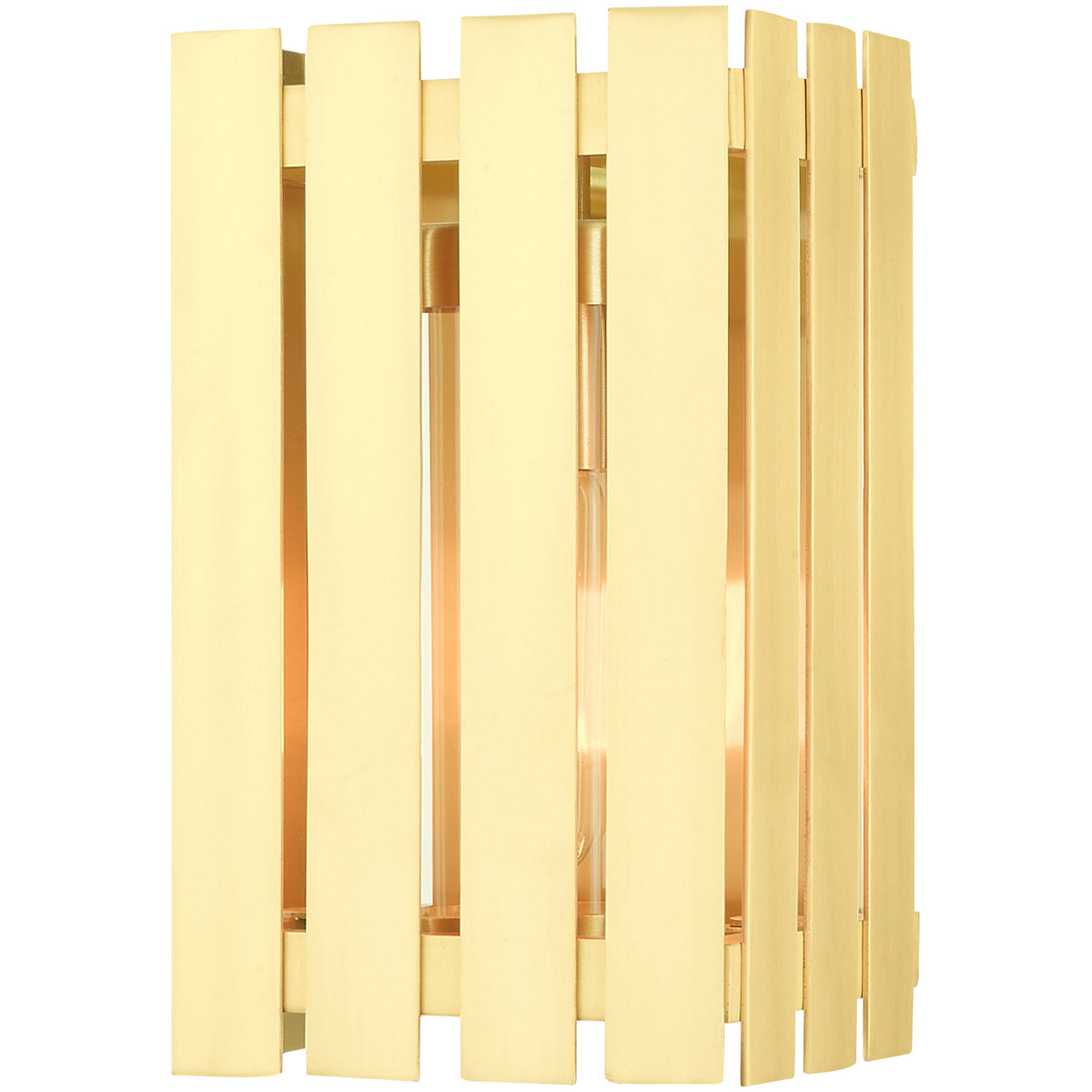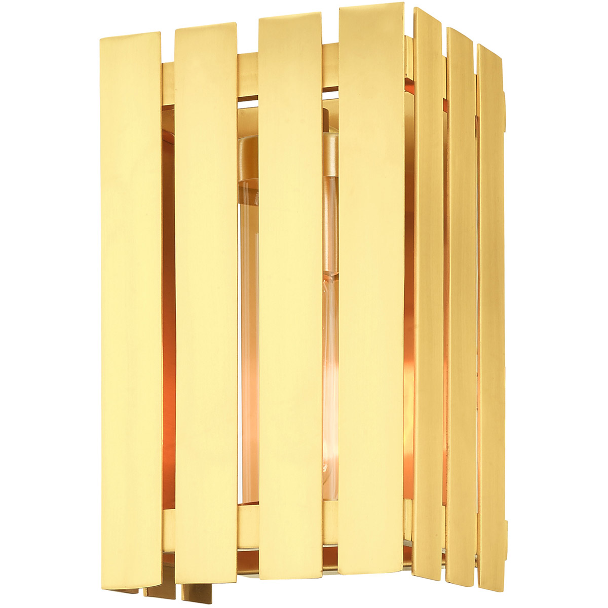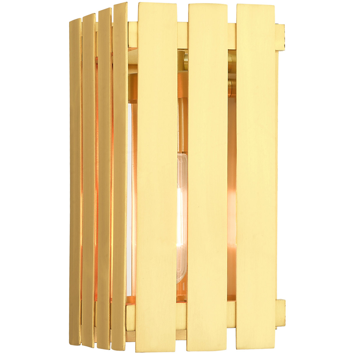 The Greenwich is defined by its bold geometric design and luxe satin brass finish. The solid brass outdoor wall lantern features a clear glass cylinder under the striking cut-out design. Light shines from the top and bottom, as well as from the open areas of the design in the middle. An elegant sculptural look for your front entryway or outdoor living spaces.