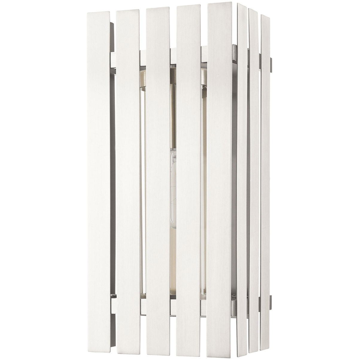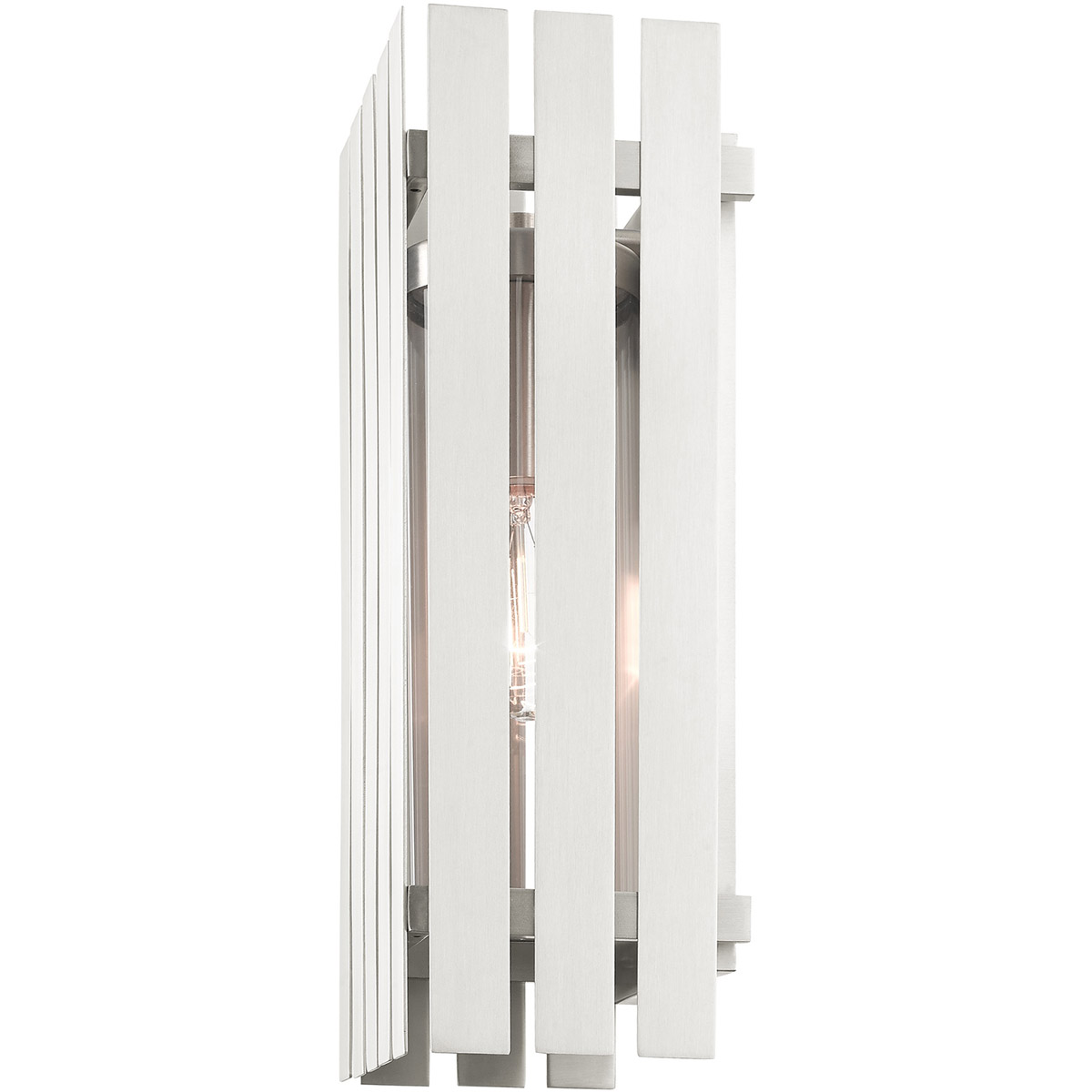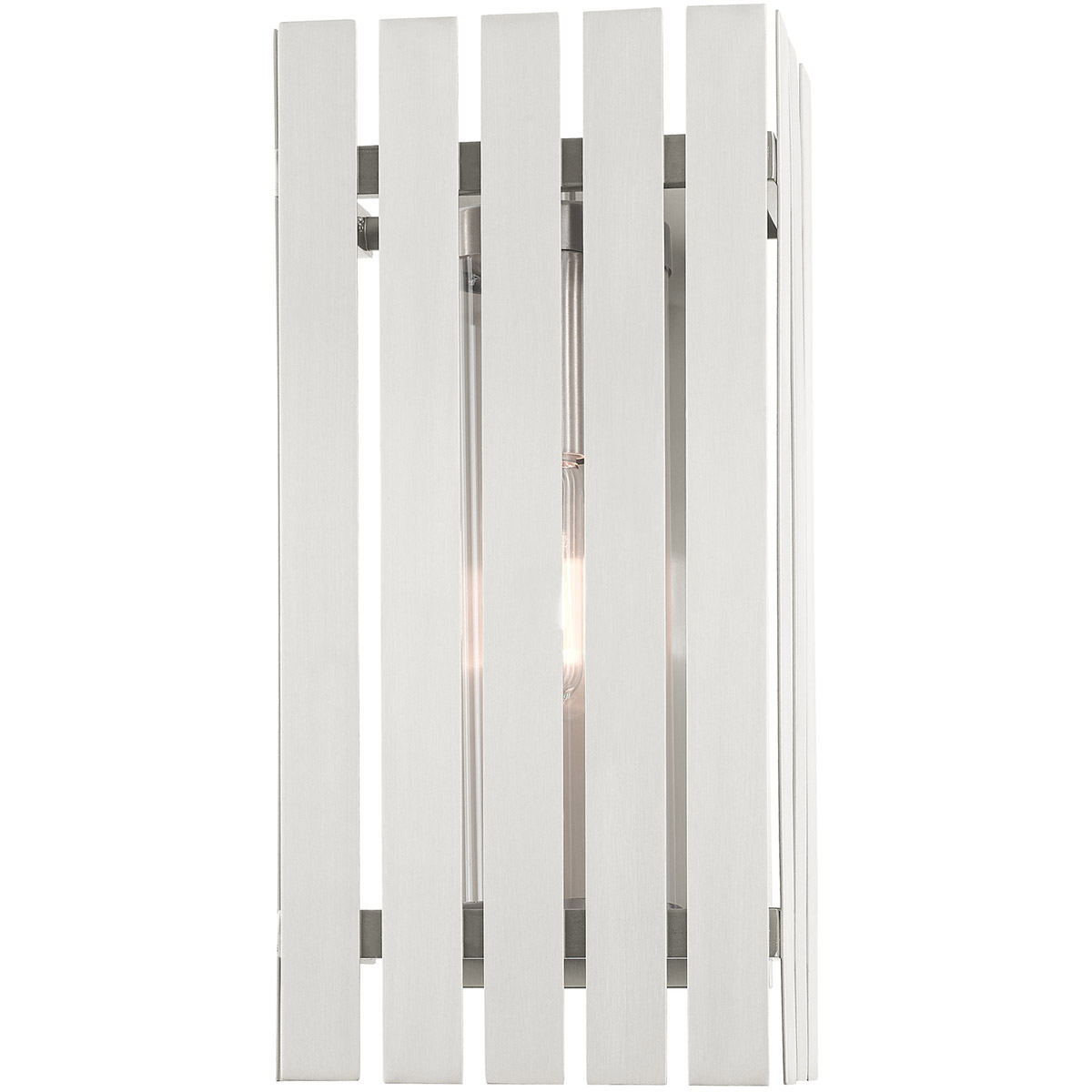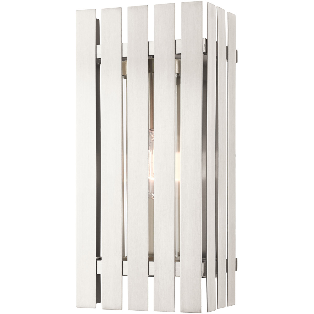 The Greenwich is defined by its bold geometric design and brushed nickel finish. The solid brass outdoor wall lantern features a clear glass cylinder under the striking cut-out design. Light shines from the top and bottom, as well as from the open areas of the design in the middle. An elegant sculptural look for your front entryway or outdoor living spaces.