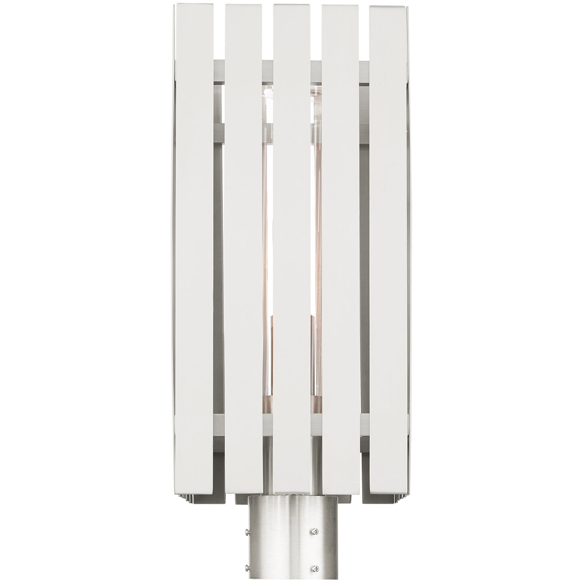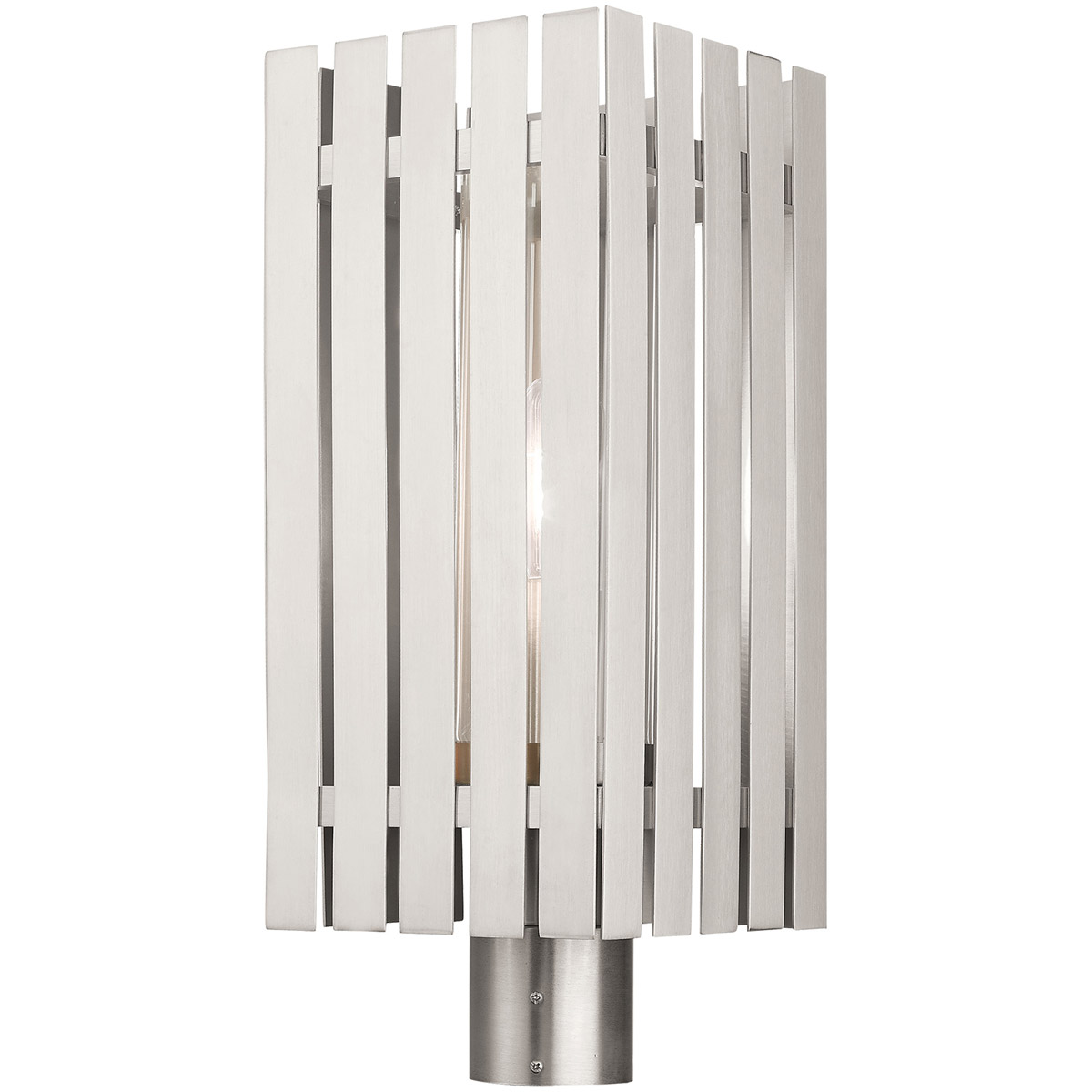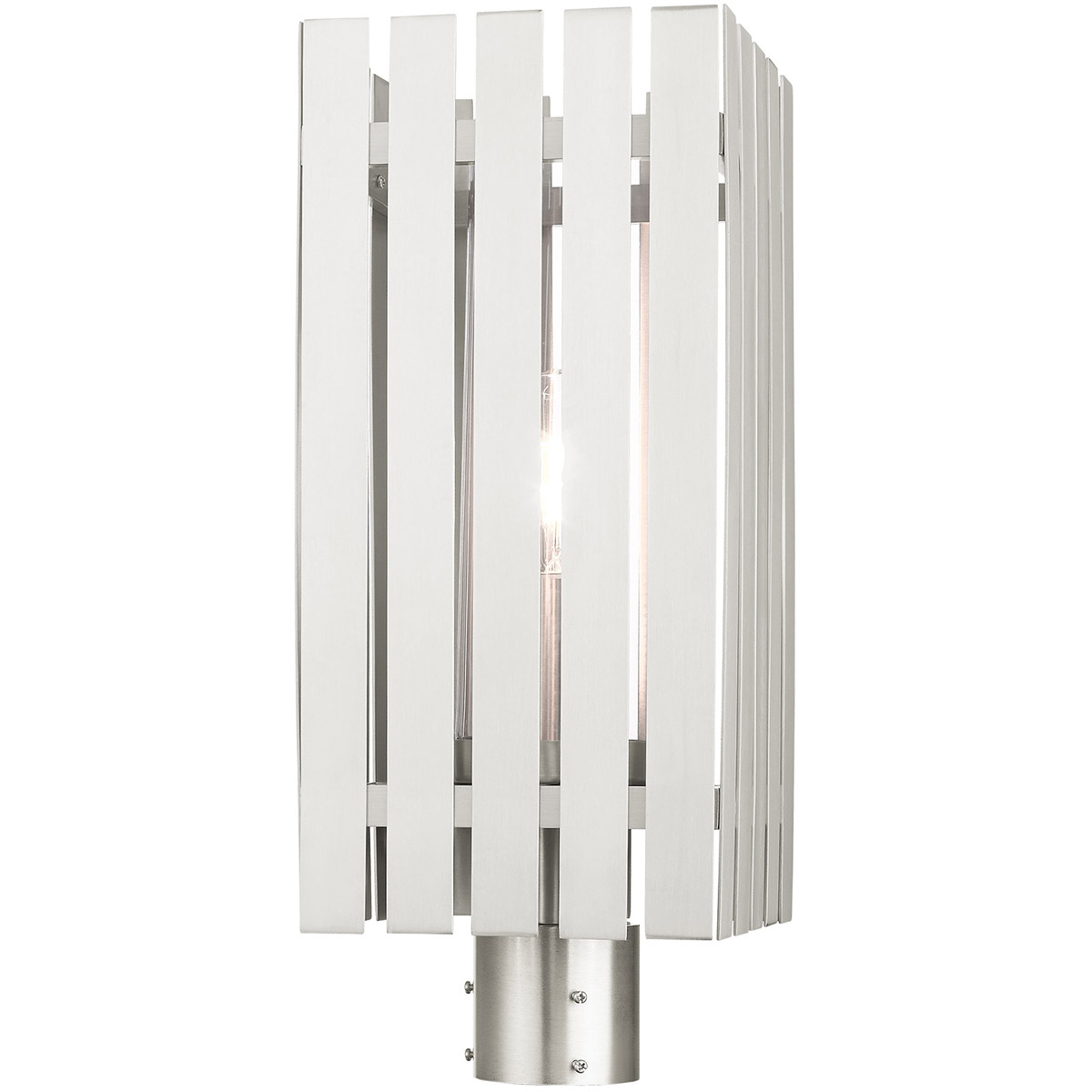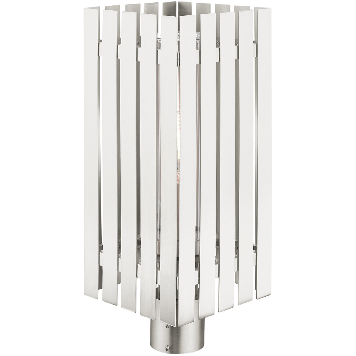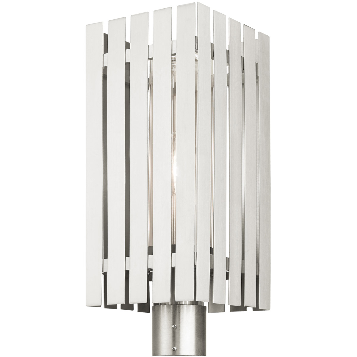 The Greenwich is defined by its bold geometric design and brushed nickel finish. The solid brass outdoor post top lantern features a clear glass cylinder under the striking cut-out design. Light shines from the top, as well as from the open areas of the design in the middle. An elegant sculptural look for your front entryway or backyard.