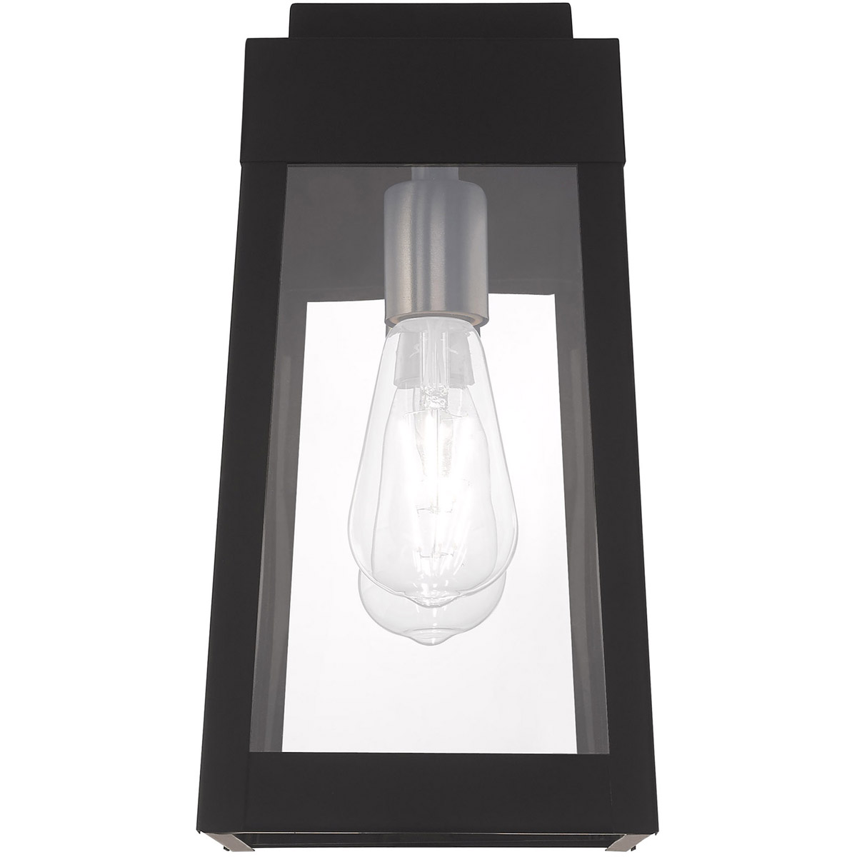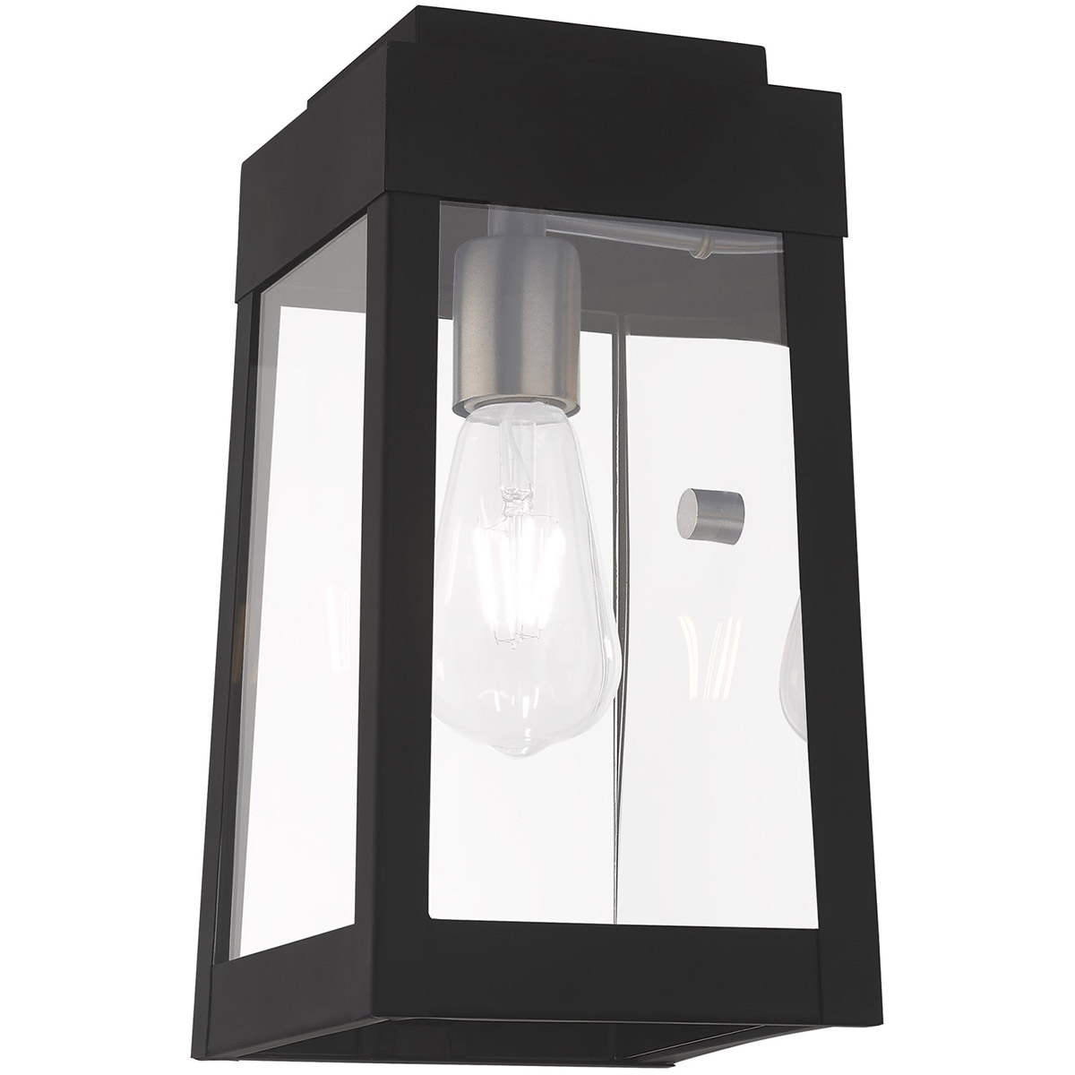 This updated industrial design comes in a tapering solid brass black frame with a sleek, straight-lined look. Clear glass panels offer a full view of the brushed nickel accents, that will house the bulb of your choice.