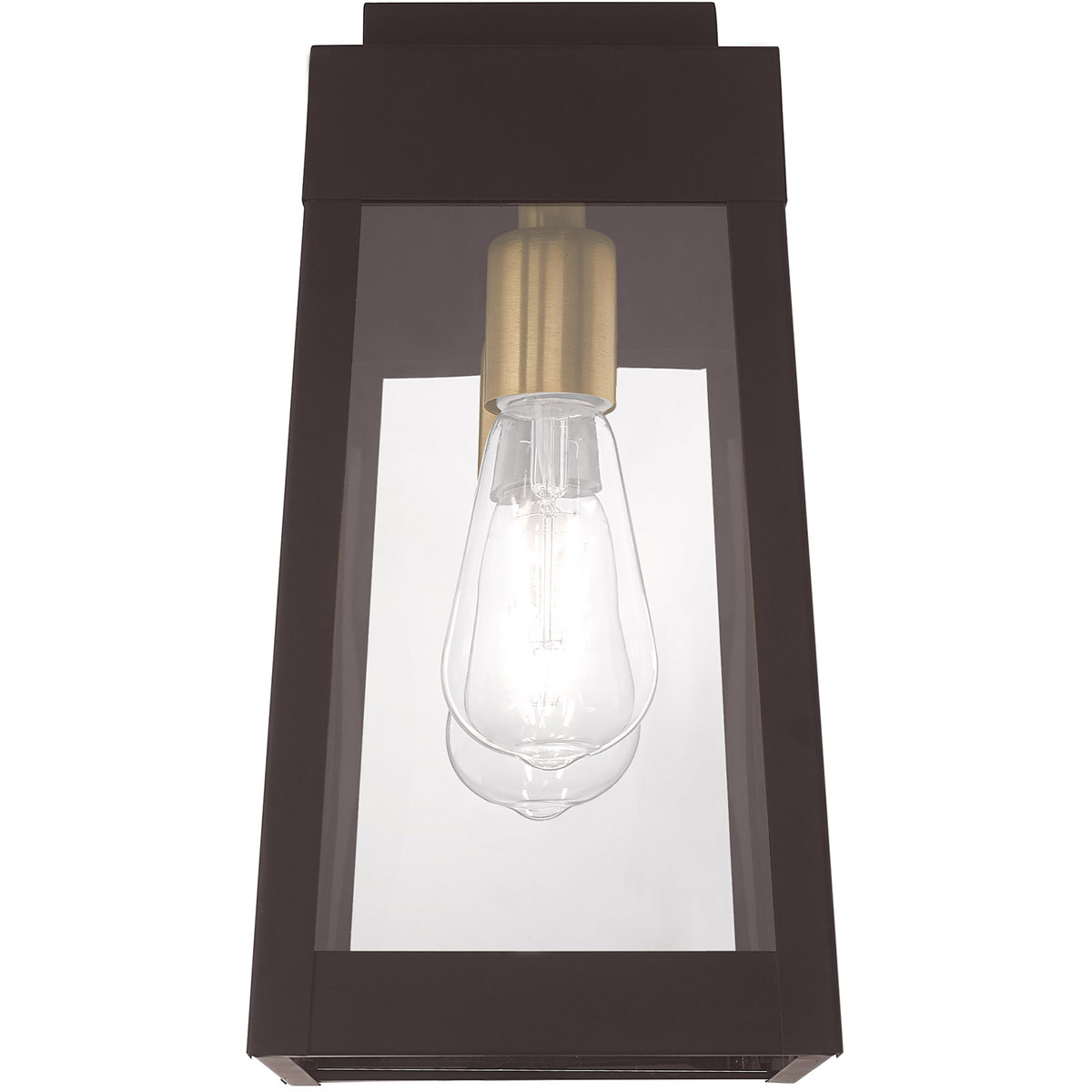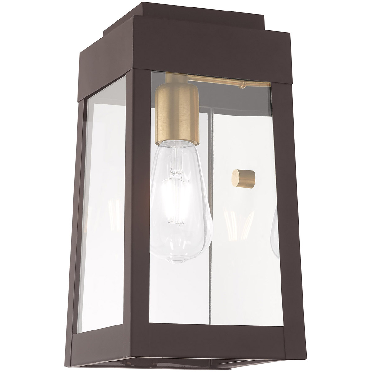 This updated industrial design comes in a tapering solid brass bronze frame with a sleek, straight-lined look and features clear glass panels.
