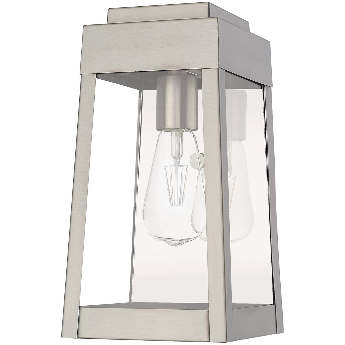 This updated industrial design comes in a tapering solid brass brushed nickel frame with a sleek, straight-lined look and features clear glass panels.
