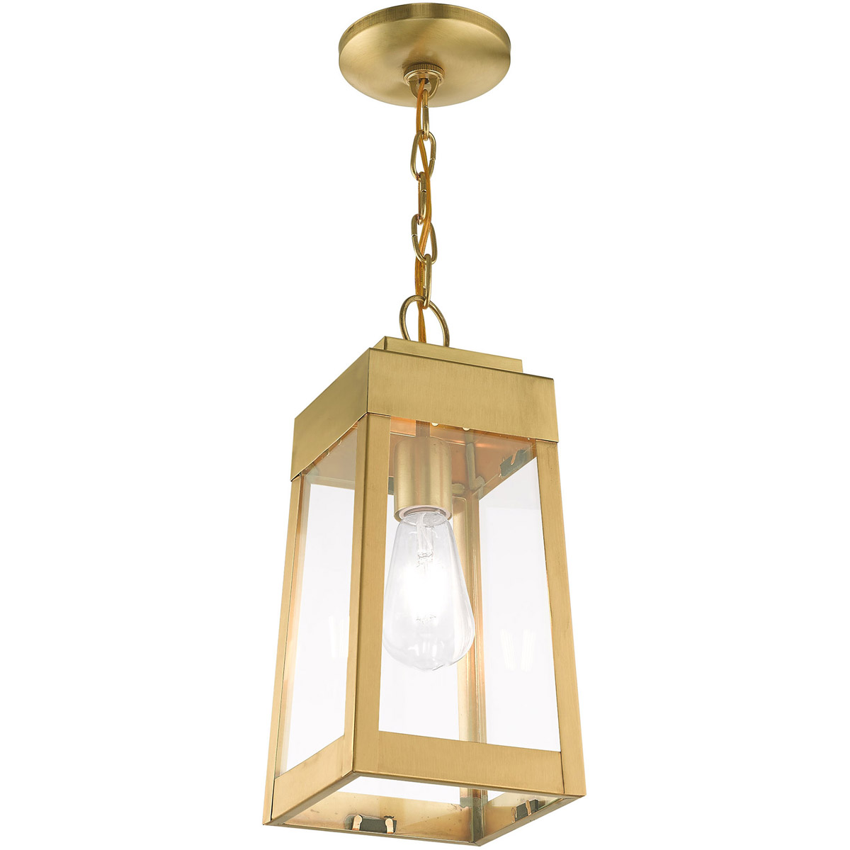 This updated industrial design comes in a tapering solid brass satin brass frame with a sleek, straight-lined look and features clear glass panels.