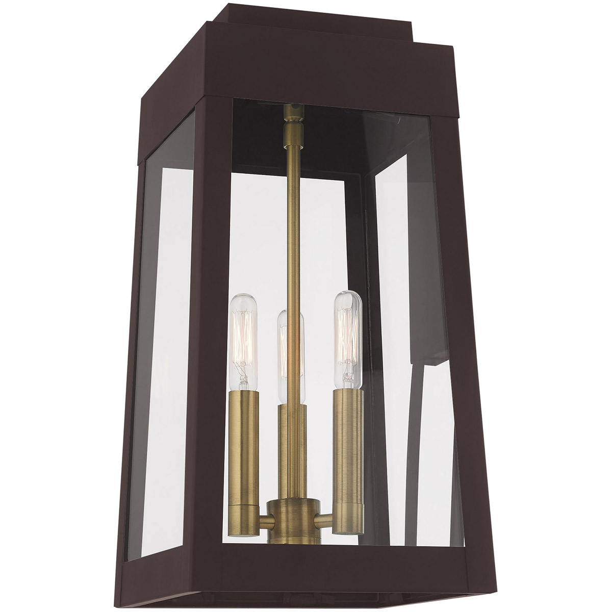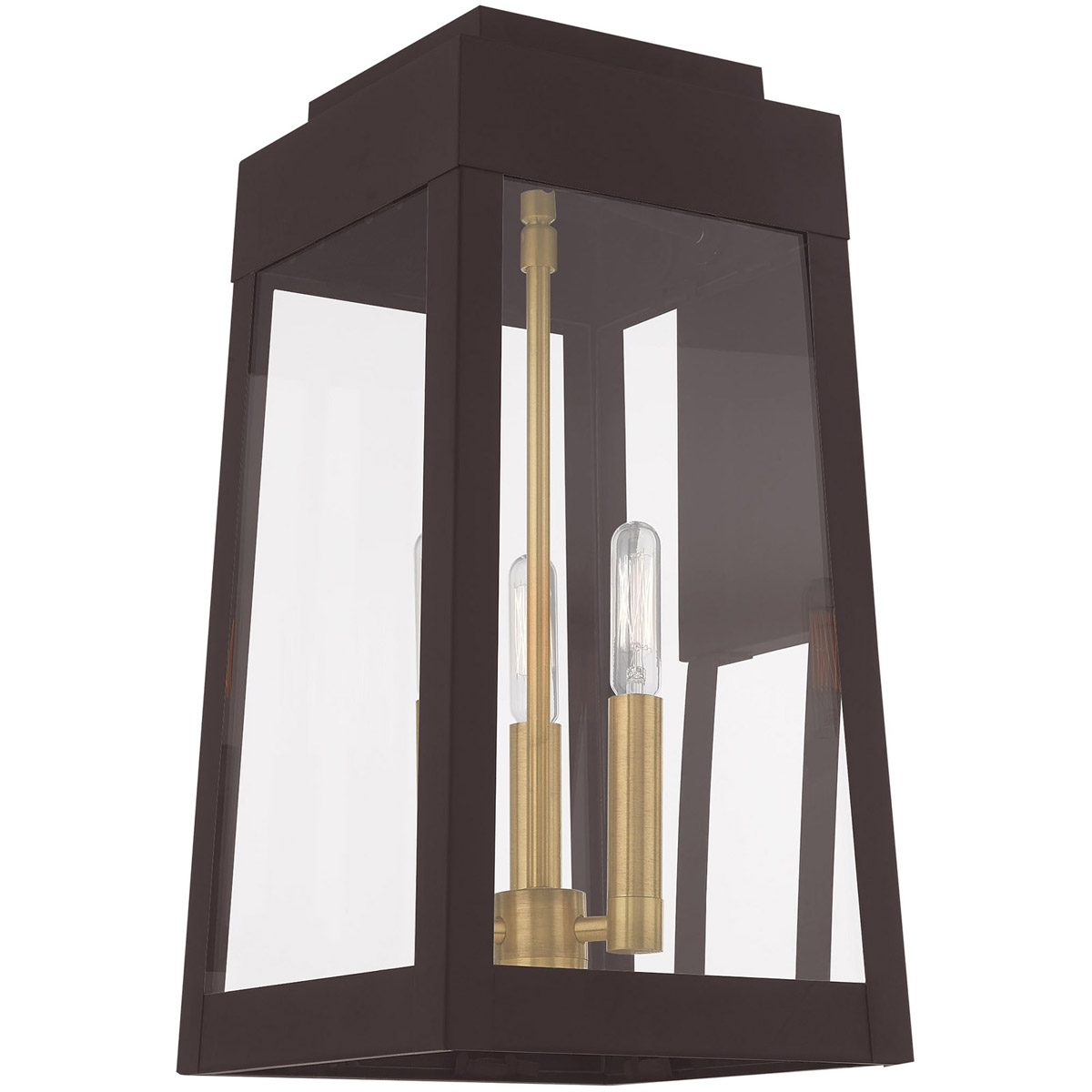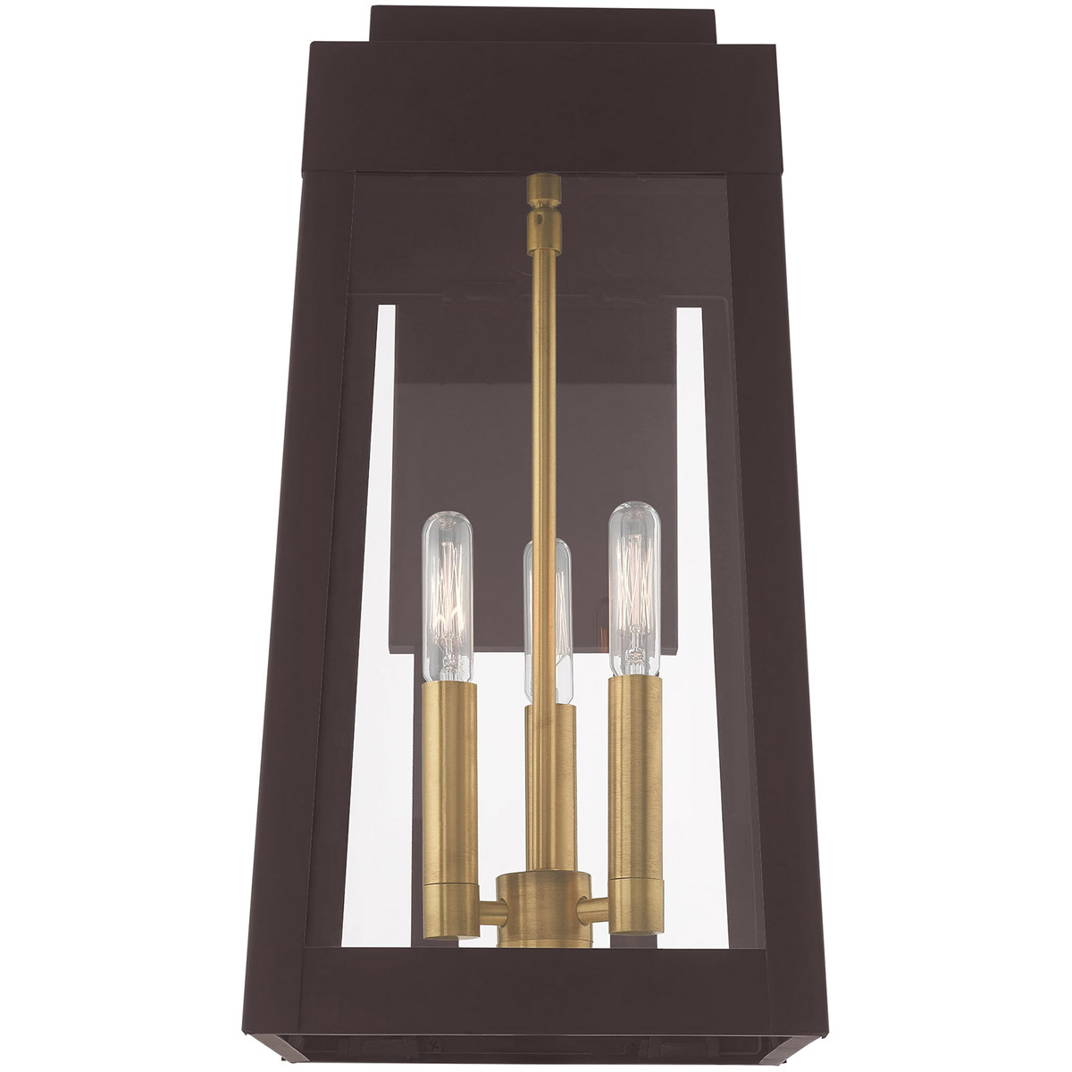 This updated industrial design comes in a tapering solid brass bronze frame with a sleek, straight-lined look and features clear glass panels.