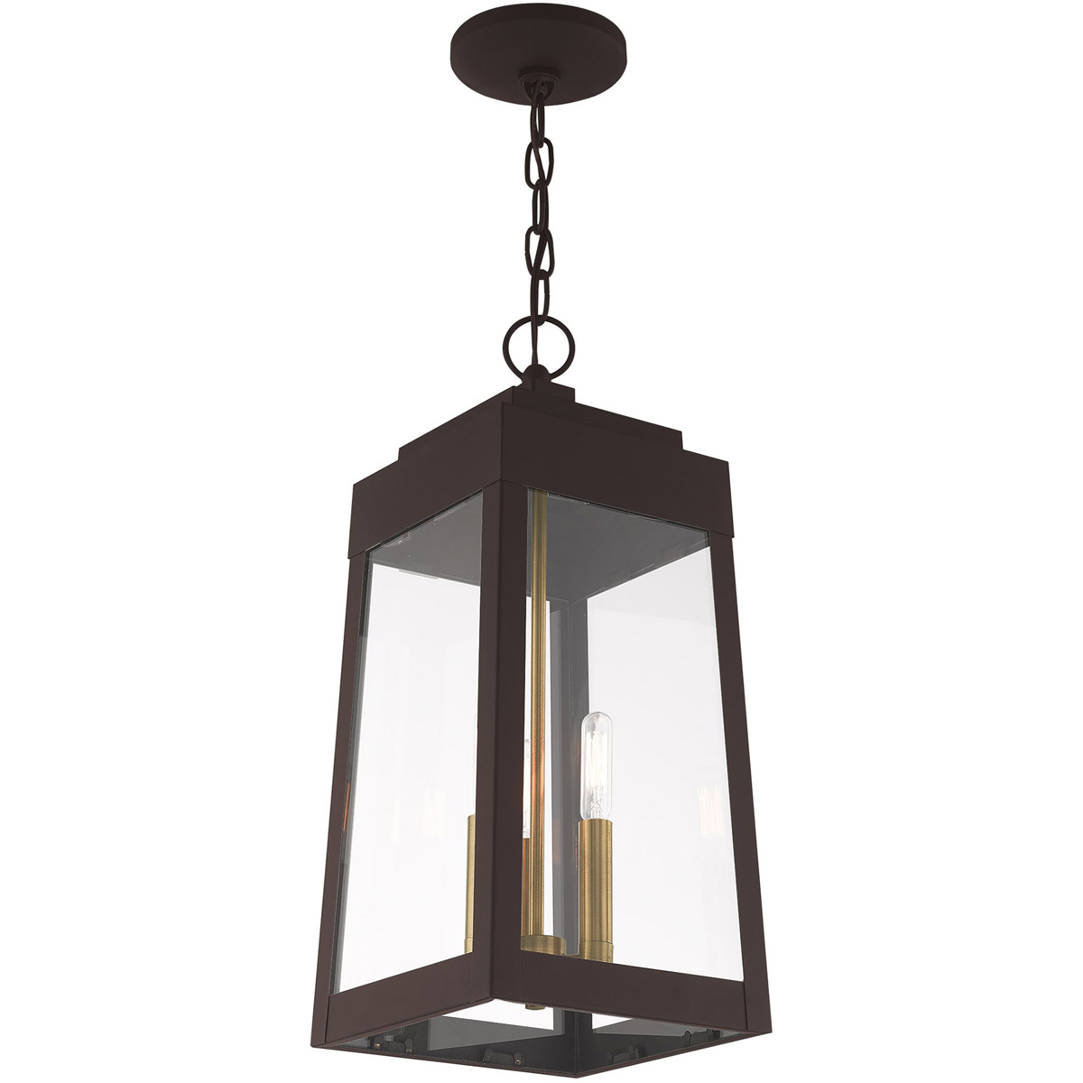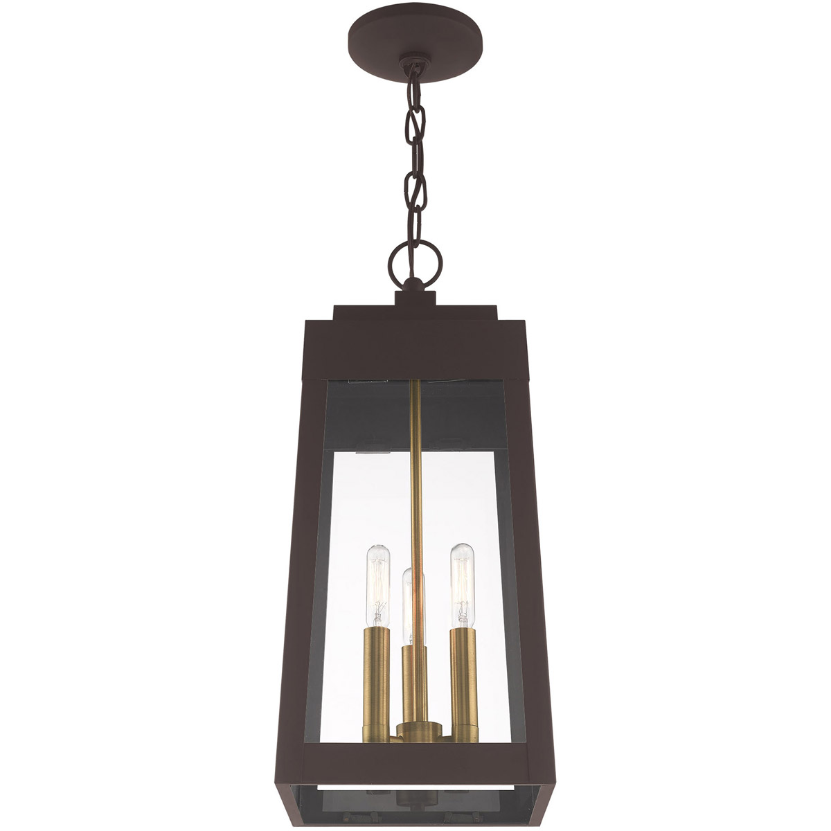 This updated industrial design comes in a tapering solid brass bronze frame with a sleek, straight-lined look and features clear glass panels.