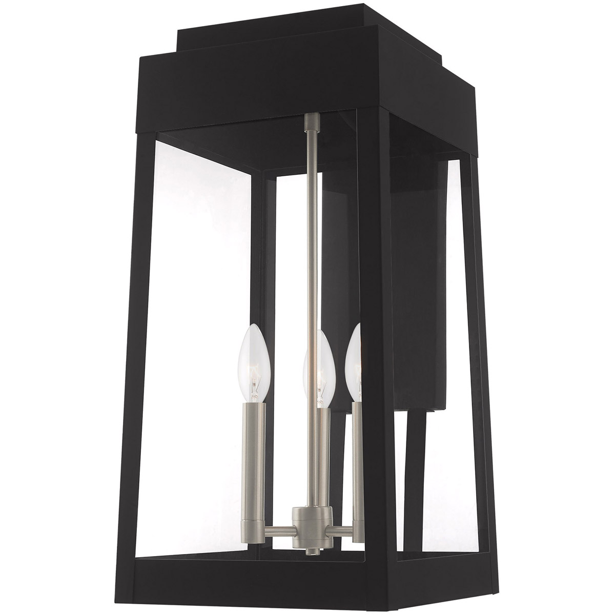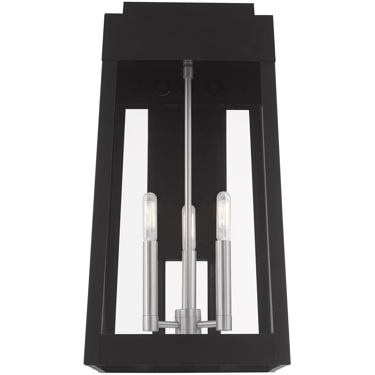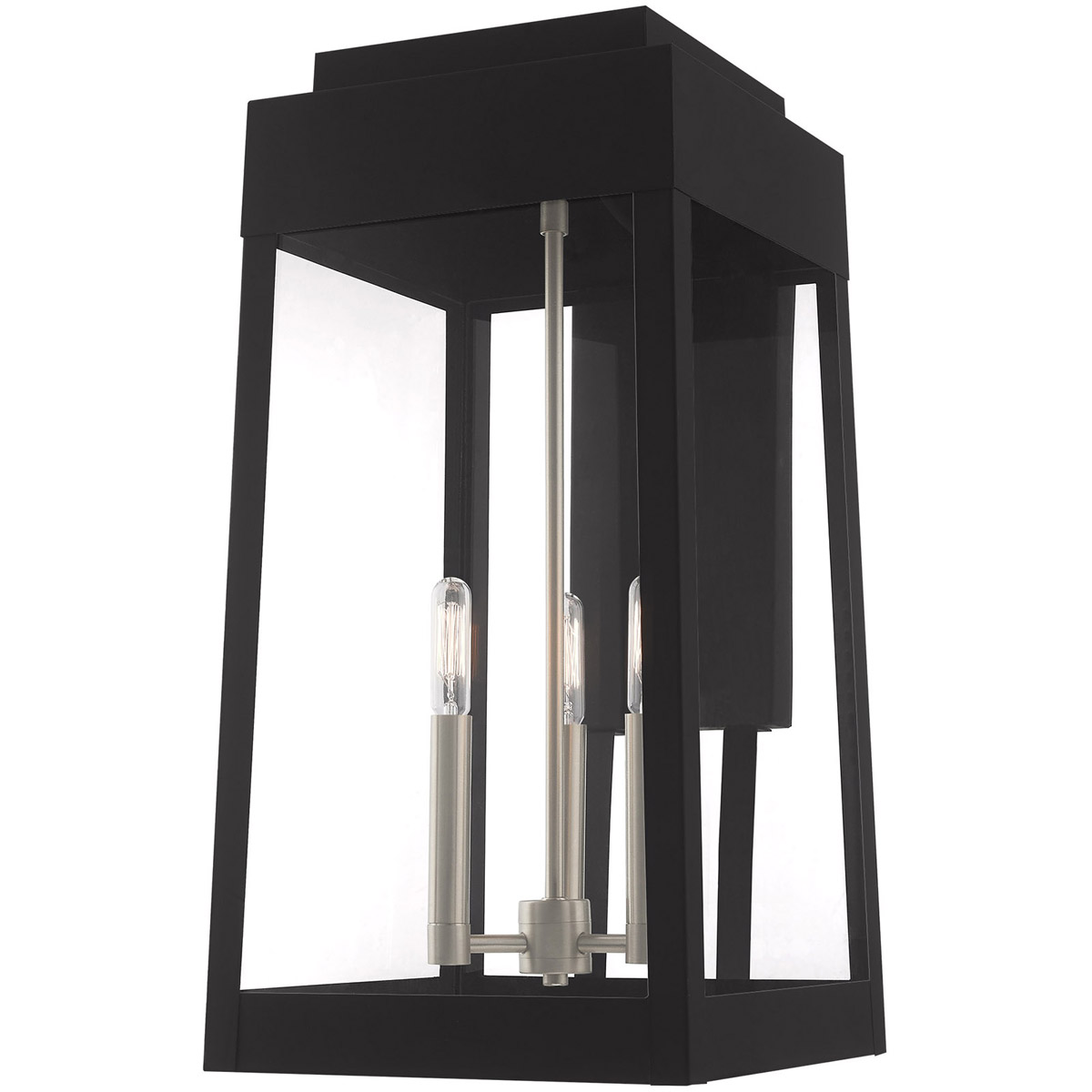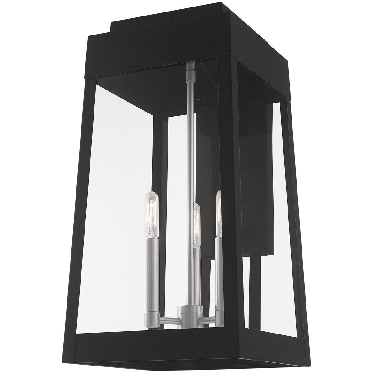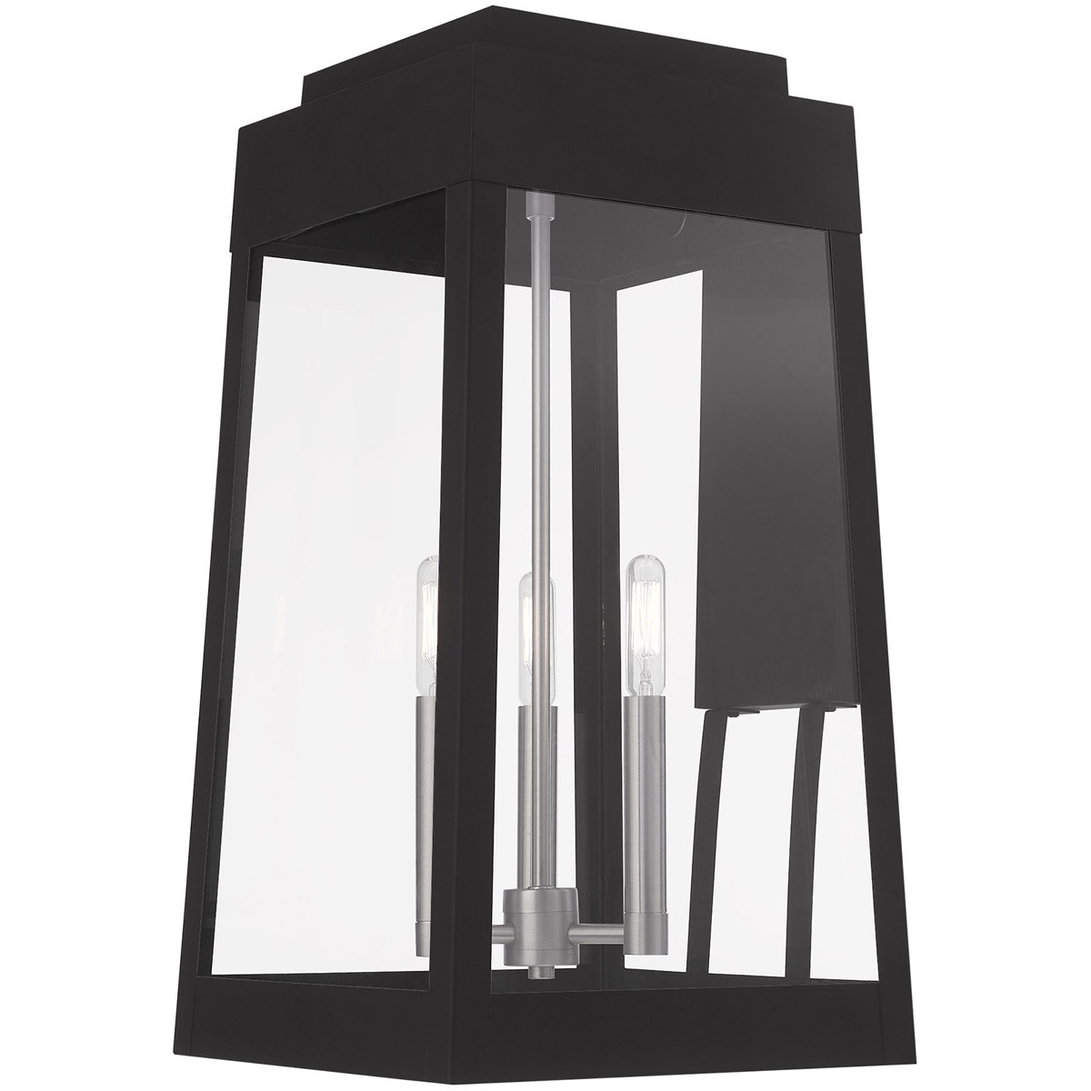 This updated industrial design comes in a tapering solid brass black frame with a sleek, straight-lined look. Clear glass panels offer a full view of the brushed nickel accents, that will house the bulb of your choice.