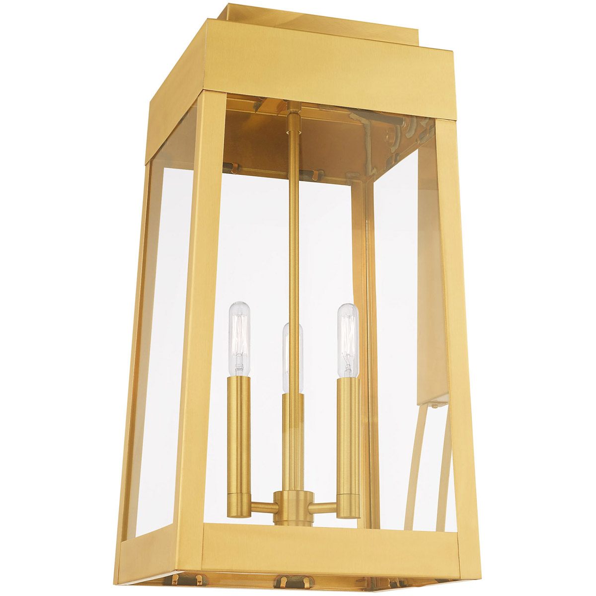 This updated industrial design comes in a tapering solid brass satin brass frame with a sleek, straight-lined look and features clear glass panels.