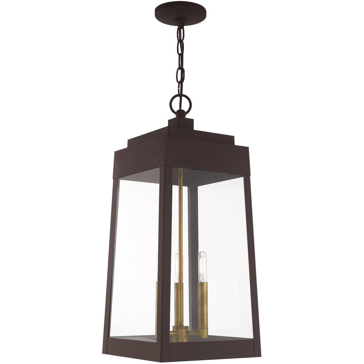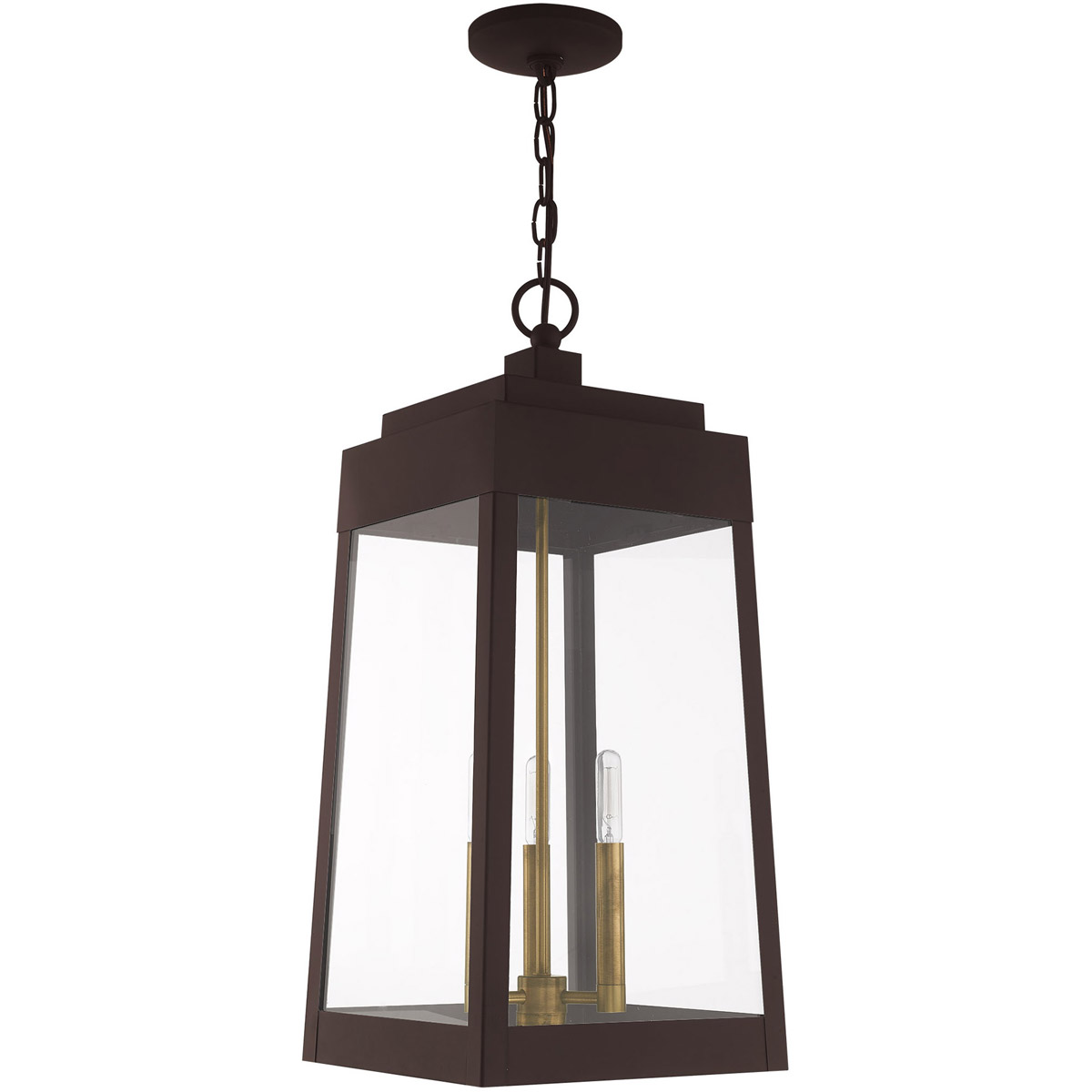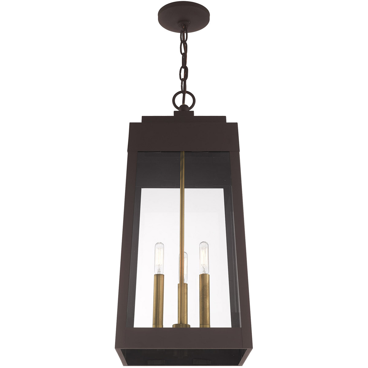 This updated industrial design comes in a tapering solid brass bronze frame with a sleek, straight-lined look and features clear glass panels.