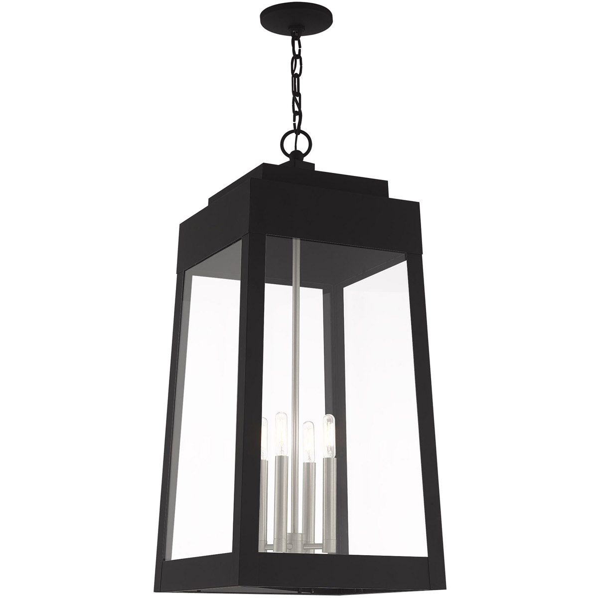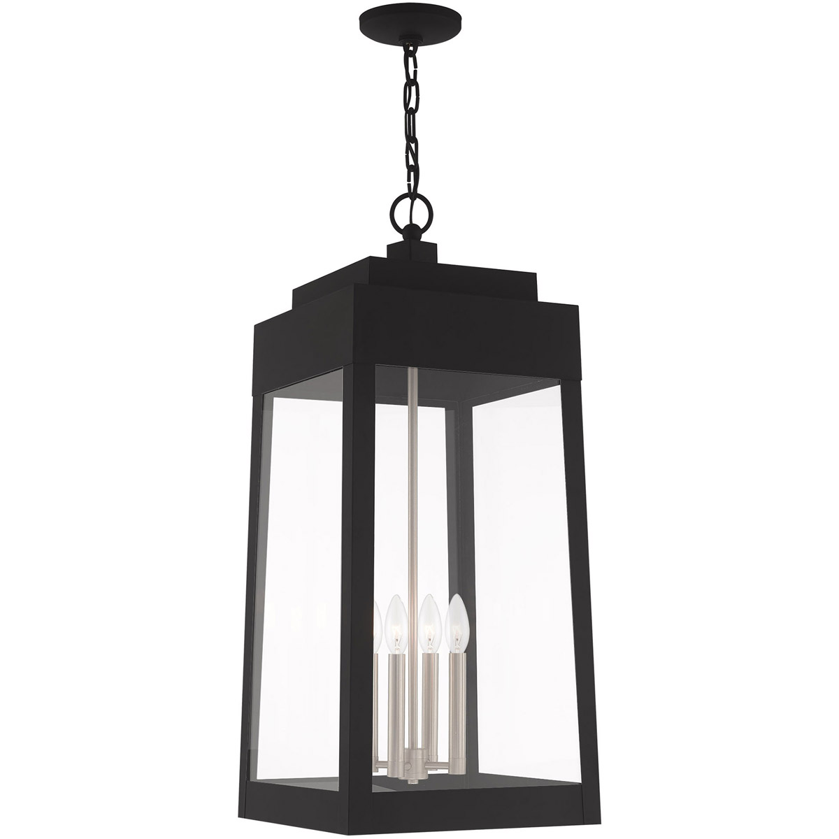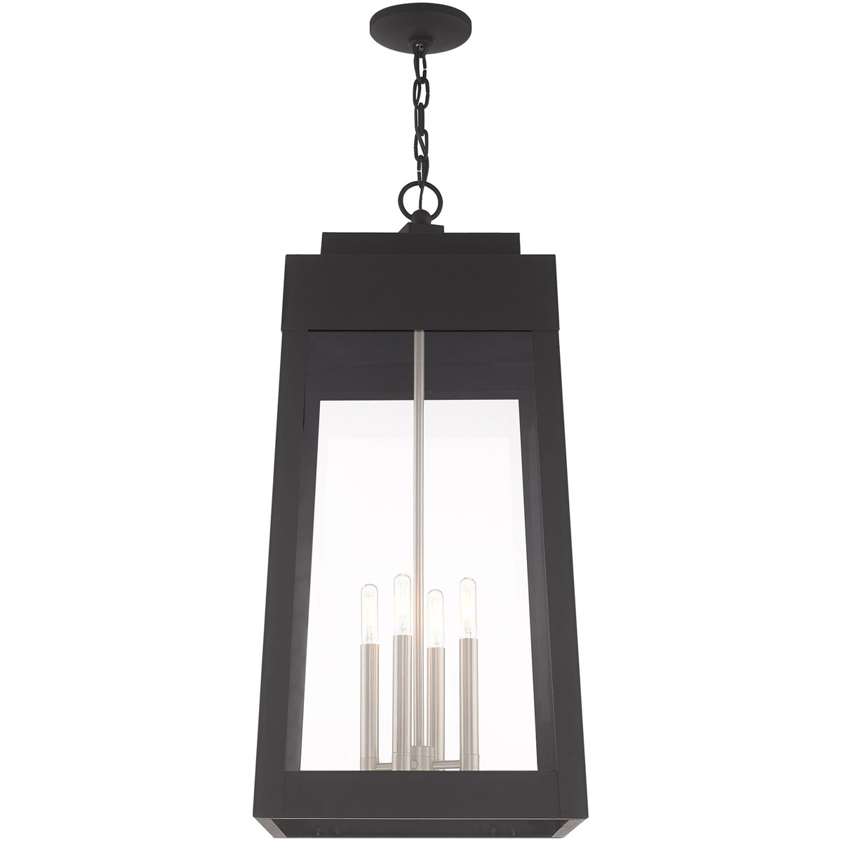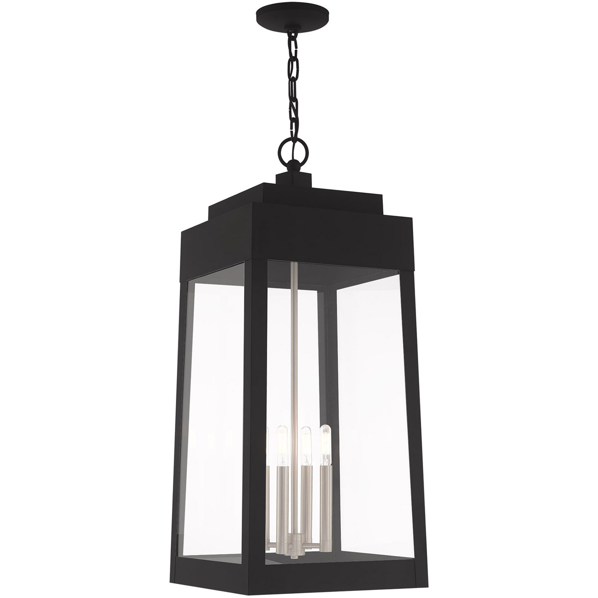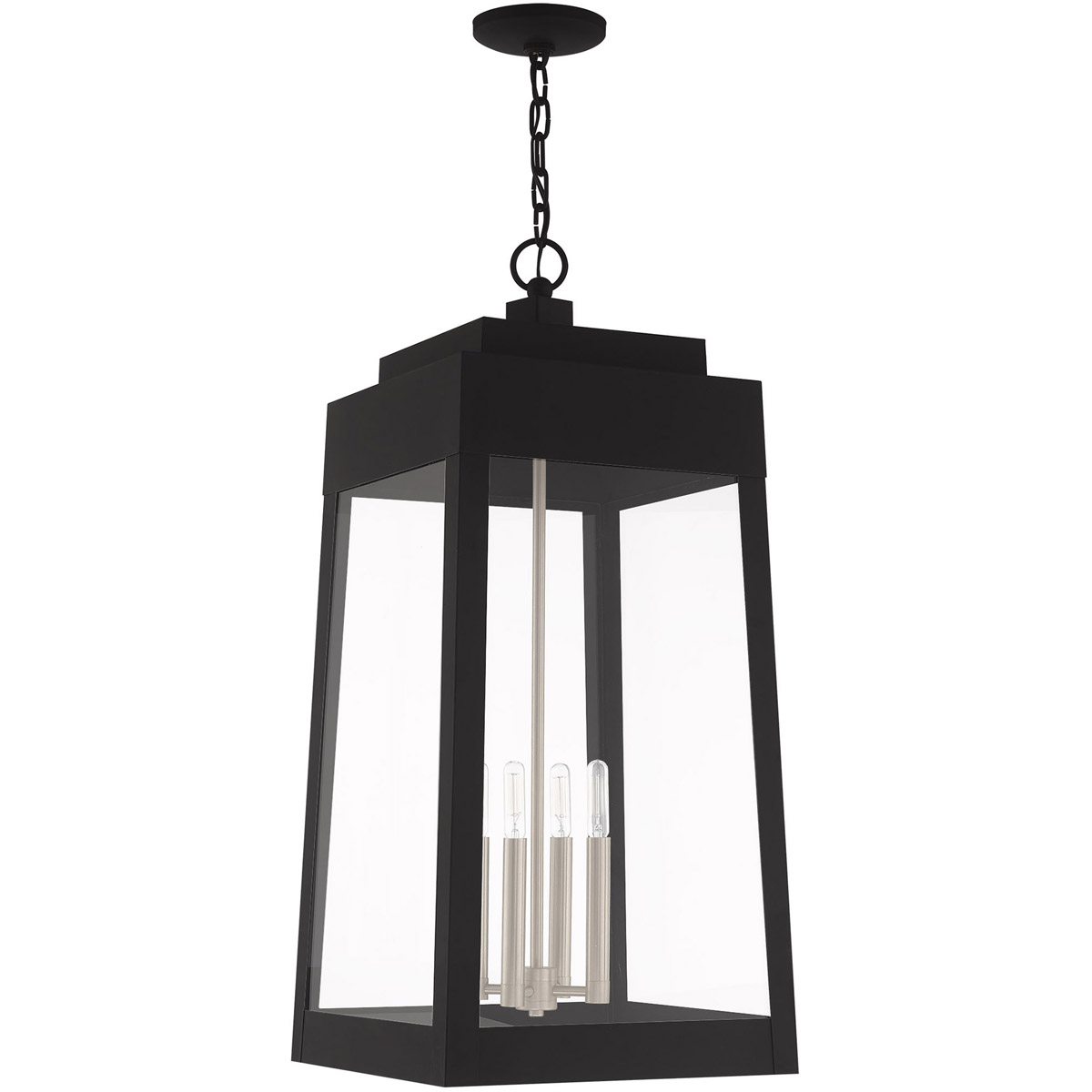 This updated industrial design comes in a tapering solid brass black frame with a sleek, straight-lined look. Clear glass panels offer a full view of the brushed nickel accents, that will house the bulb of your choice.