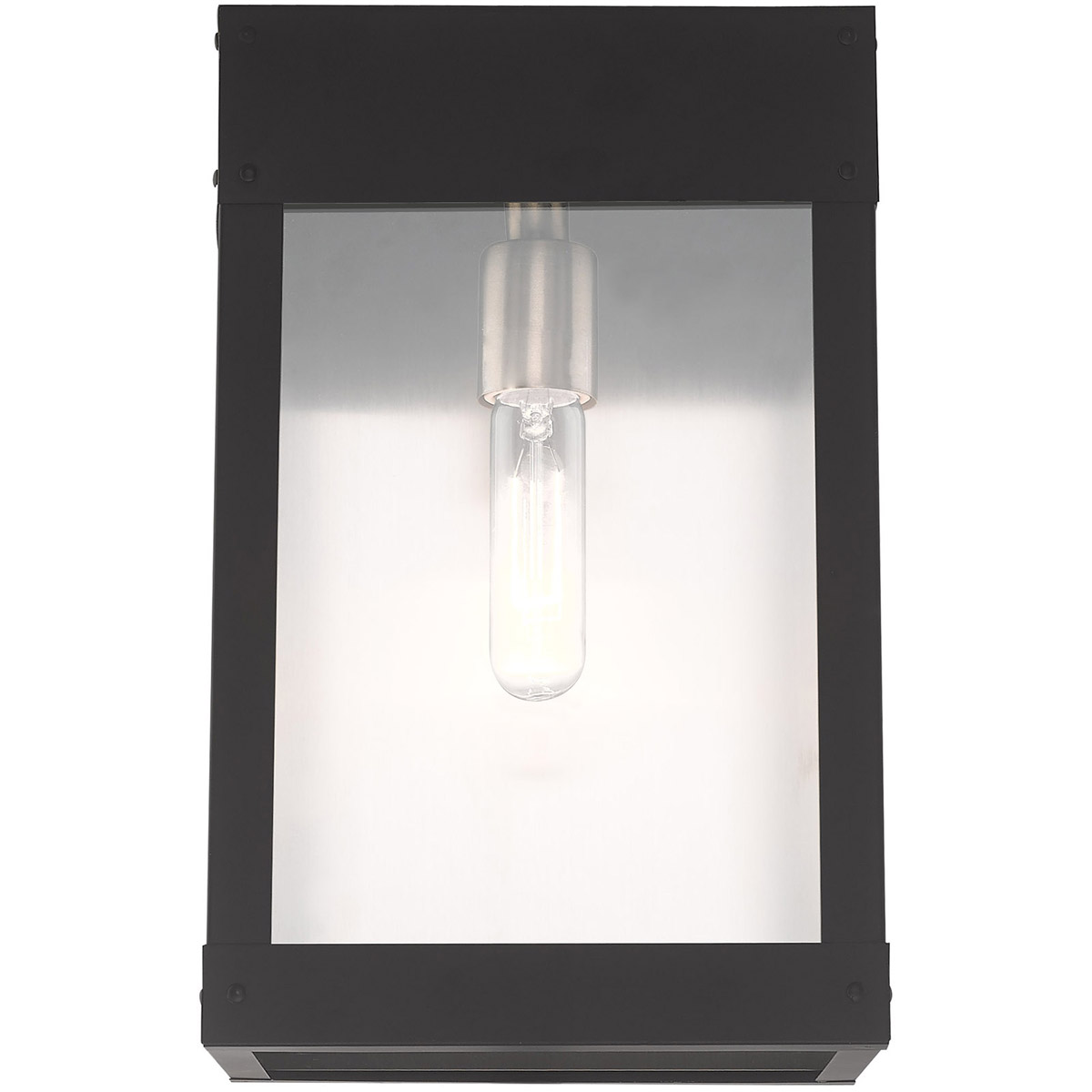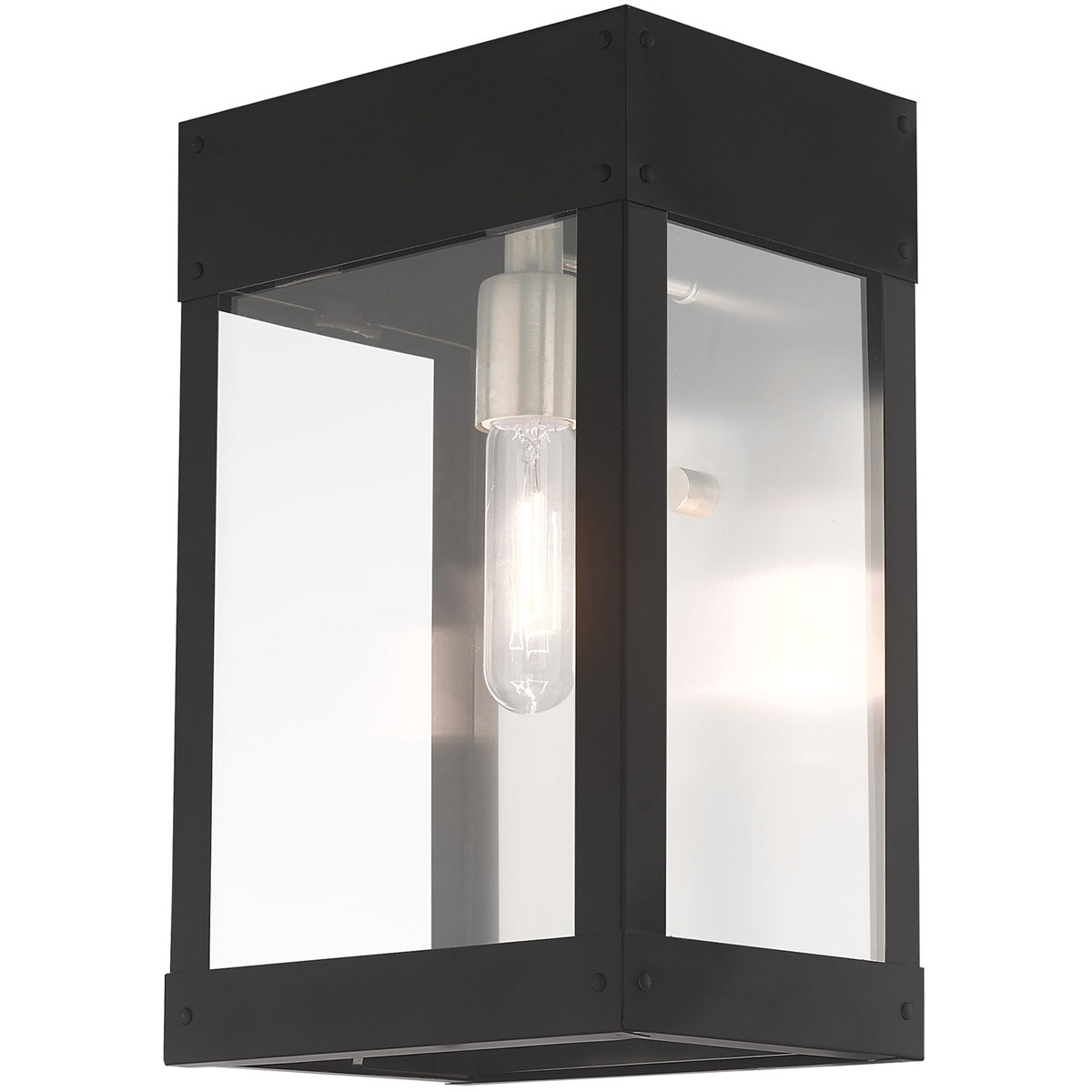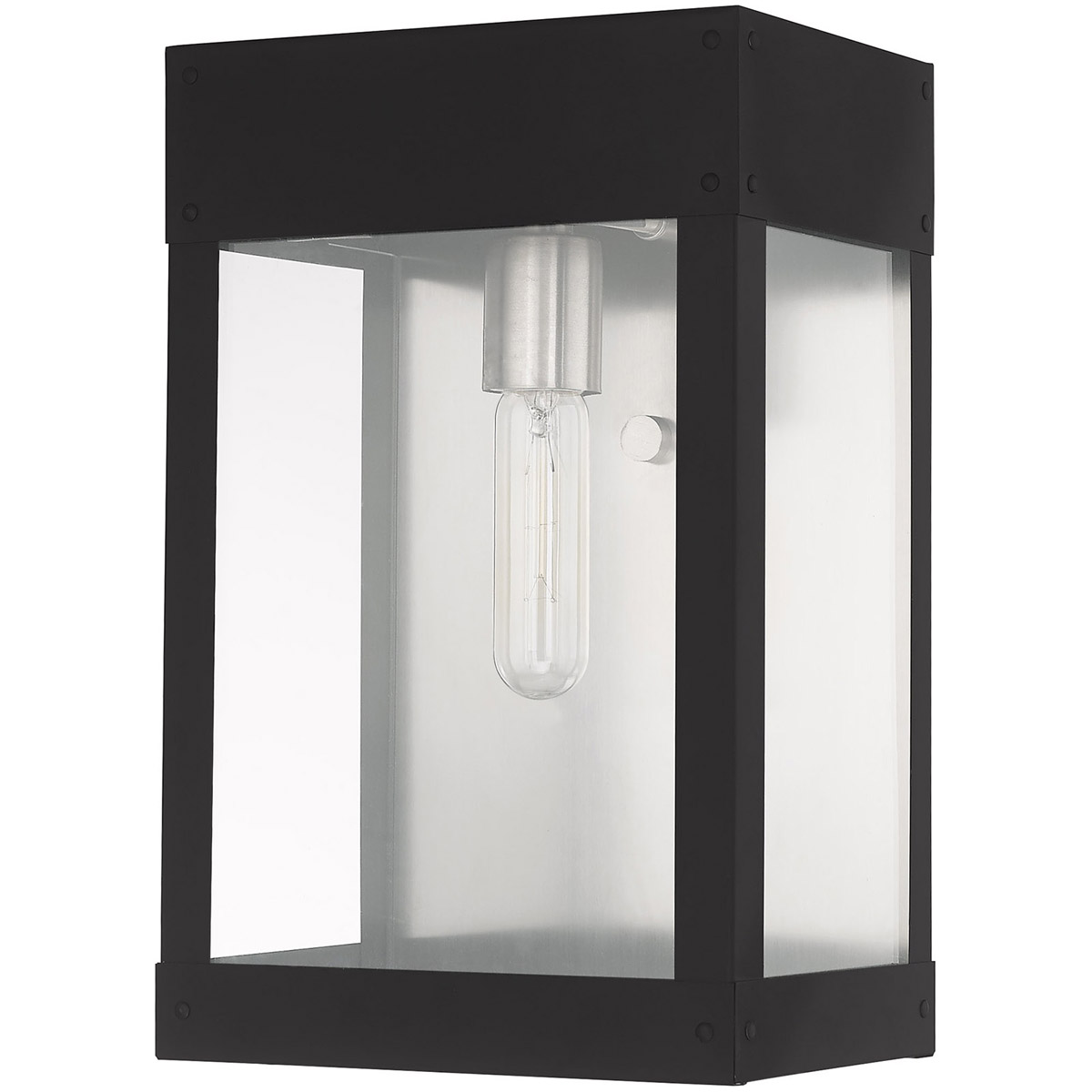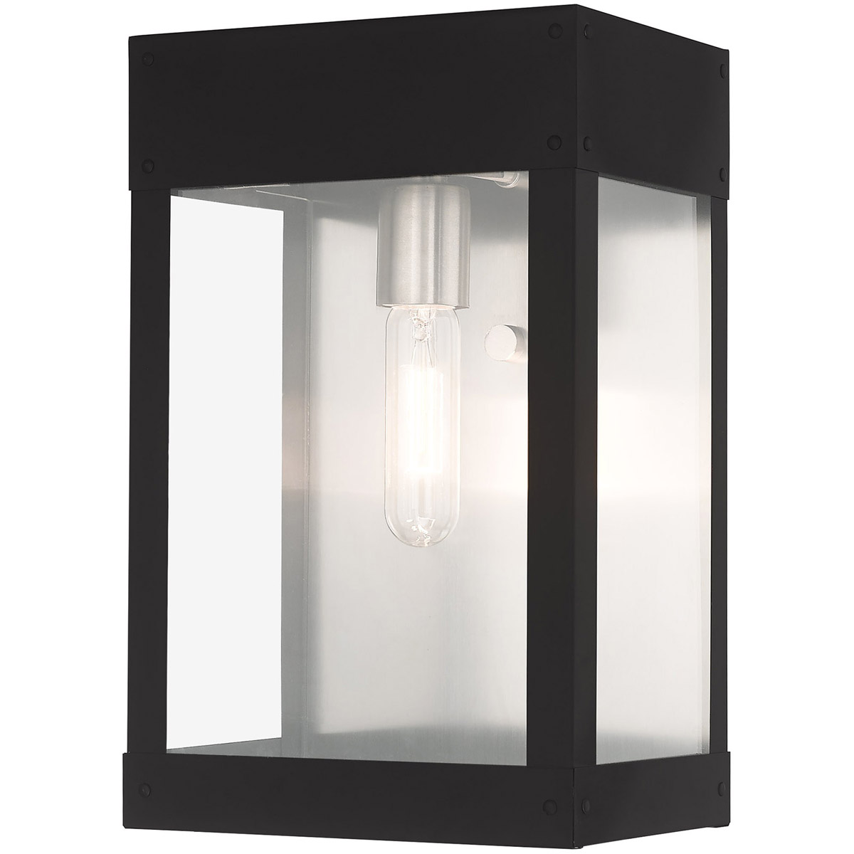 Made of stainless steel this charming, black finish outdoor wall lantern has a versatile look that can be placed almost anywhere. The brushed nickel accent & clear glass adds a traditional touch to the clean, transitional-contemporary lines.