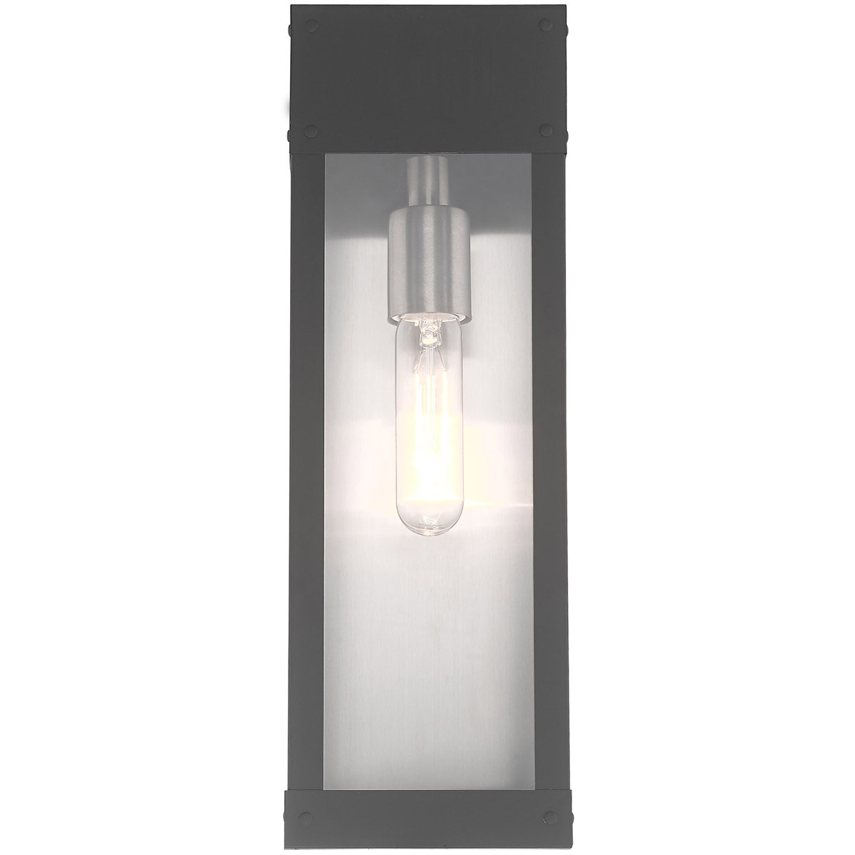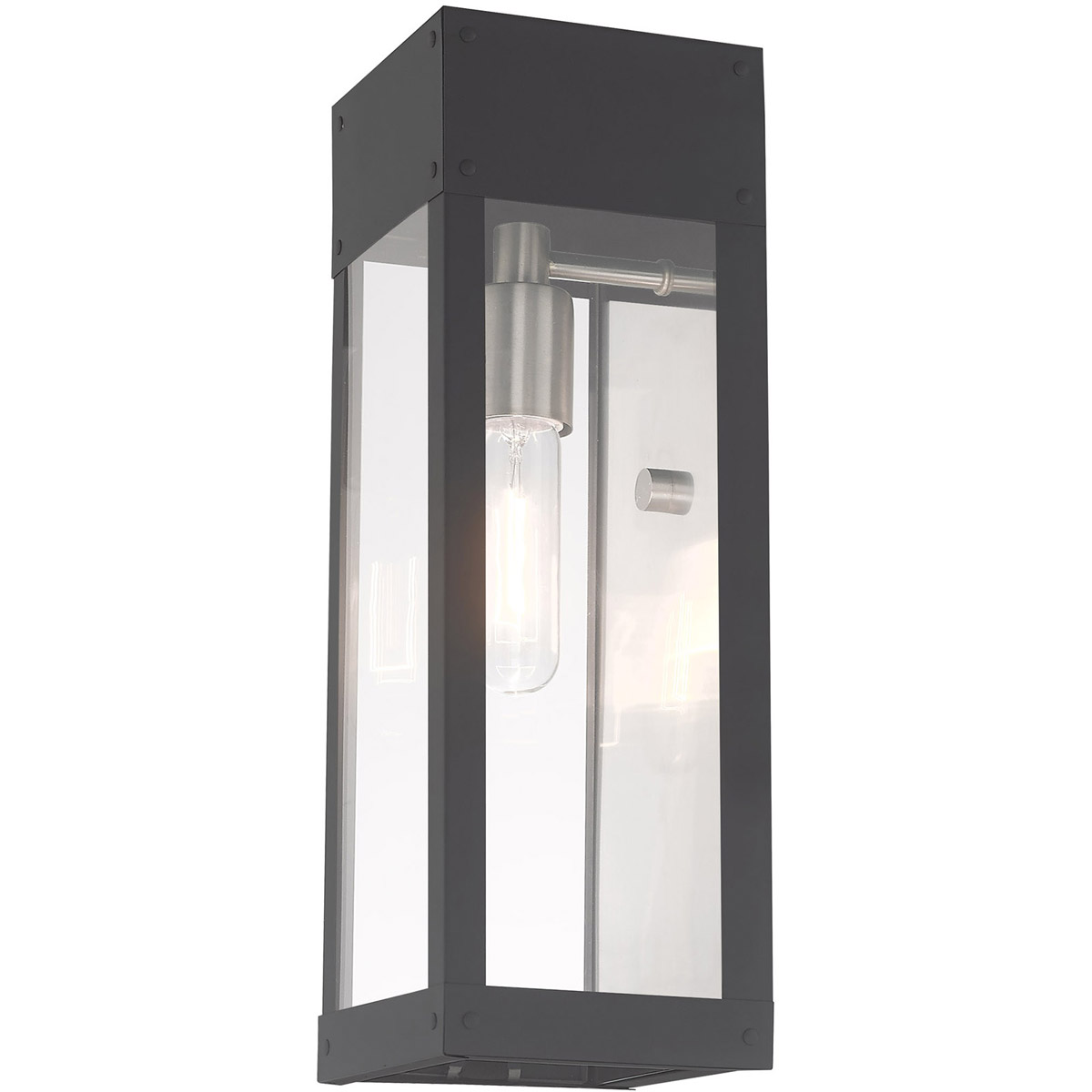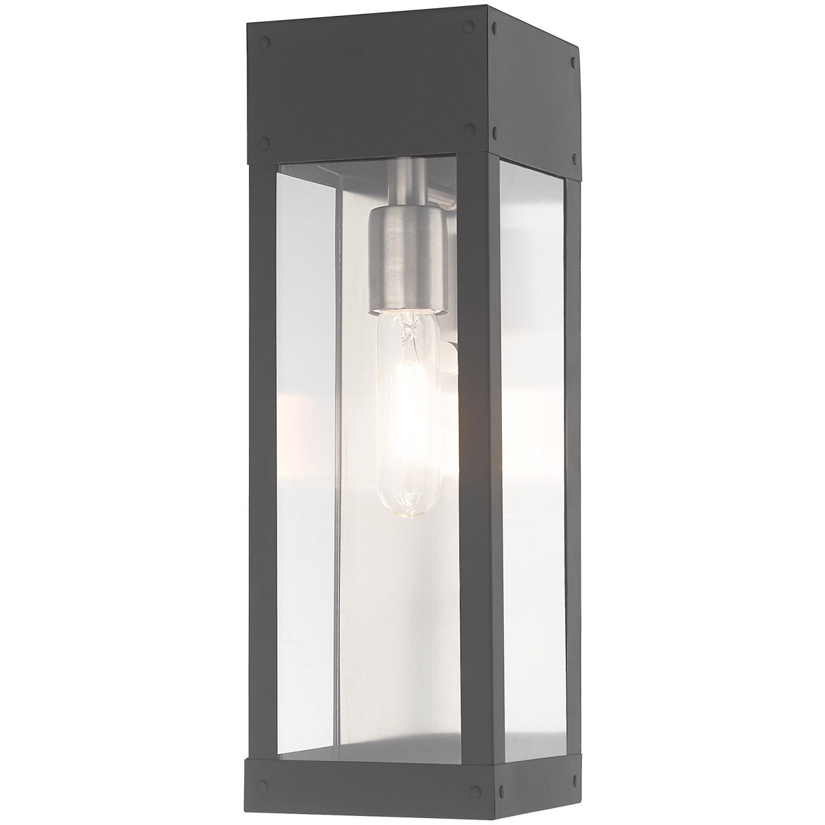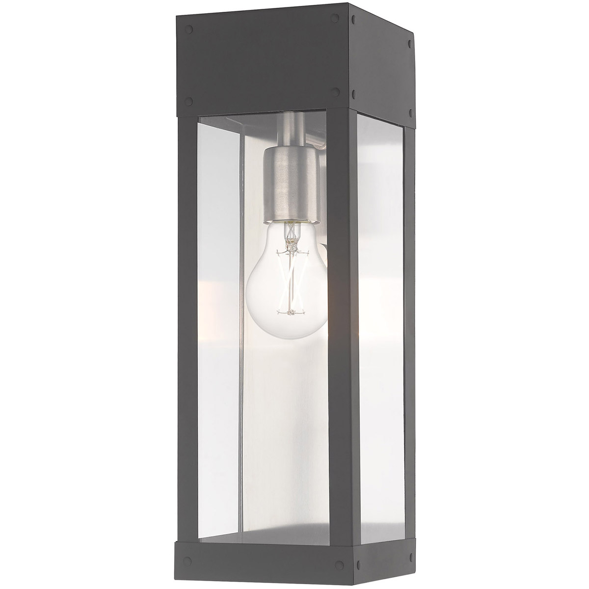 Made of stainless steel this charming, Scandinavian gray finish outdoor wall lantern has a versatile look that can be placed almost anywhere. The brushed nickel accent & clear glass adds a traditional touch to the clean, transitional-contemporary lines.