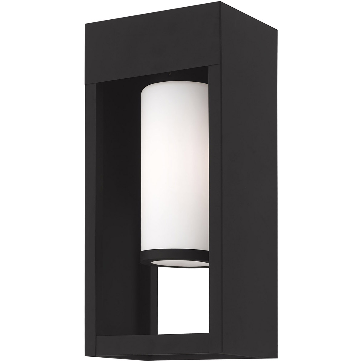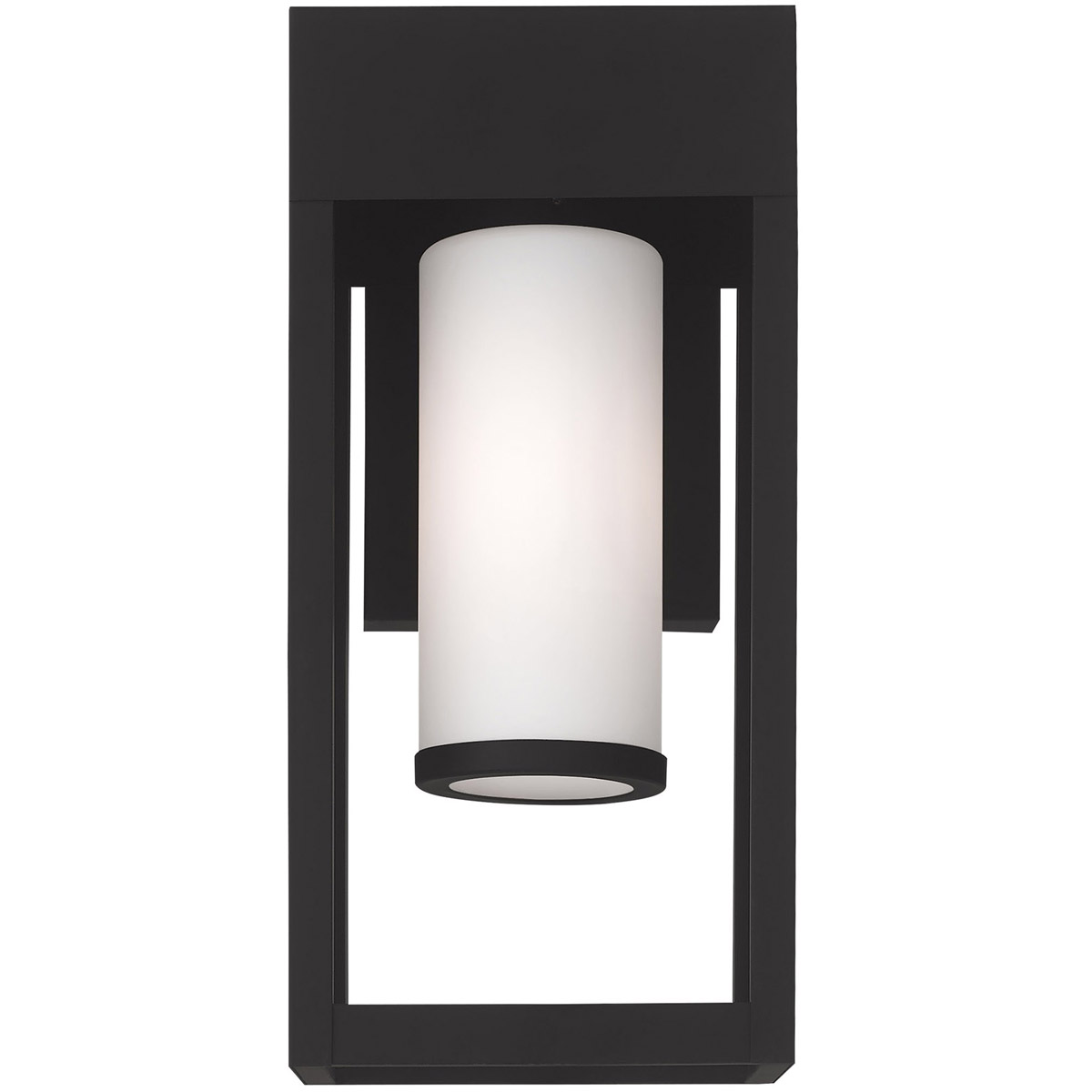 The box-like solid brass body of this outdoor wall lantern has a thick frame that houses a satin opal white cylinder glass shade. The black finish give the thick, sturdy frame construction a contemporary look with distinct style.