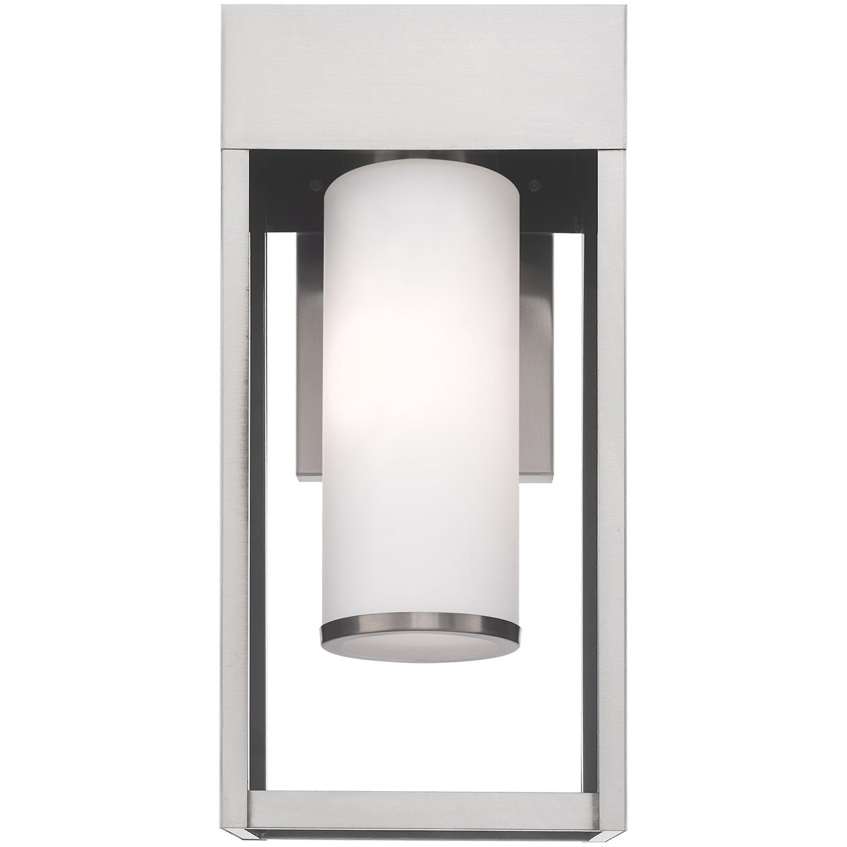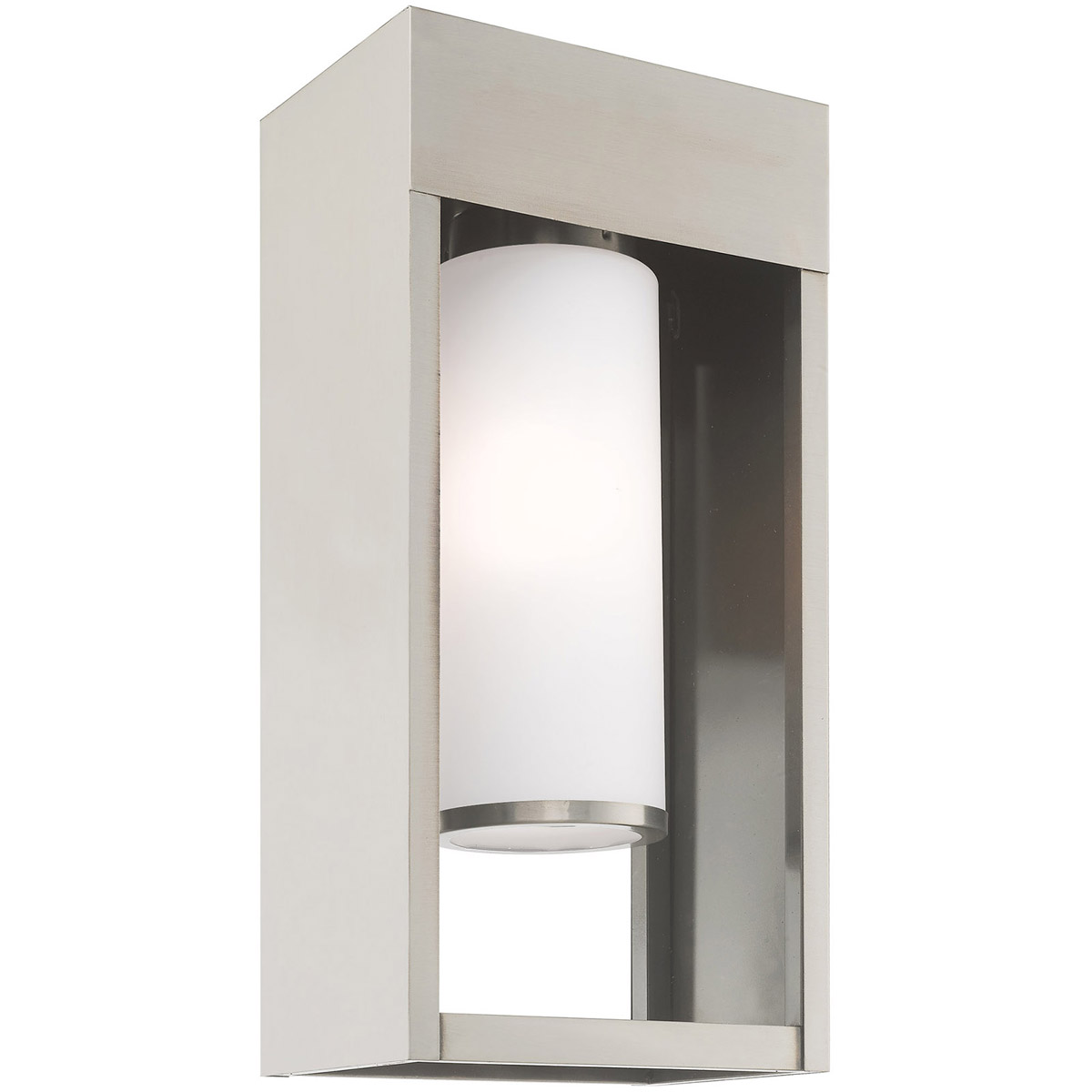 The box-like solid brass body of this outdoor wall lantern has a thick frame that houses a satin opal white cylinder glass shade. The brushed nickel finish give the thick, sturdy frame construction a contemporary look with distinct style.