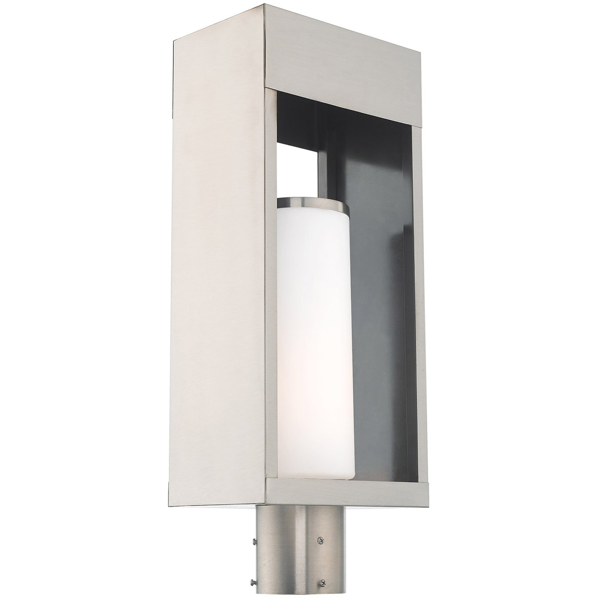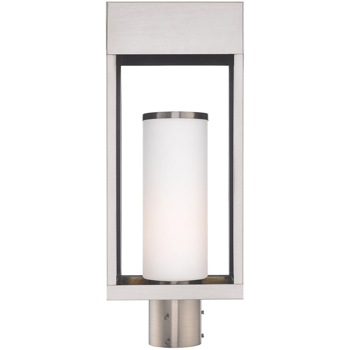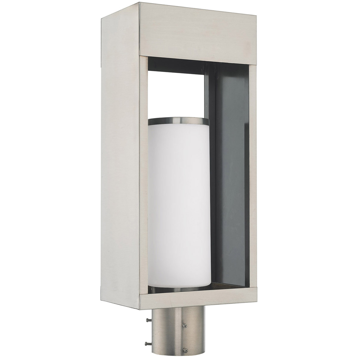 The box-like solid brass body of this outdoor post top lantern has a thick frame that houses a satin opal white cylinder glass shade. The brushed nickel finish give the thick, sturdy frame construction a contemporary look with distinct style.