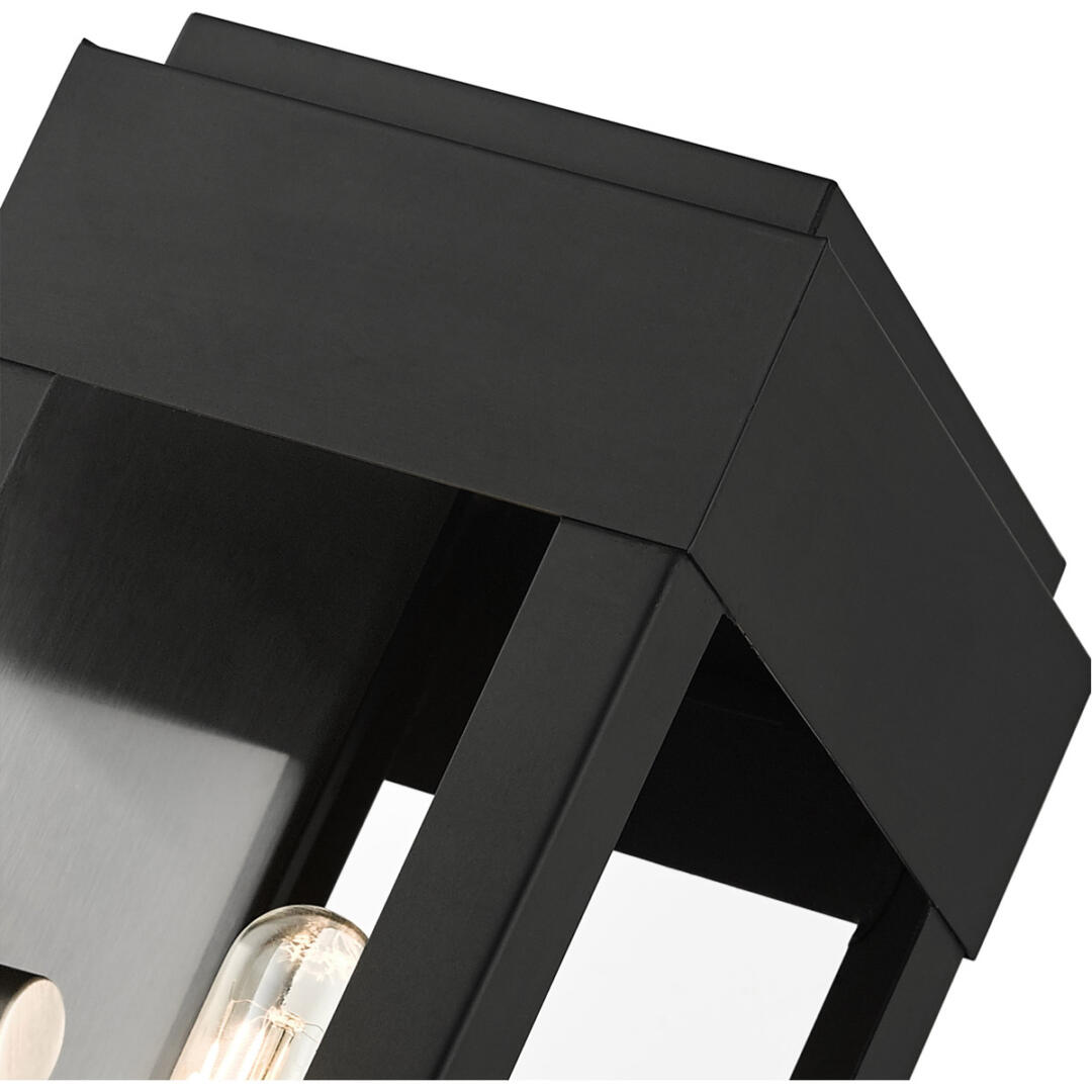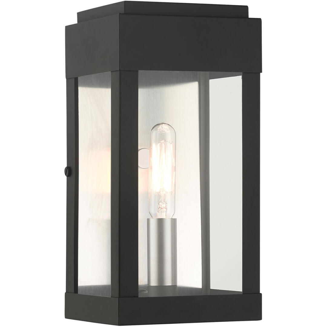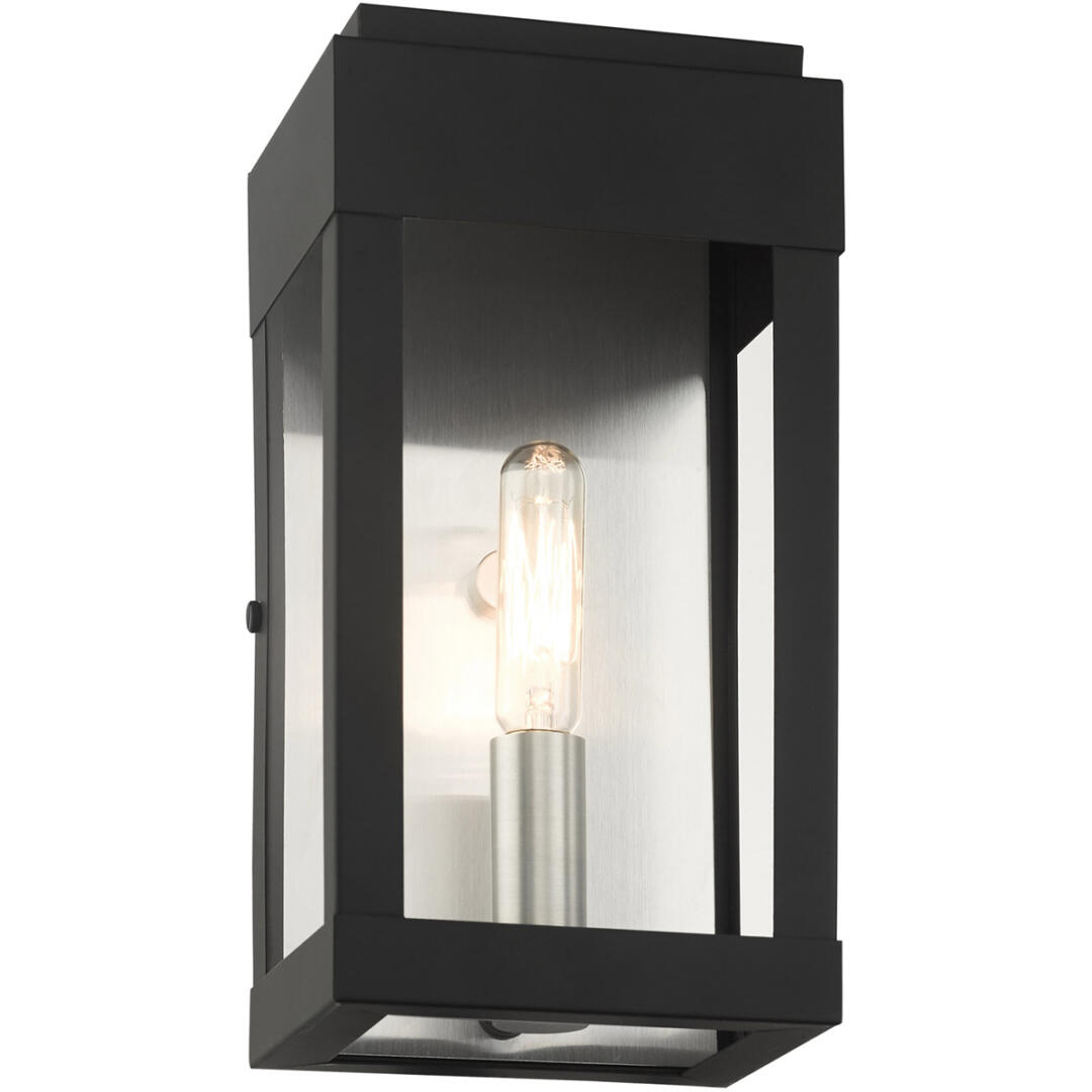 The simple rectangular shape of the York collection is an updated classic transitional line that will complement most home exteriors. The hand crafted solid brass construction is finished in black. The clear glass exposes the brushed nickel candle set off by the brushed nickel stainless steel back reflector giving an illusion of a double light effect. Greet your visitors with this small single-light wall lantern providing your home with a stunning and welcoming air.