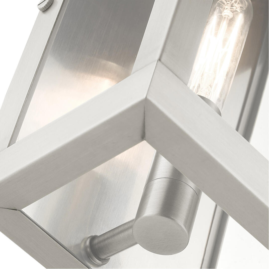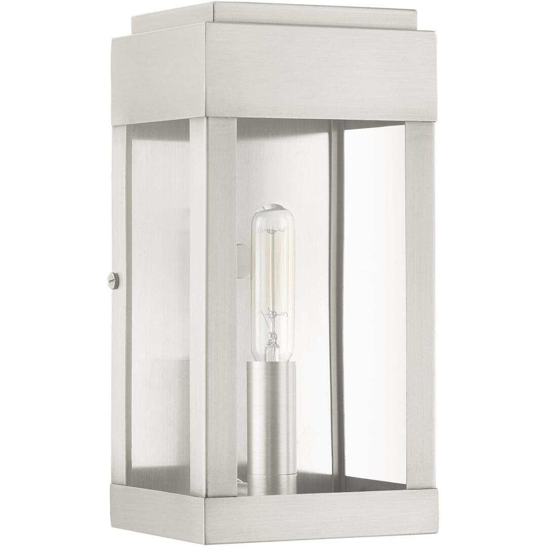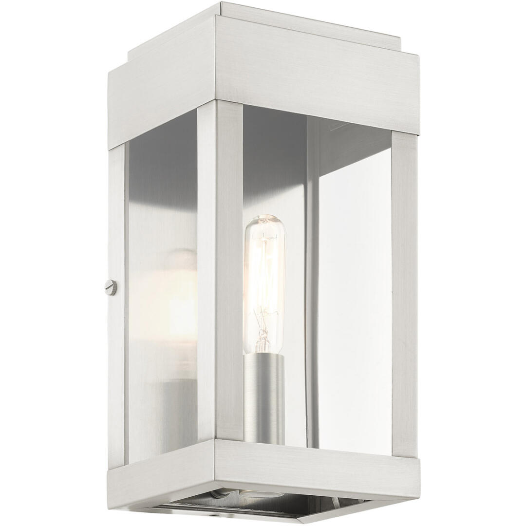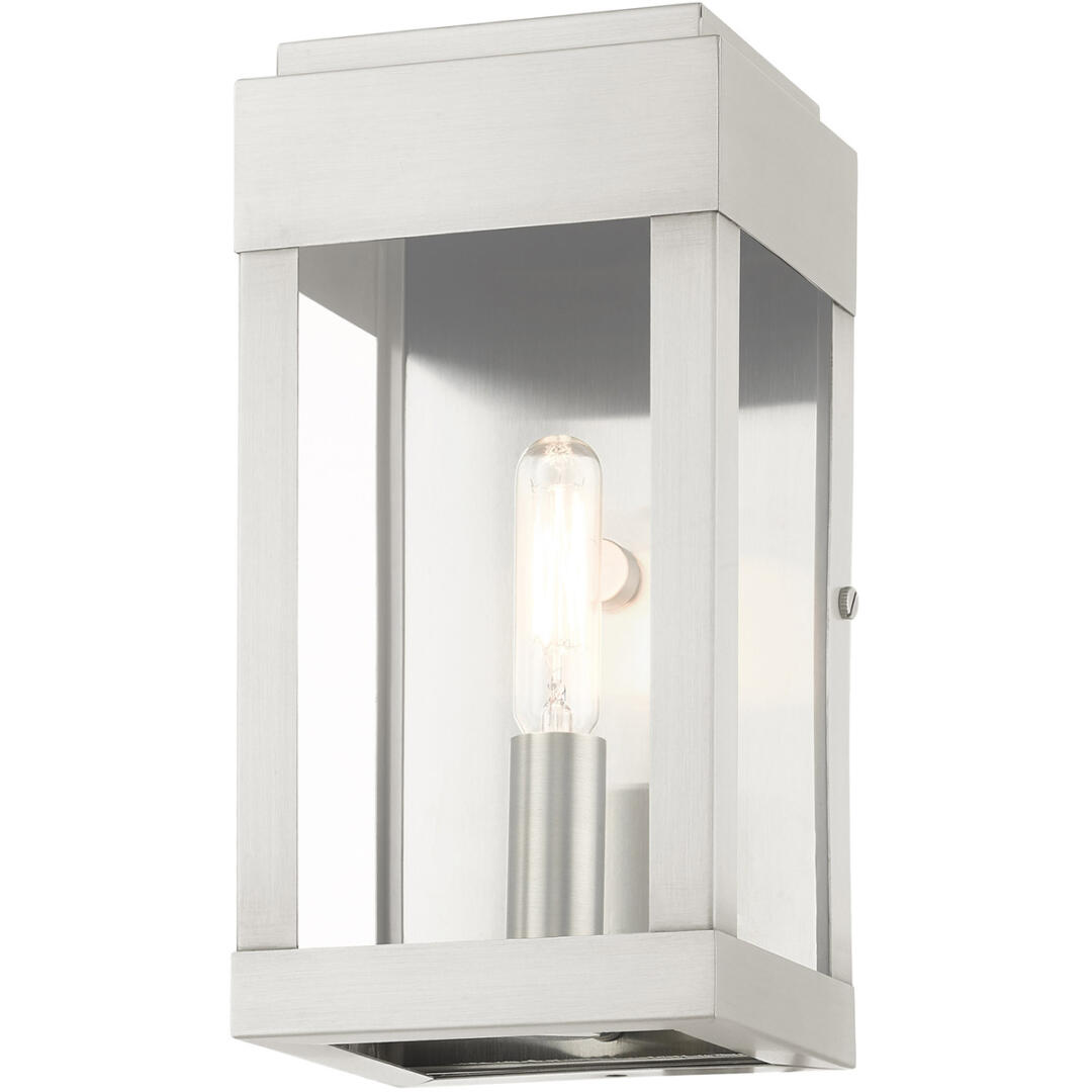 The simple rectangular shape of the York collection is an updated classic transitional line that will complement most home exteriors. The hand crafted solid brass construction is finished in brushed nickel. The clear glass exposes the candle set off by the brushed nickel stainless steel back reflector giving an illusion of double light effect. Greet your visitors with this small single-light wall lantern providing your home with a stunning and welcoming air.