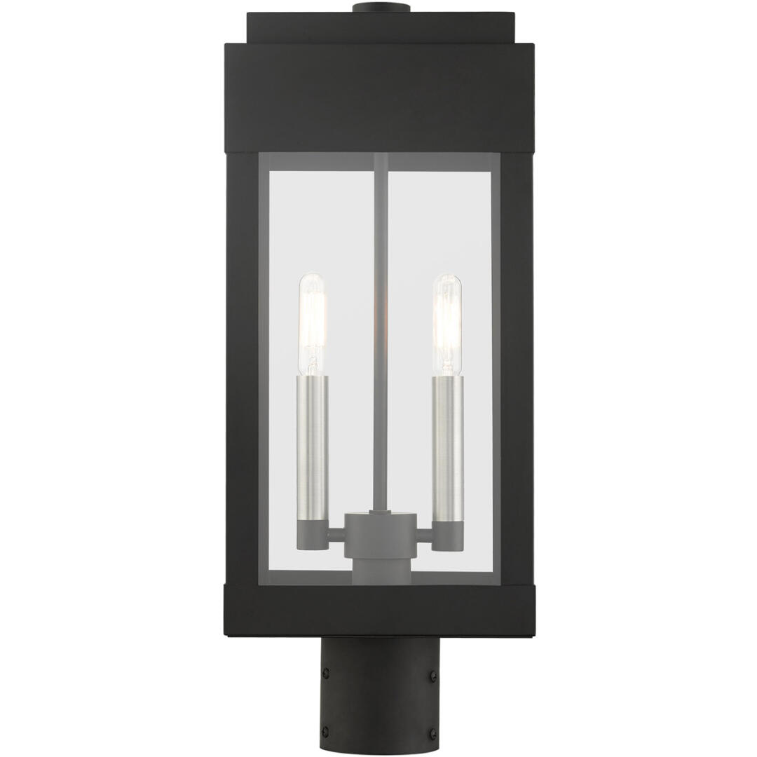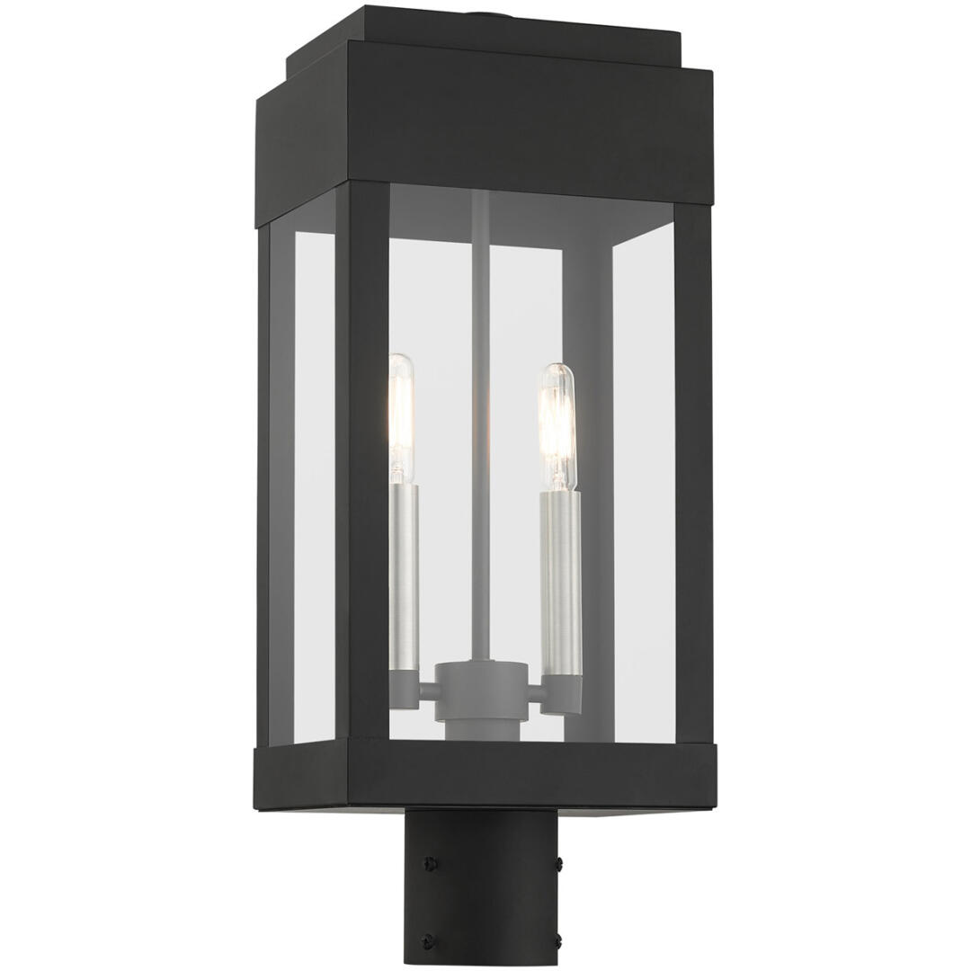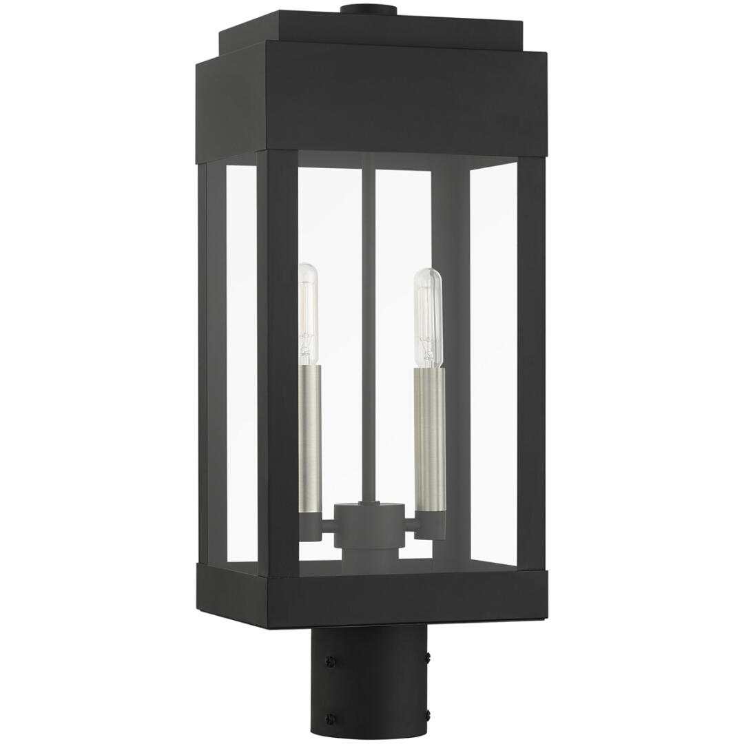 The simple rectangular shape of the York collection is an updated classic transitional line that will complement most home exteriors. The hand crafted solid brass construction is finished in black. The clear glass exposes the brushed nickel candles seen from all angles showing off the beautiful two-tone effect. Greet your visitors with this medium two-light post top lantern providing your home with a stunning and welcoming air.