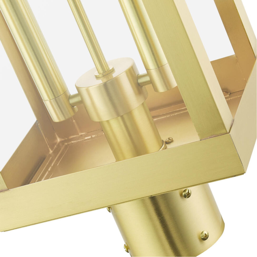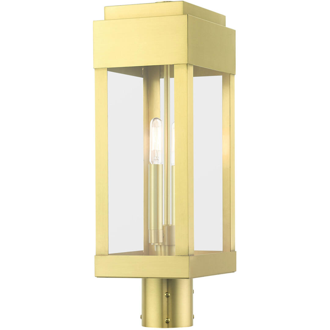 The simple rectangular shape of the York collection is an updated classic transitional line that will complement most home exteriors. The hand crafted solid brass construction is finished in satin brass. The clear glass exposes the candles seen from all angles showing off the beautiful glow effect. Greet your visitors with this medium two-light post top lantern providing your home with a stunning and welcoming air.