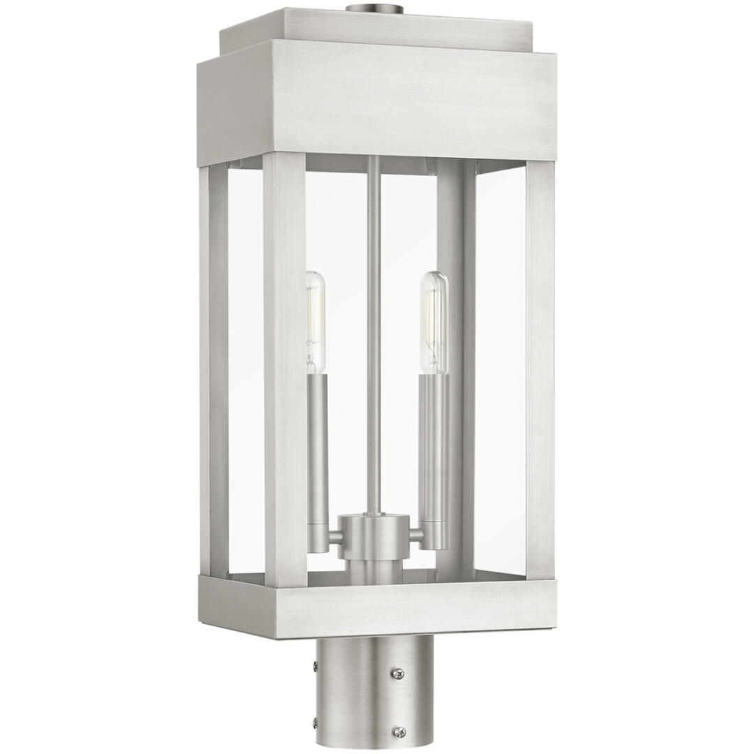 The simple rectangular shape of the York collection is an updated classic transitional line that will complement most home exteriors. The hand crafted solid brass construction is finished in brushed nickel. The clear glass exposes the candles seen from all angles showing off the beautiful glow effect. Greet your visitors with this medium two-light post top lantern providing your home with a stunning and welcoming air.