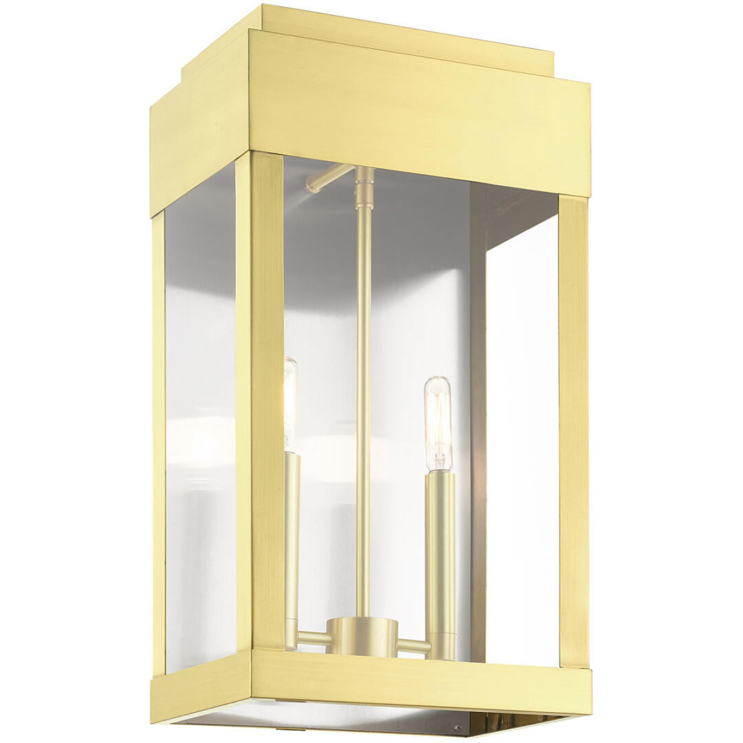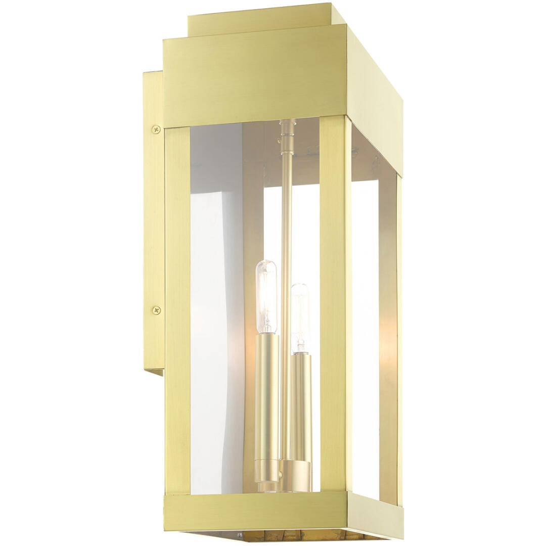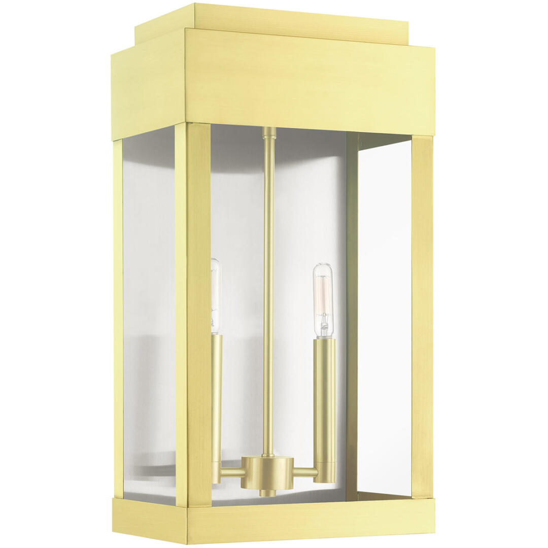 The simple rectangular shape of the York collection is an updated classic transitional line that will complement most home exteriors. The hand crafted solid brass construction is finished in satin brass. The clear glass exposes the candles set off by the brushed nickel stainless steel back reflector giving an illusion of double light effect. Greet your visitors with this large two-light wall lantern providing your home with a stunning and welcoming air.
