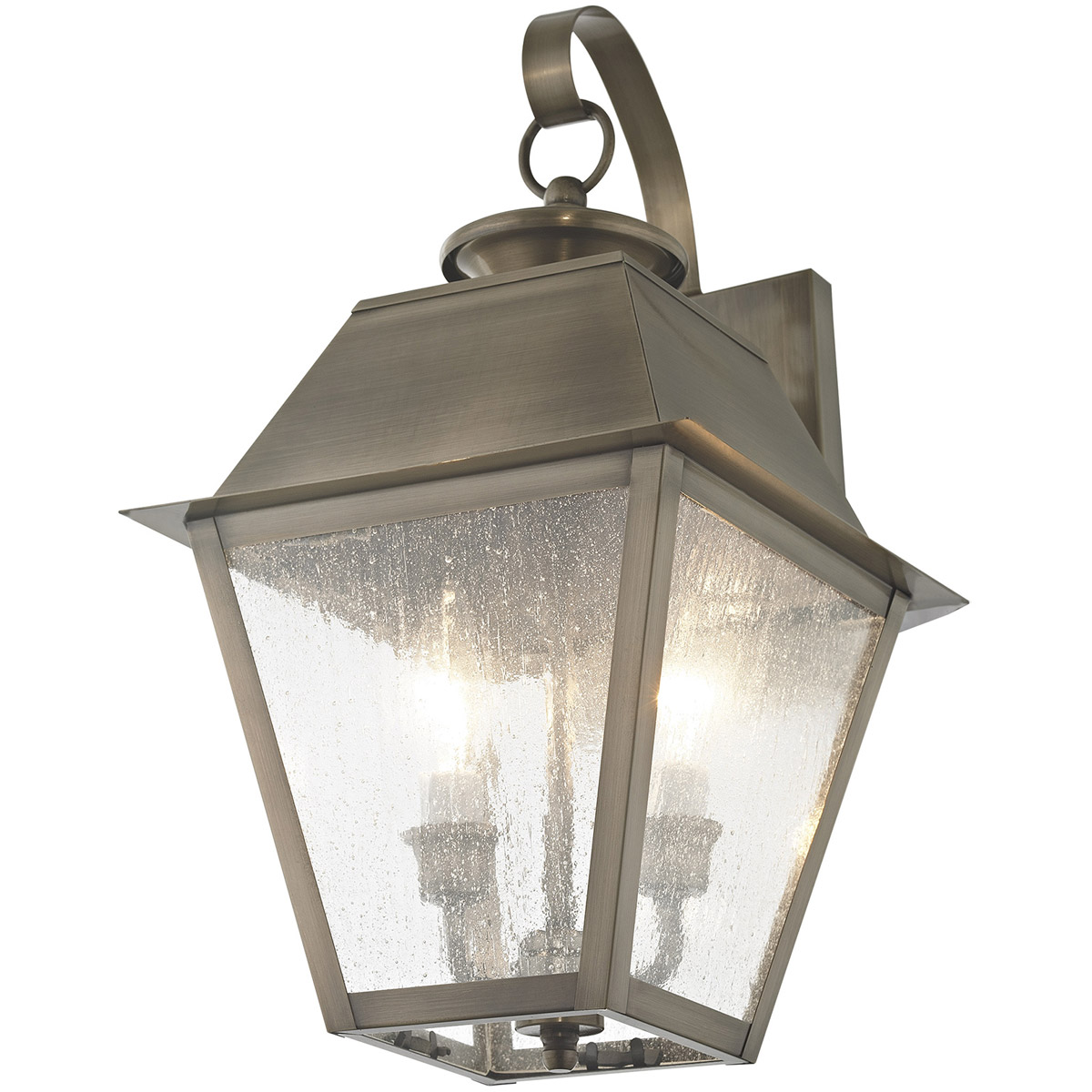 With stunning seeded glass and a vintage pewter finish, this outdoor wall lantern will make an elegant addition to any outdoor space. Formed from solid brass & traditionally-inspired, this downward hanging outdoor wall lantern is perfect for a driveway, back porch or entry way.