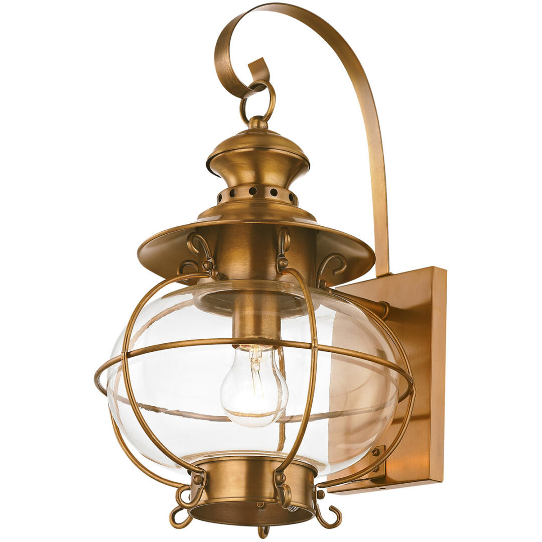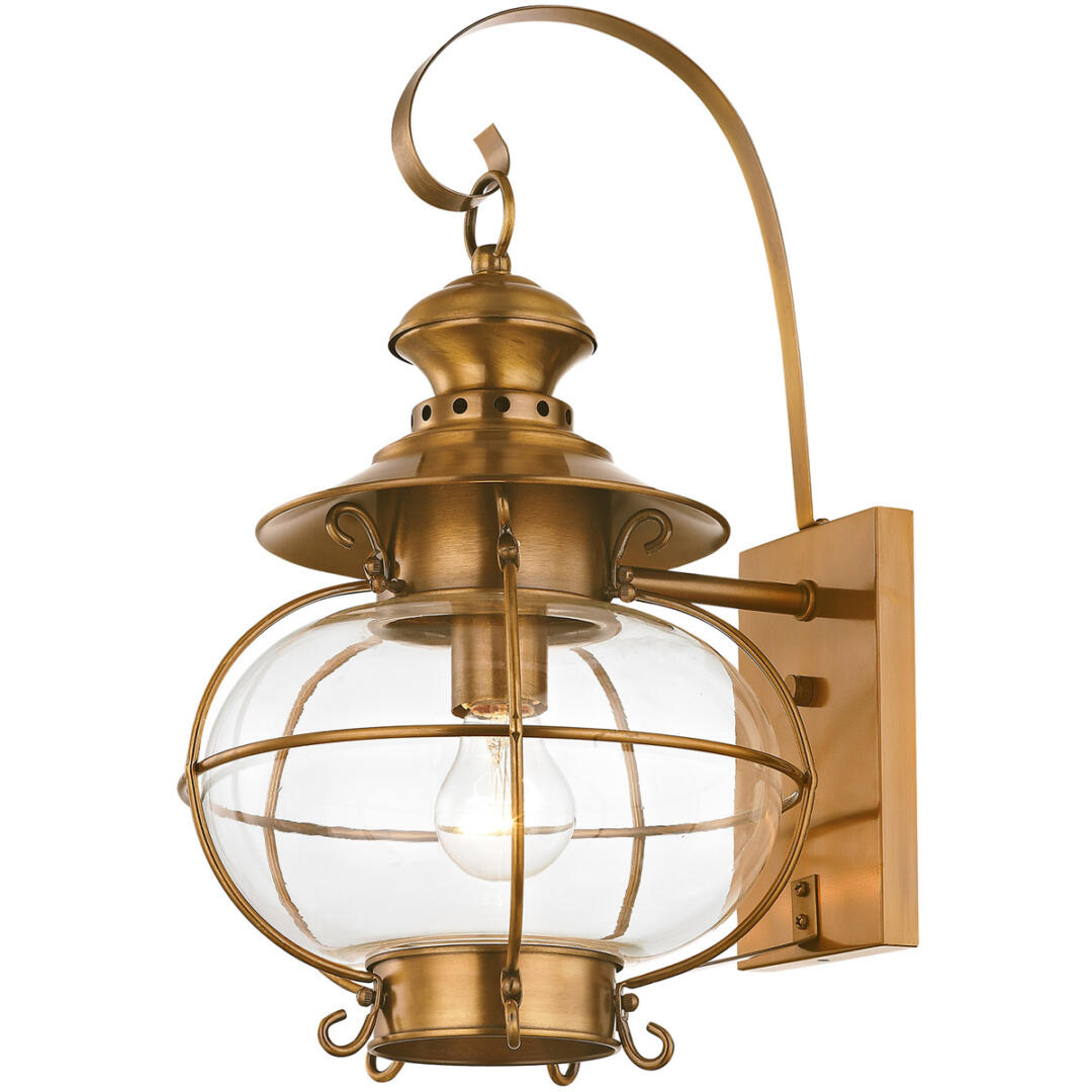 Accent your outdoor decor with this beautiful lantern from the Harbor collection. Inspired by early lighting designs from port towns, this charming outdoor wall lantern features a solid brass construction in a Flemish brass finish, while hand blown clear glass provides a gentle diffusion.
