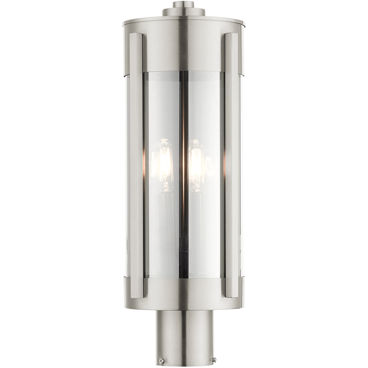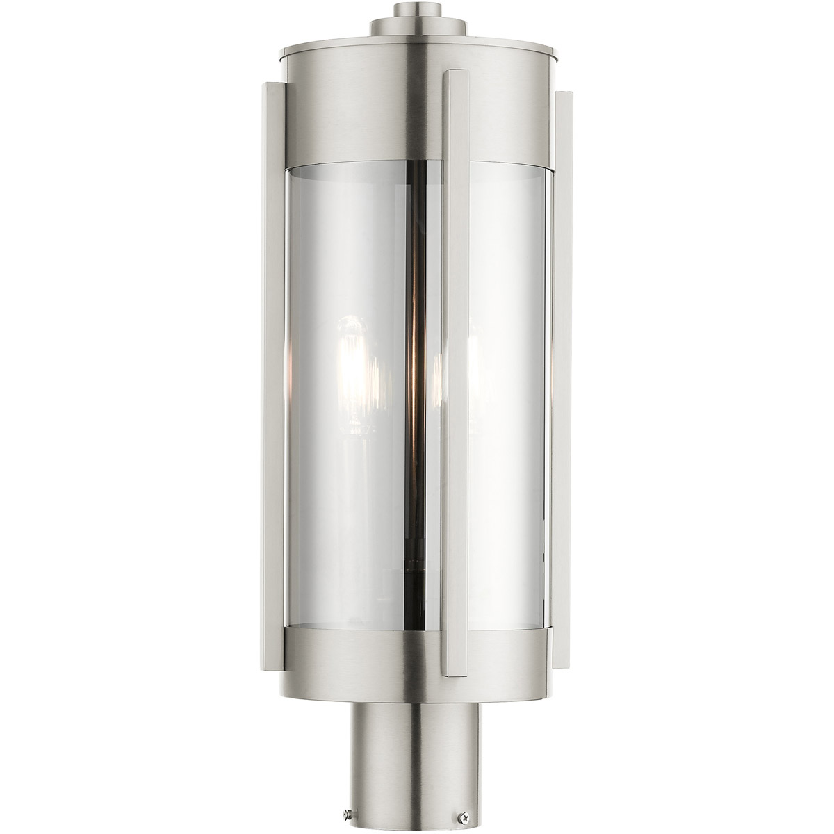 The Sheridan outdoor collection has a clean, crisp look and contemporary appeal. This two-light stainless steel medium post top lantern has a brushed nickel finish and features electrical plated smoke glass.