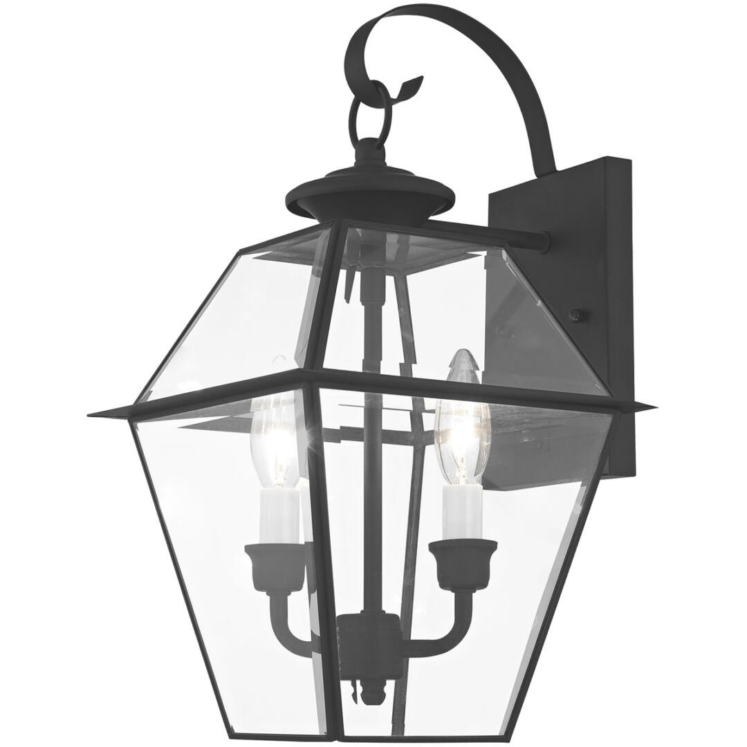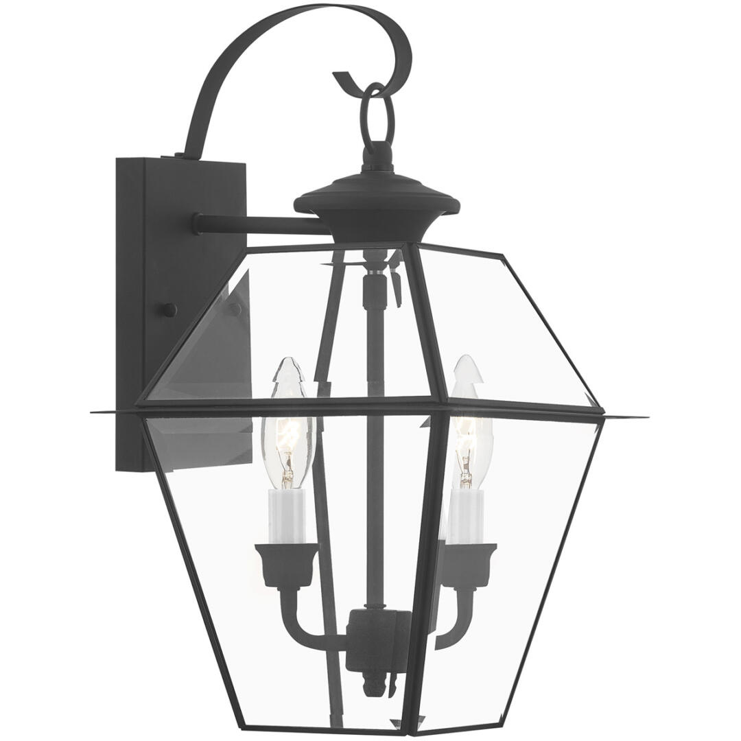 Inspired by the historic look and romantic feel of gas-burning lamps, the Westover collection is reminiscent of antique gas lights still popular in Southern cities like Charleston and New Orleans. This solid brass piece features two lights behind large panes of clear beveled glass.