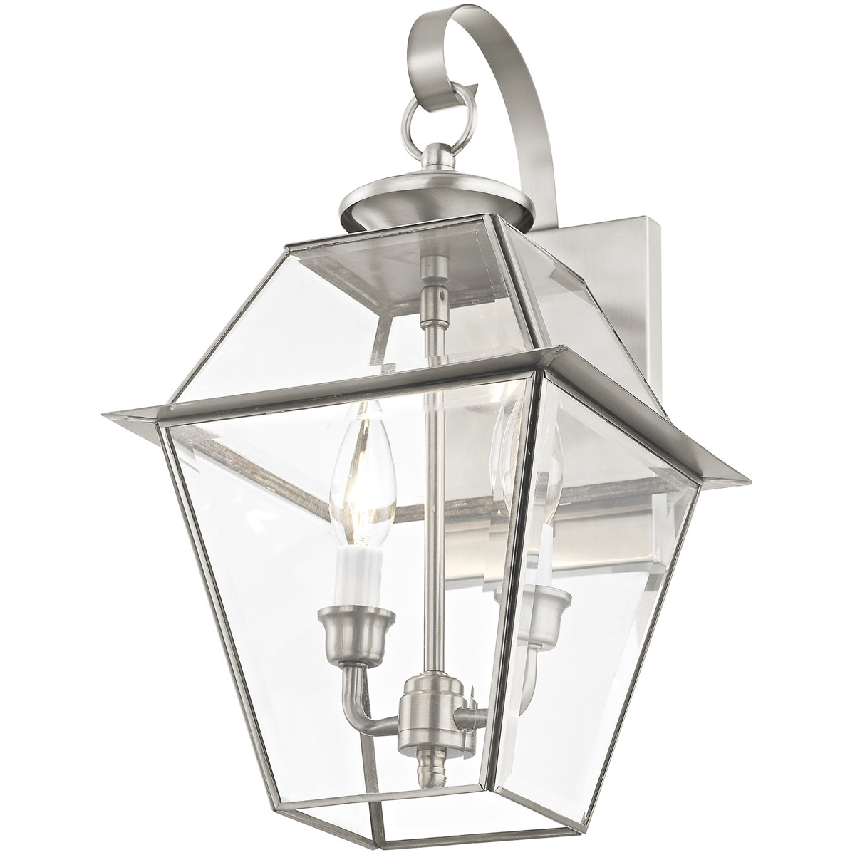 Inspired by the historic look and romantic feel of gas-burning lamps, the Westover collection is reminiscent of antique gas lights still popular in Southern cities like Charleston and New Orleans. This solid brass piece features two lights behind large panes of clear beveled glass.