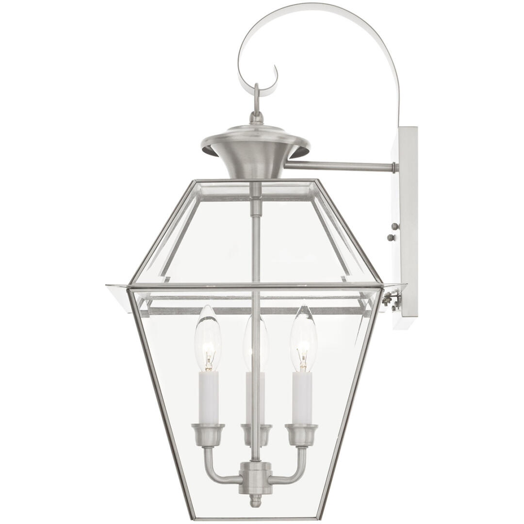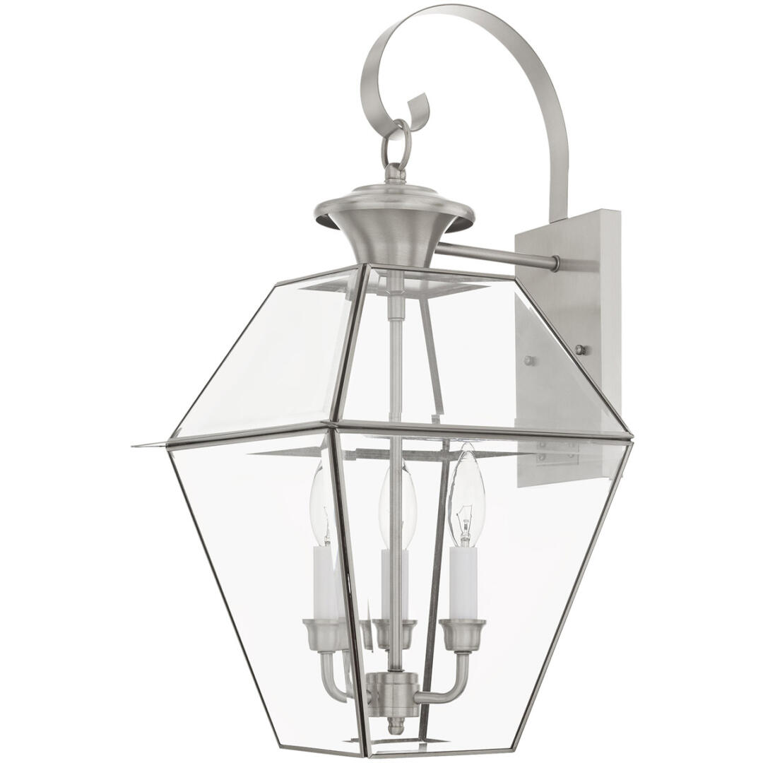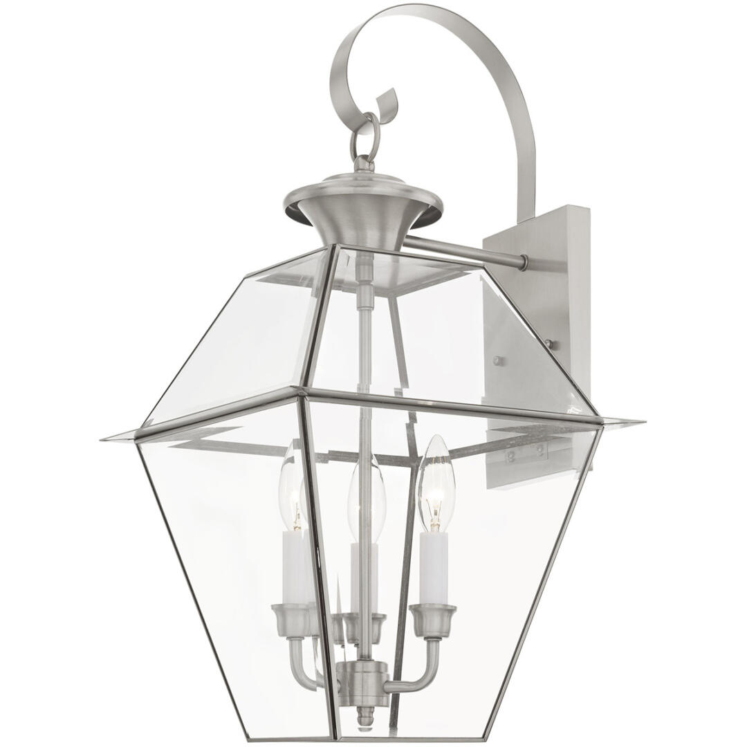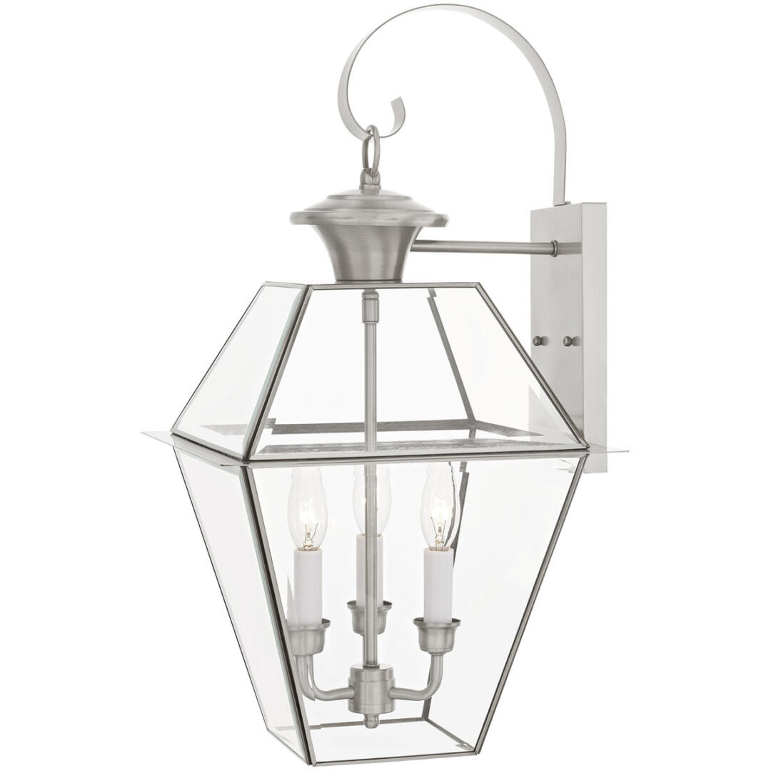 Inspired by the historic look and romantic feel of gas-burning lamps, the Westover collection is reminiscent of antique gas lights still popular in Southern cities like Charleston and New Orleans. This solid brass piece features three lights behind large panes of clear beveled glass.