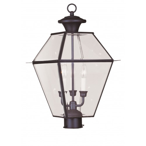 Inspired by the historic look and romantic feel of gas-burning lamps, the Westover collection is reminiscent of antique gas lights still popular in Southern cities like Charleston and New Orleans. This solid brass piece features three lights behind large panes of clear beveled glass.