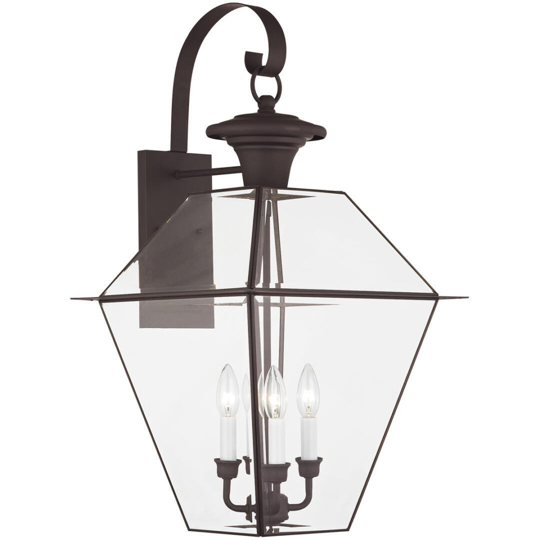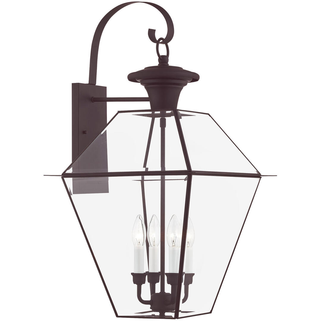 Inspired by the historic look and romantic feel of gas-burning lamps, the Westover collection is reminiscent of antique gas lights still popular in Southern cities like Charleston and New Orleans. This solid brass piece features four lights behind large panes of clear beveled glass.