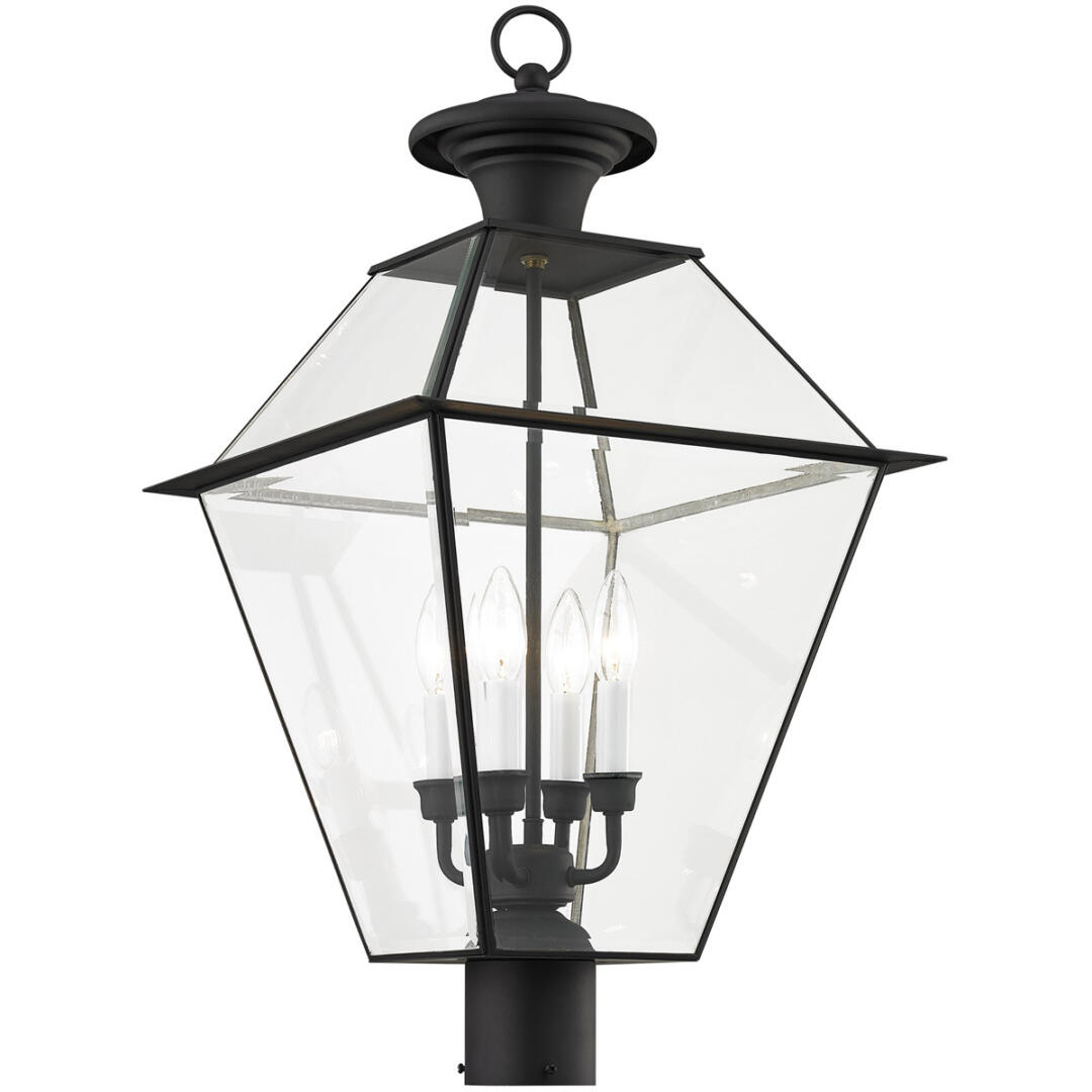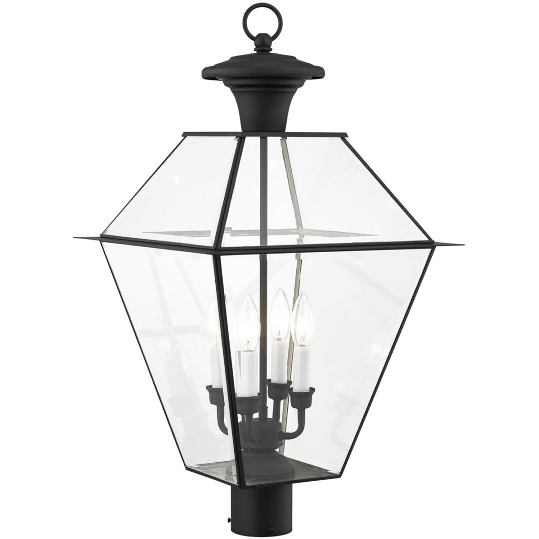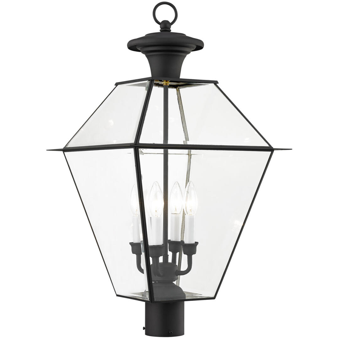 Inspired by the historic look and romantic feel of gas-burning lamps, the Westover collection is reminiscent of antique gas lights still popular in Southern cities like Charleston and New Orleans. This solid brass piece features four lights behind large panes of clear beveled glass.