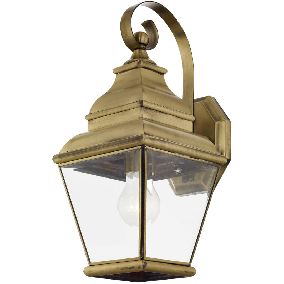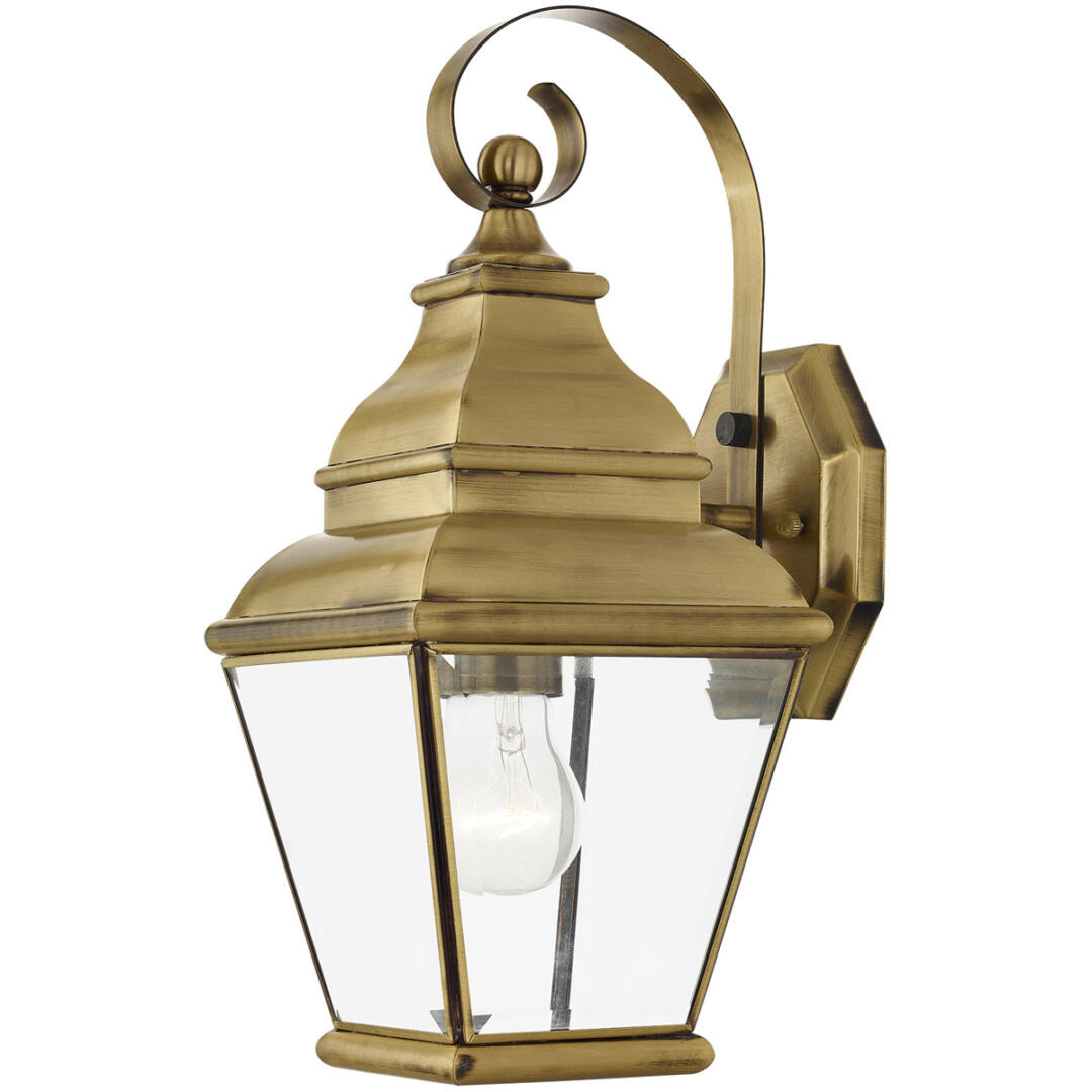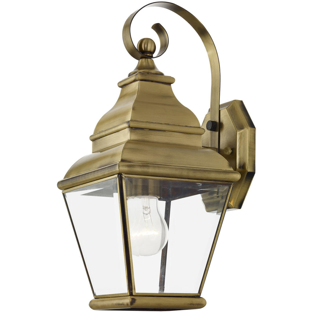 Finished in antique brass with clear beveled glass, this outdoor wall lantern offers plenty of stylish illumination for your home’s exterior.