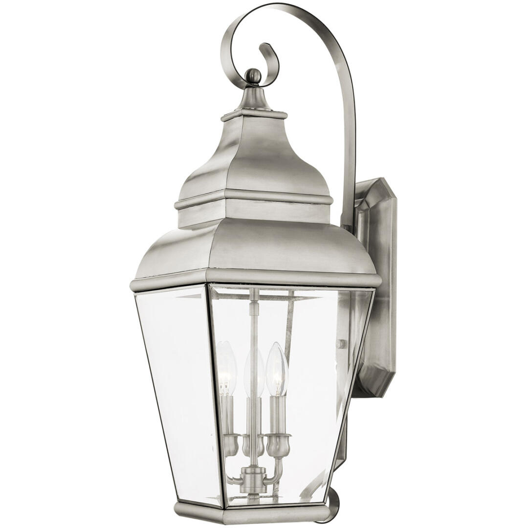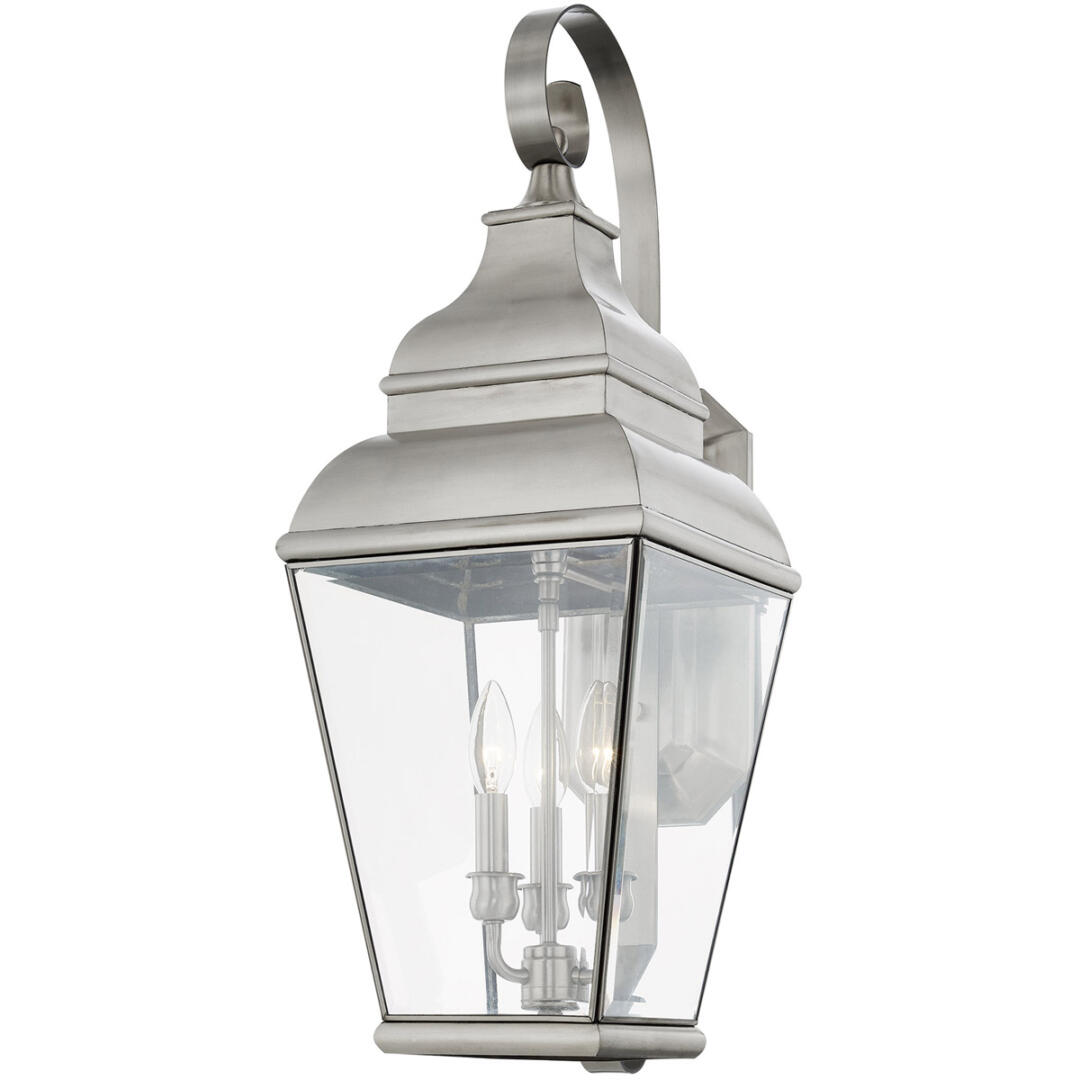 Finished in brushed nickel with clear beveled glass, this outdoor wall lantern offers plenty of stylish illumination for your home’s exterior.