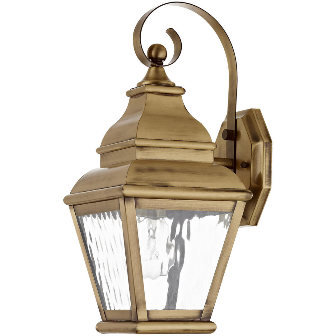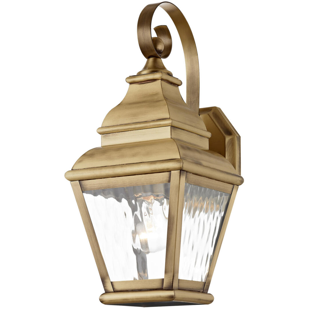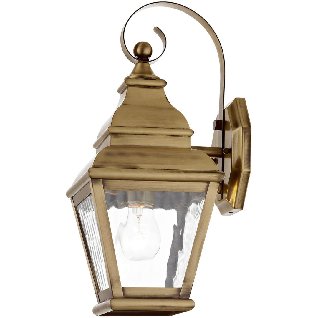 Finished in antique brass with clear water glass, this outdoor wall lantern offers plenty of stylish illumination for your home’s exterior.