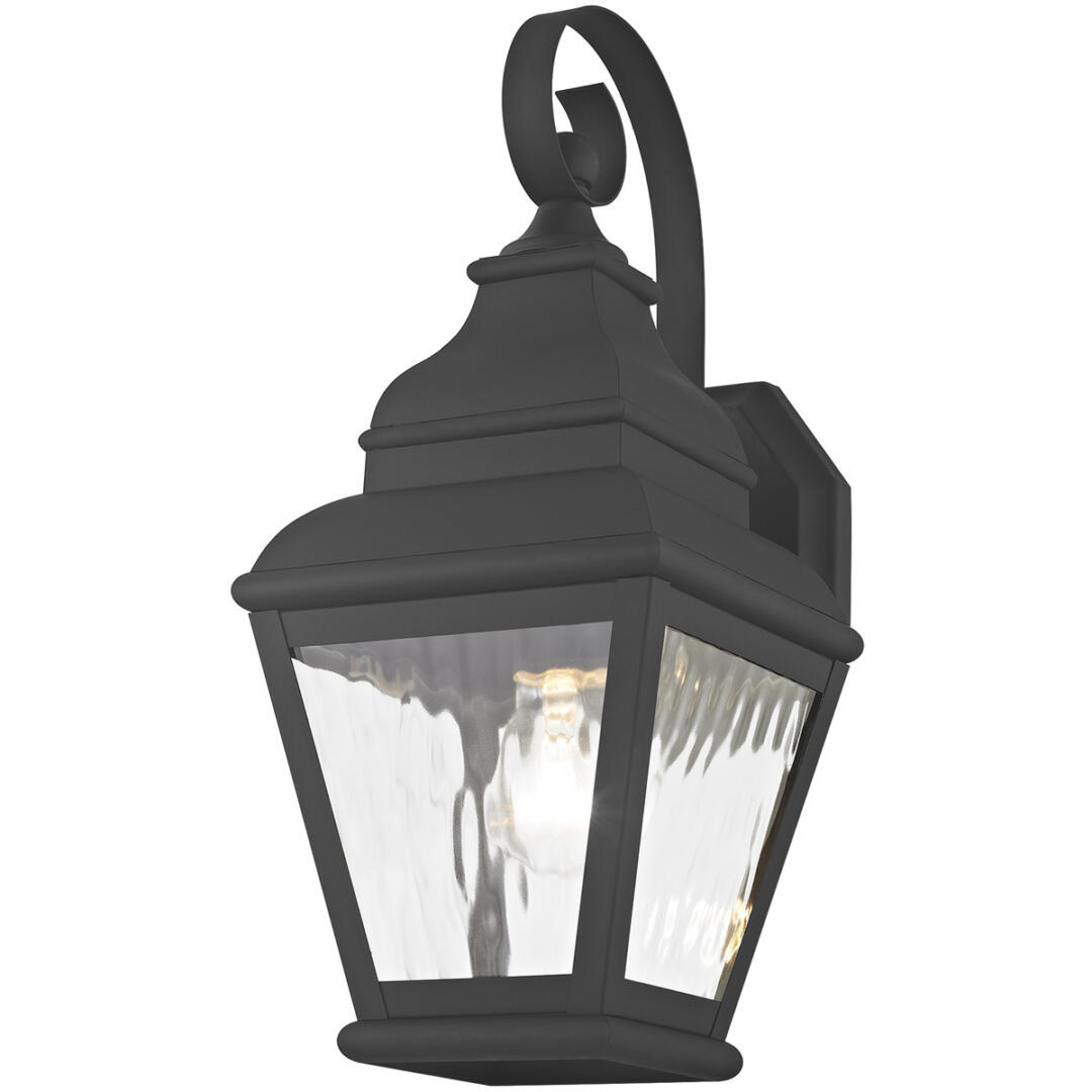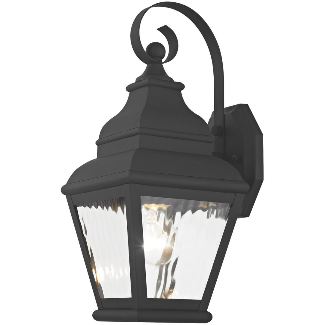 Finished in black with clear water glass, this outdoor wall lantern offers plenty of stylish illumination for your home’s exterior.