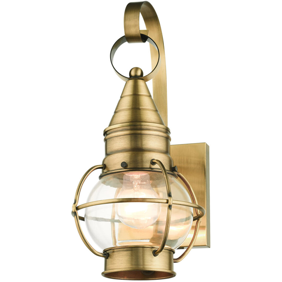 The Newburyport outdoor small single-light wall lantern boasts classic nautical and railway styling. This piece features a beautiful hand-blown clear glass globe and an antique brass finish over the hand crafted solid brass construction. With its easy installation and low upkeep requirements, this light will not disappoint.