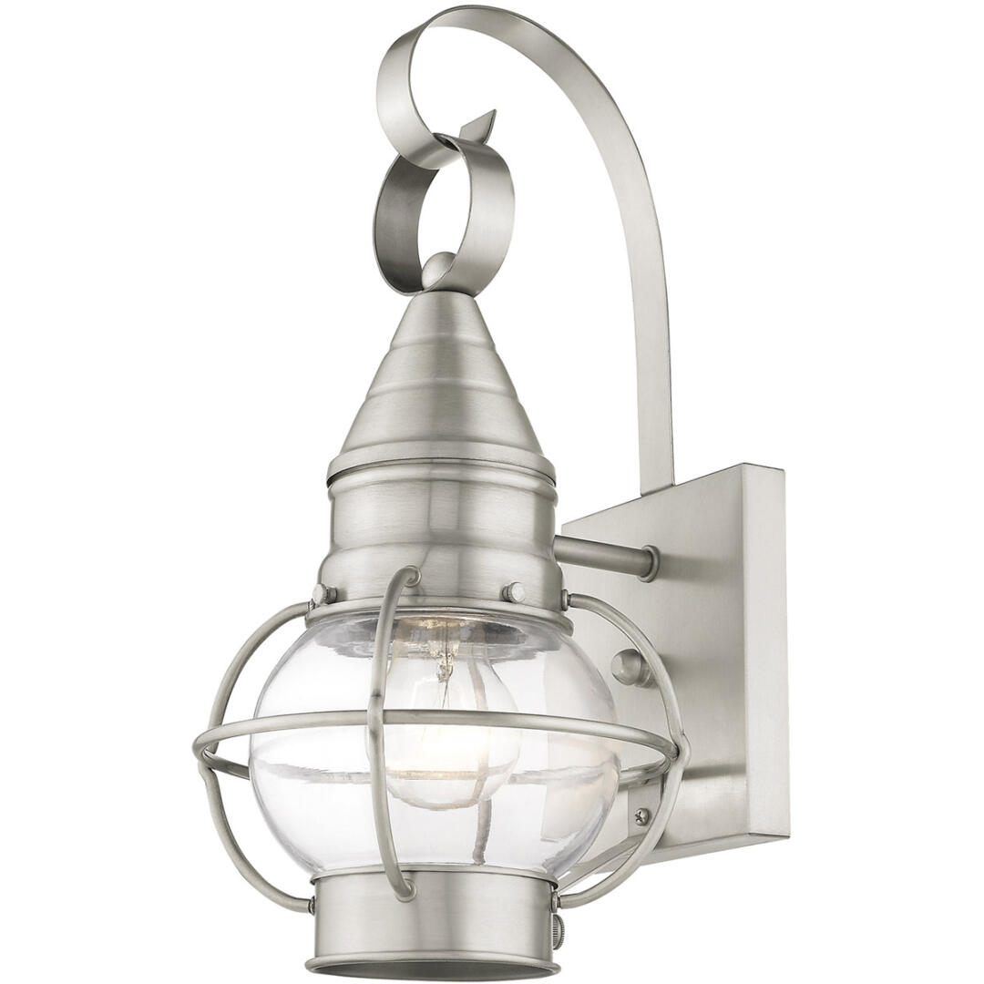 The Newburyport outdoor wall lantern boasts classic nautical and railway styling with a beautiful hand blown clear glass globe and a brushed nickel finish over the solid brass construction.