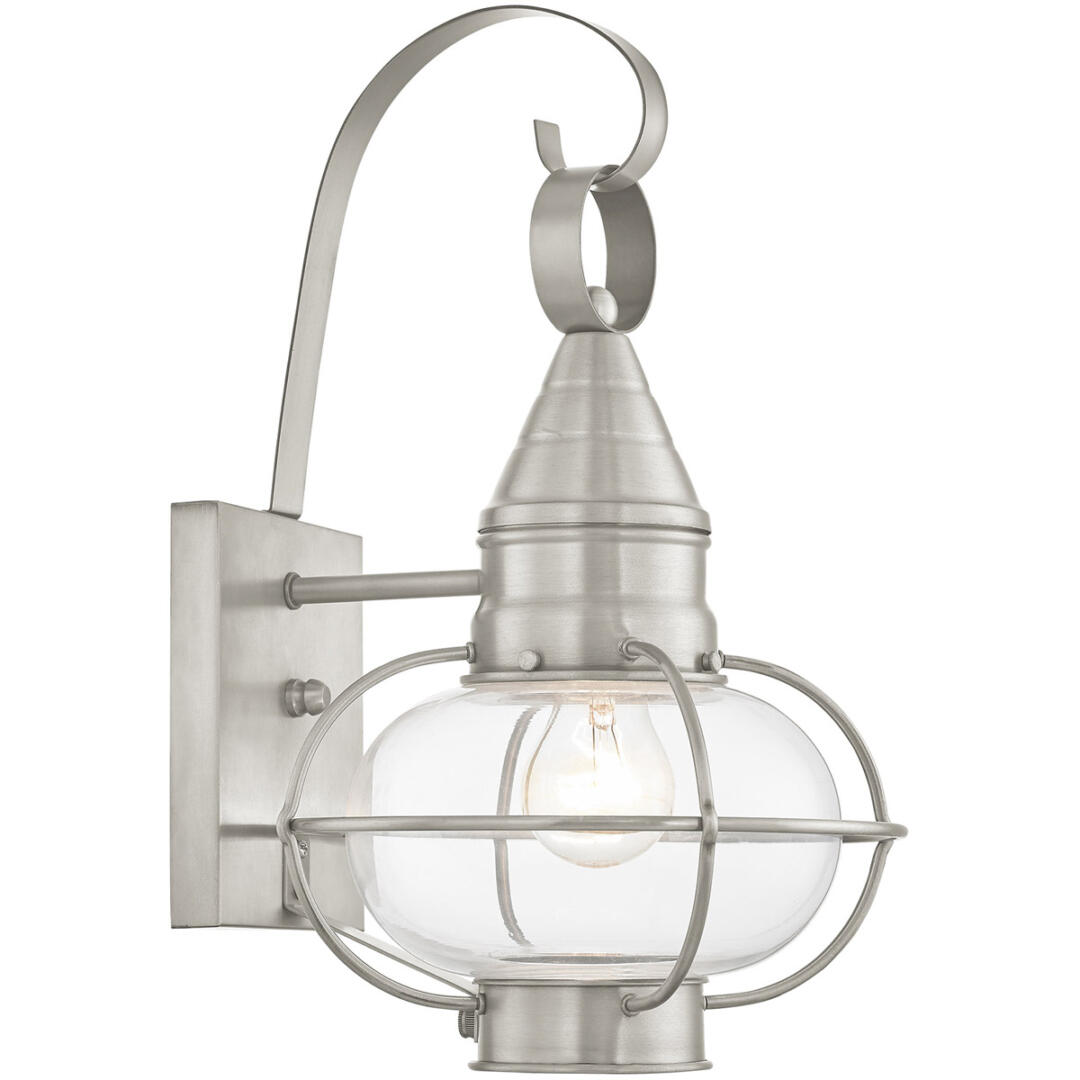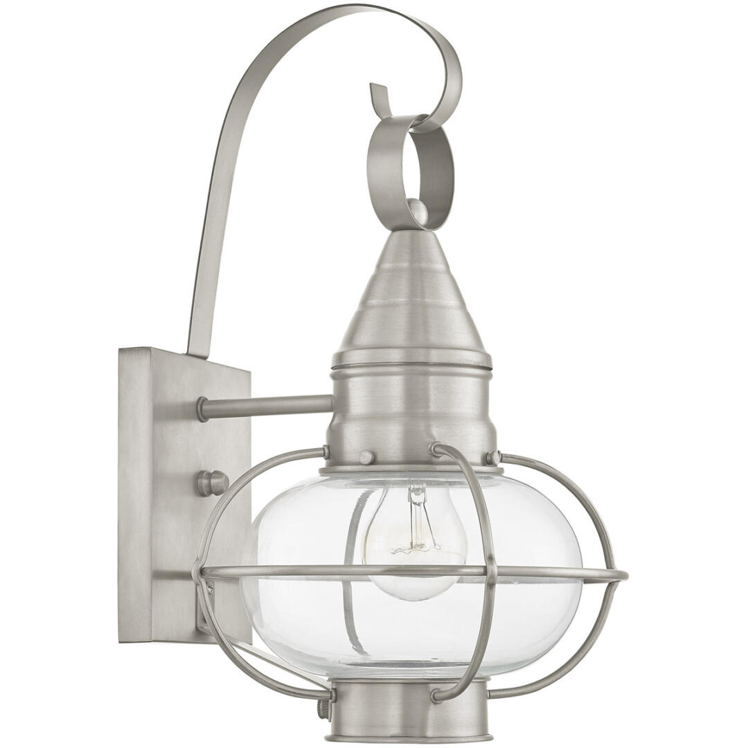 The Newburyport outdoor wall lantern boasts classic nautical and railway styling with a beautiful hand blown clear glass globe and a brushed nickel finish over the solid brass construction.