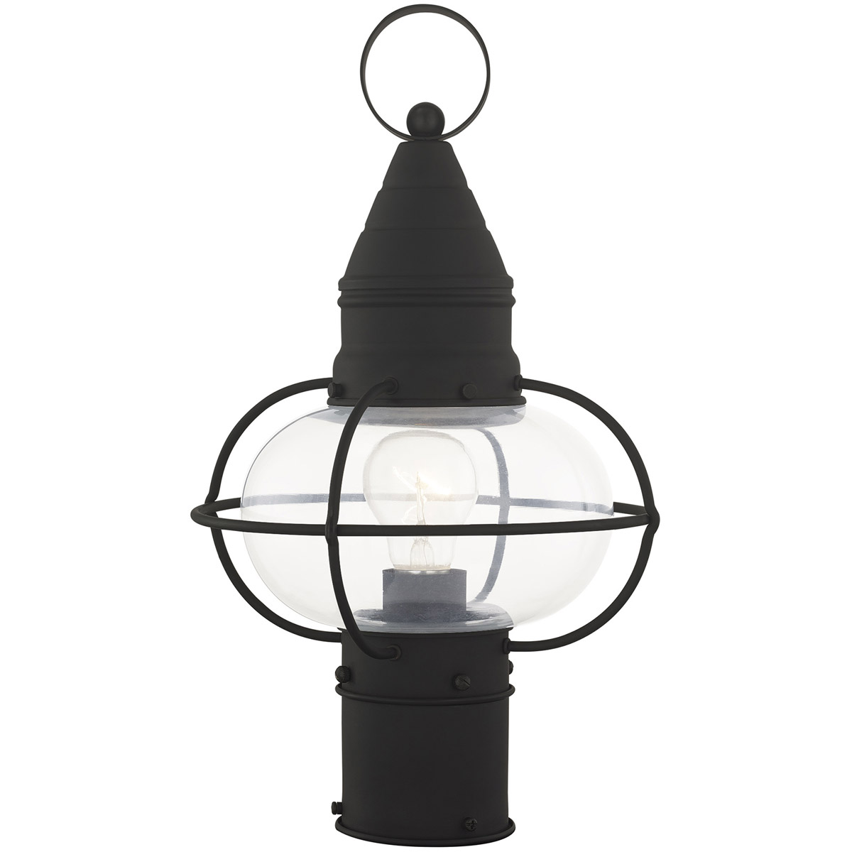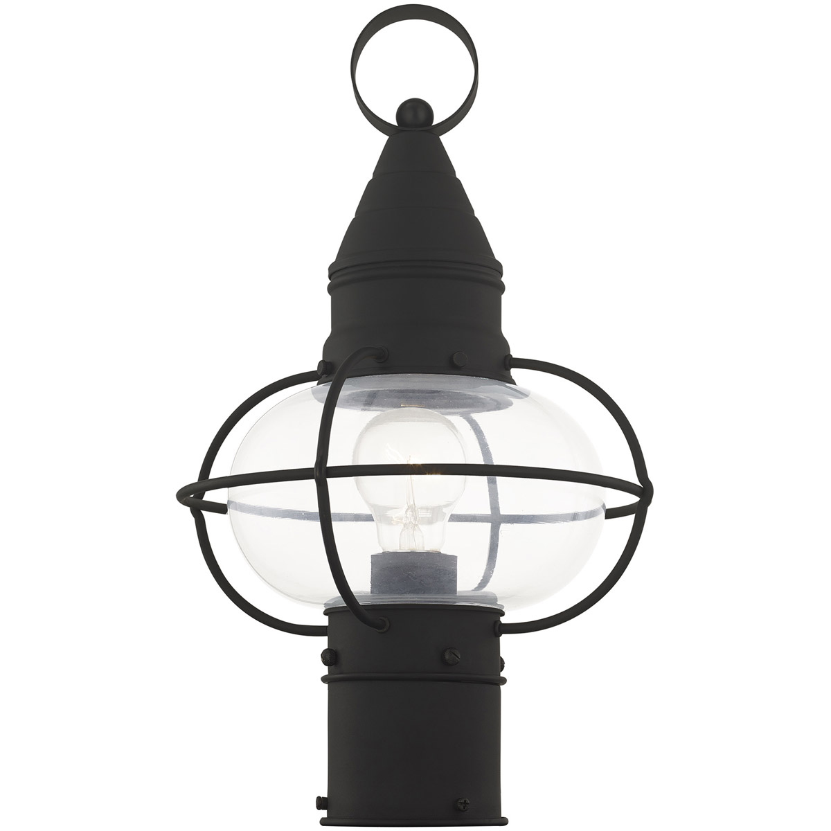 The Newburyport outdoor post lantern boasts classic nautical and railway styling with a beautiful hand blown clear glass globe and a black finish over the solid brass construction.