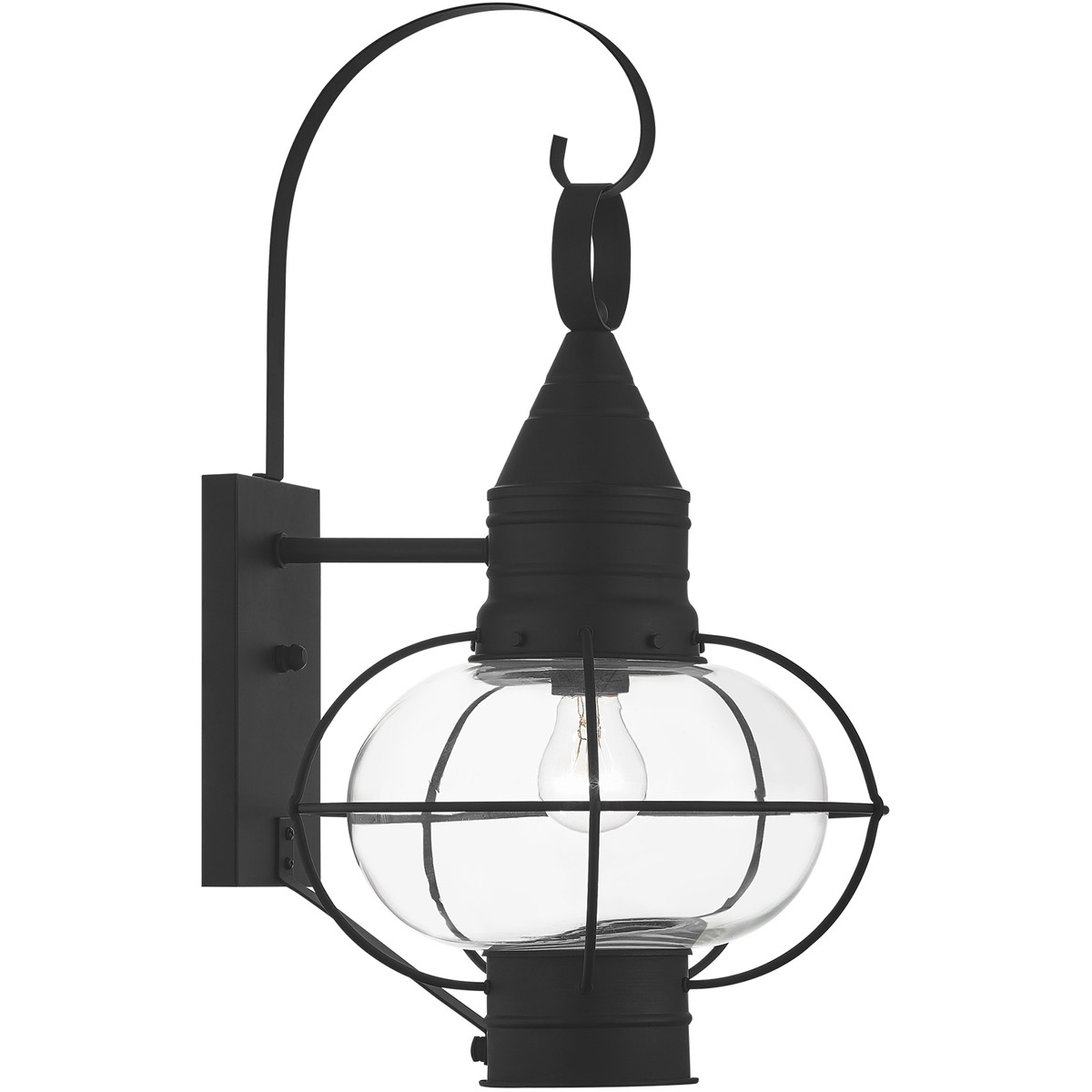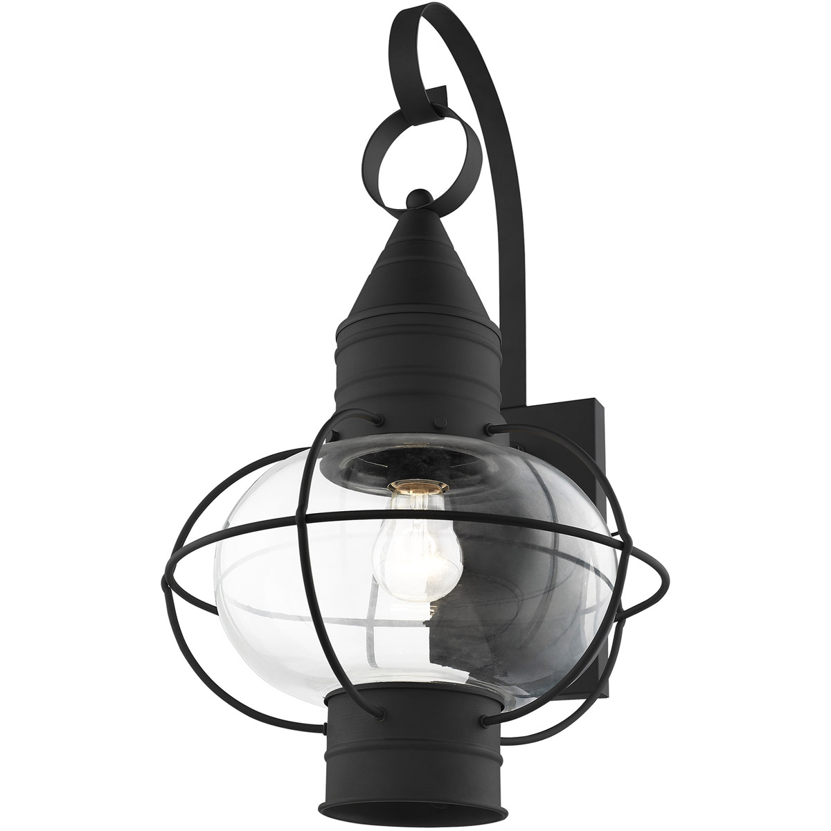 The Newburyport outdoor wall lantern boasts classic nautical and railway styling with a beautiful hand blown clear glass globe and a black finish over the solid brass construction.