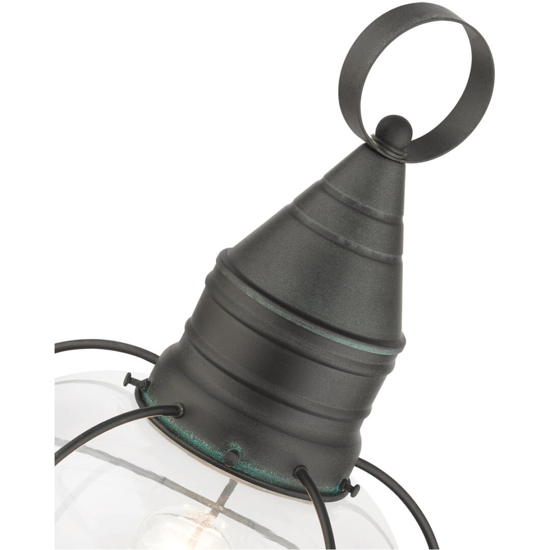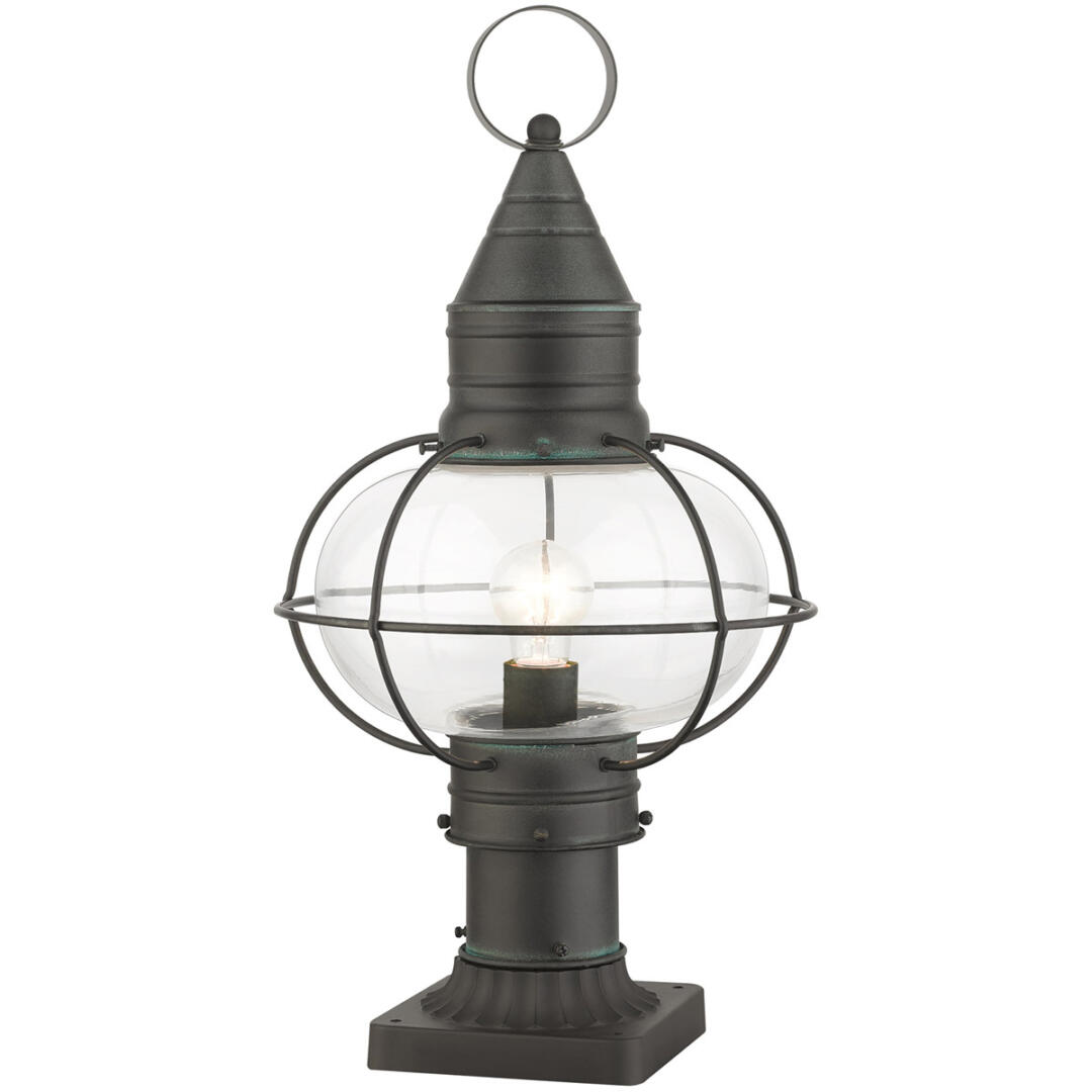 The Newburyport outdoor large single-light post top lantern boasts classic nautical and railway styling. This piece features a beautiful hand-blown clear glass globe and a charcoal finish over the hand crafted solid brass construction. With its easy installation and low upkeep requirements, this light will not disappoint.