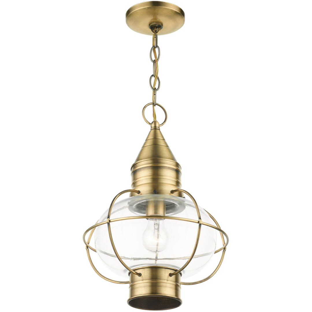 The Newburyport outdoor large single-light pendant lantern boasts classic nautical and railway styling. This piece features a beautiful hand-blown clear glass globe and an antique brass finish over the hand crafted solid brass construction. With its easy installation and low upkeep requirements, this light will not disappoint.